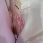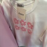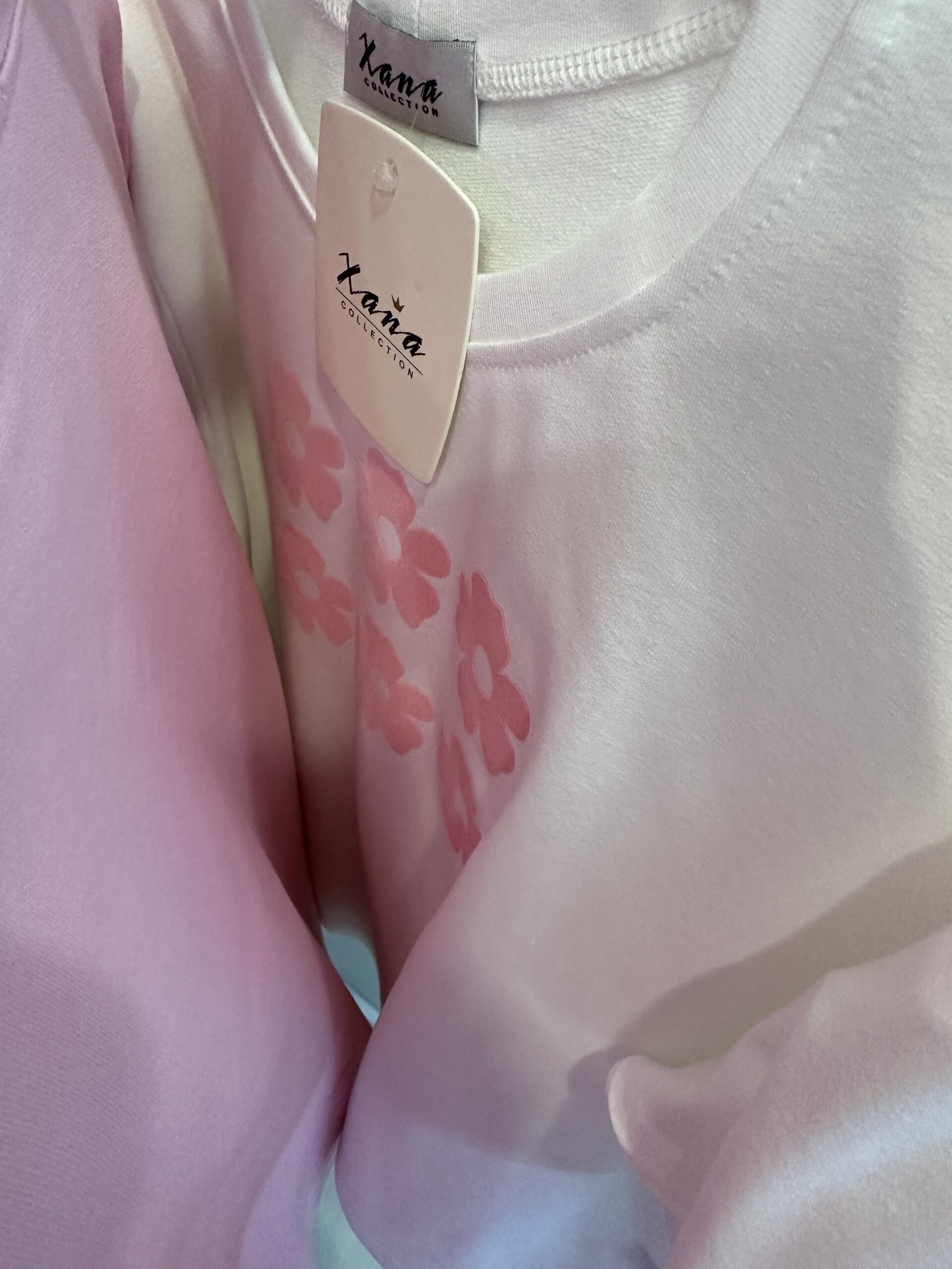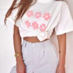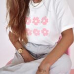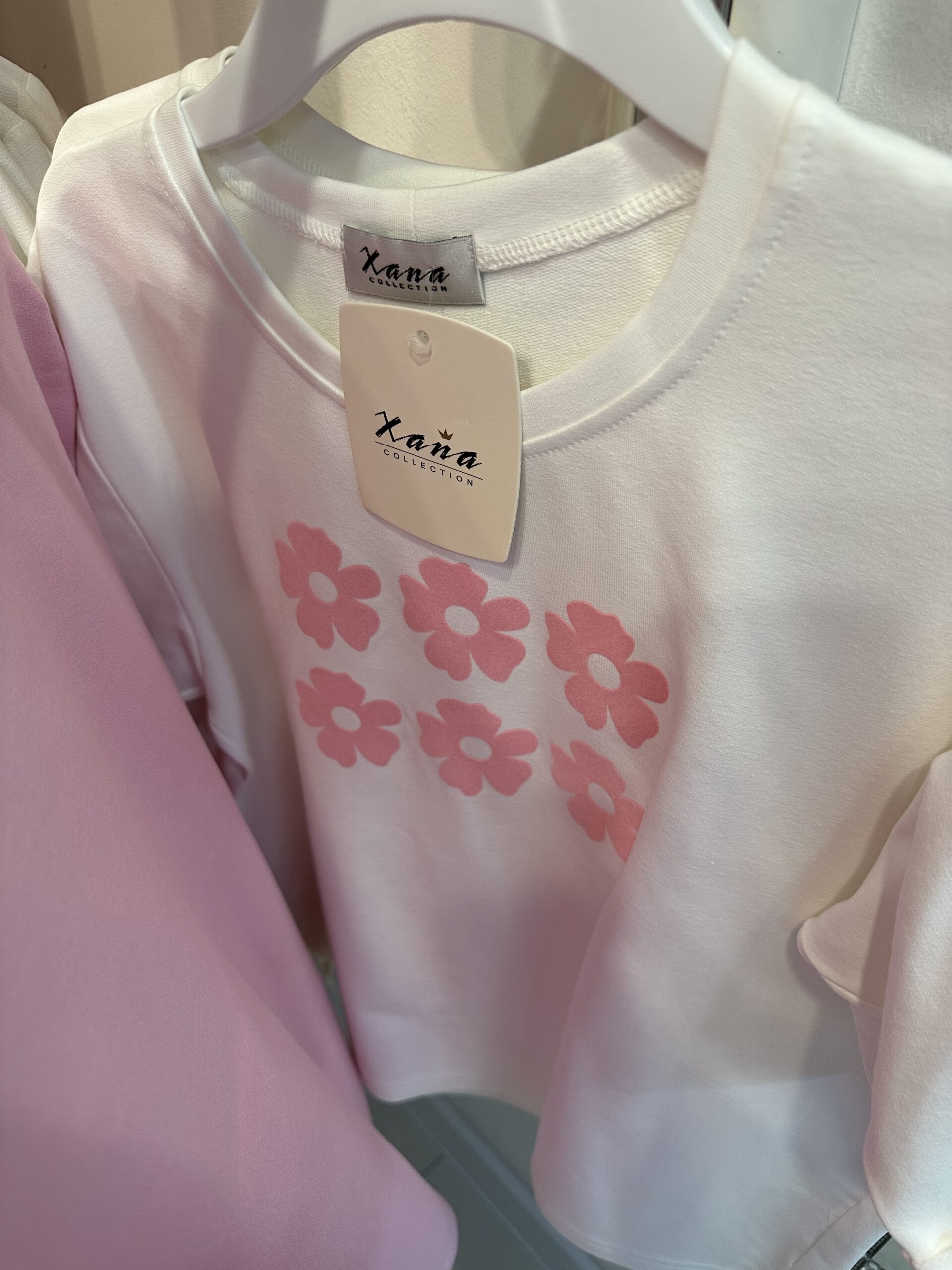 Bluzka ALLENE z krótkim rękawem, kolor biały, dekolt klasyczny, pod szyję. Rękaw jest wywinięty, szerszy. Po bokach są około 3-centymetrowe rozcięcia zapewniające komfort noszenia. Bluzka posiada na przodzie zdobienie w postaci sześciu kwiatuszków wypukłych, lekko gumowanych koloru różowego. Środki kwiatuszków są w kolorze bluzki. Bluzka uszyta jest z bardzo miłego w dotyku materiału – bawełny, jest nie gryząca, poddaje się i dopasowuje do sylwetki. Krój ma prosty. Bluzkę można połączyć ze spodniami dresowymi, jeansami, spódnicami, szortami. Bluzka do noszenia na co dzień, pod sweter lub kardigan, kurtkę jeansową, żakiet. Jakość PREMIUM.