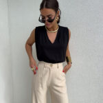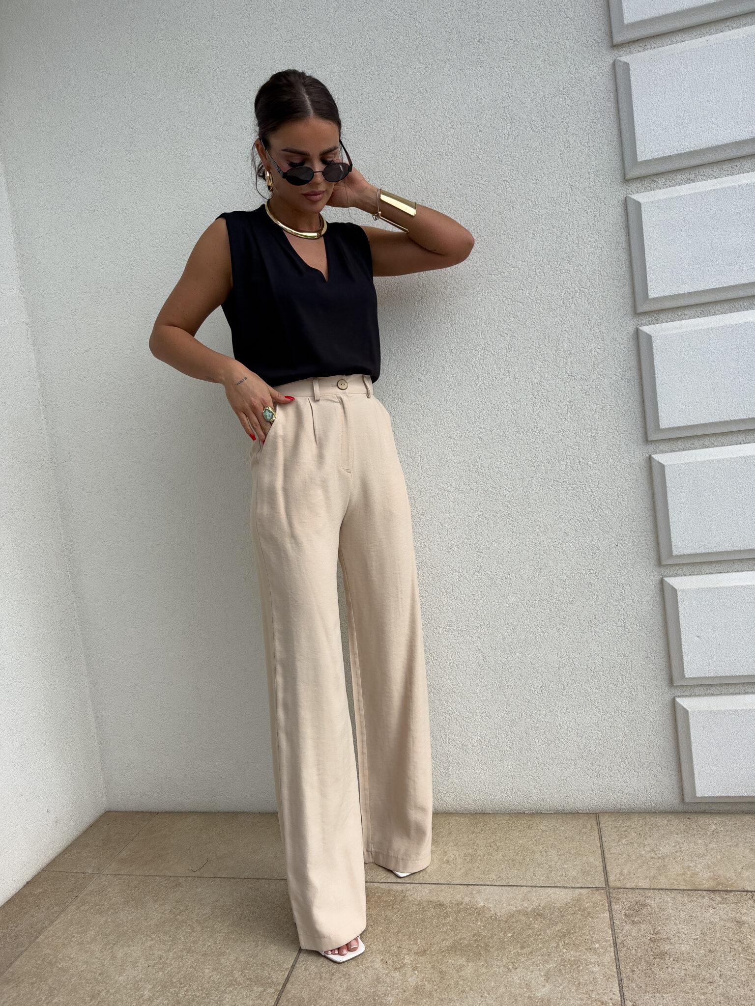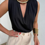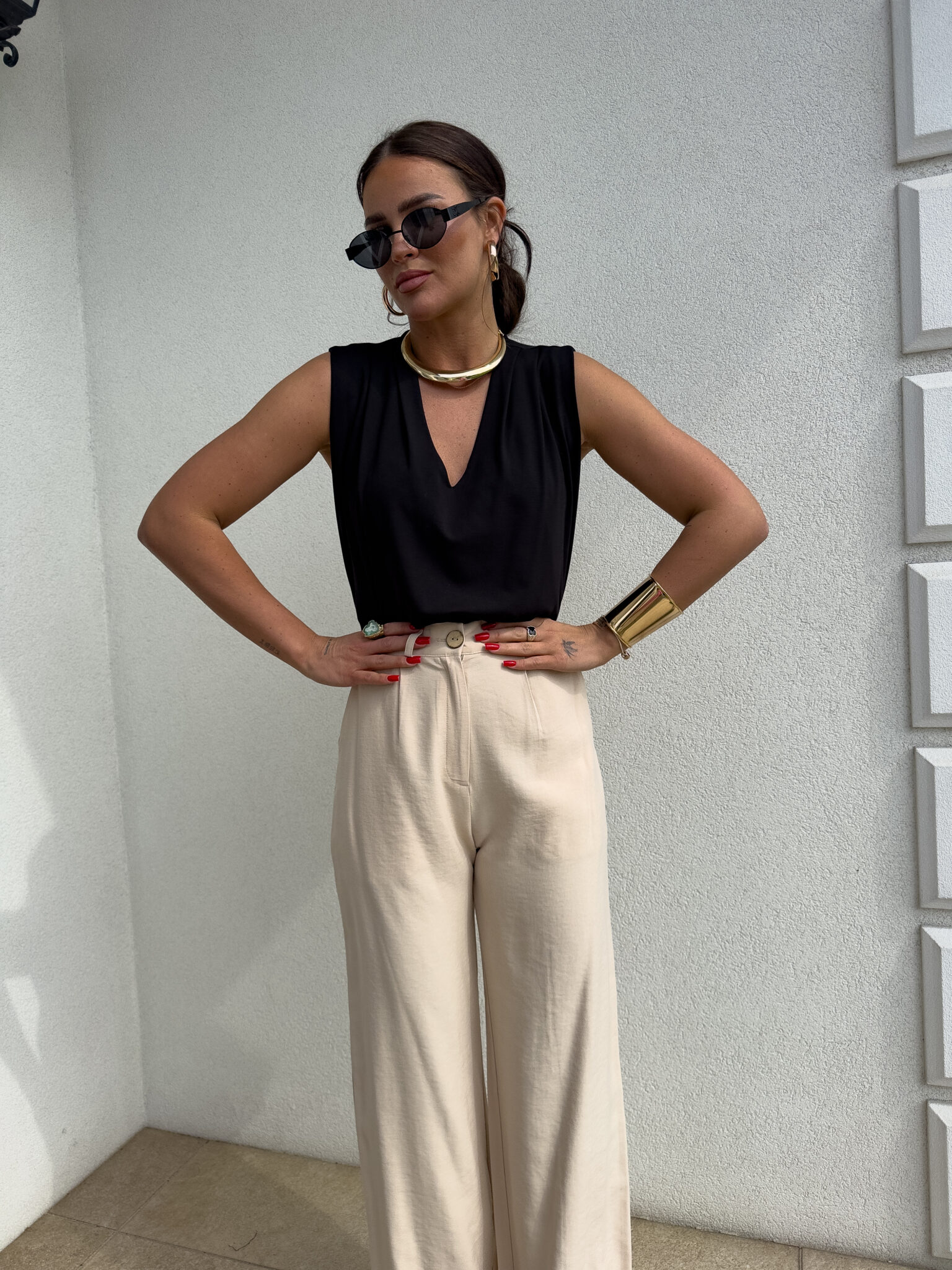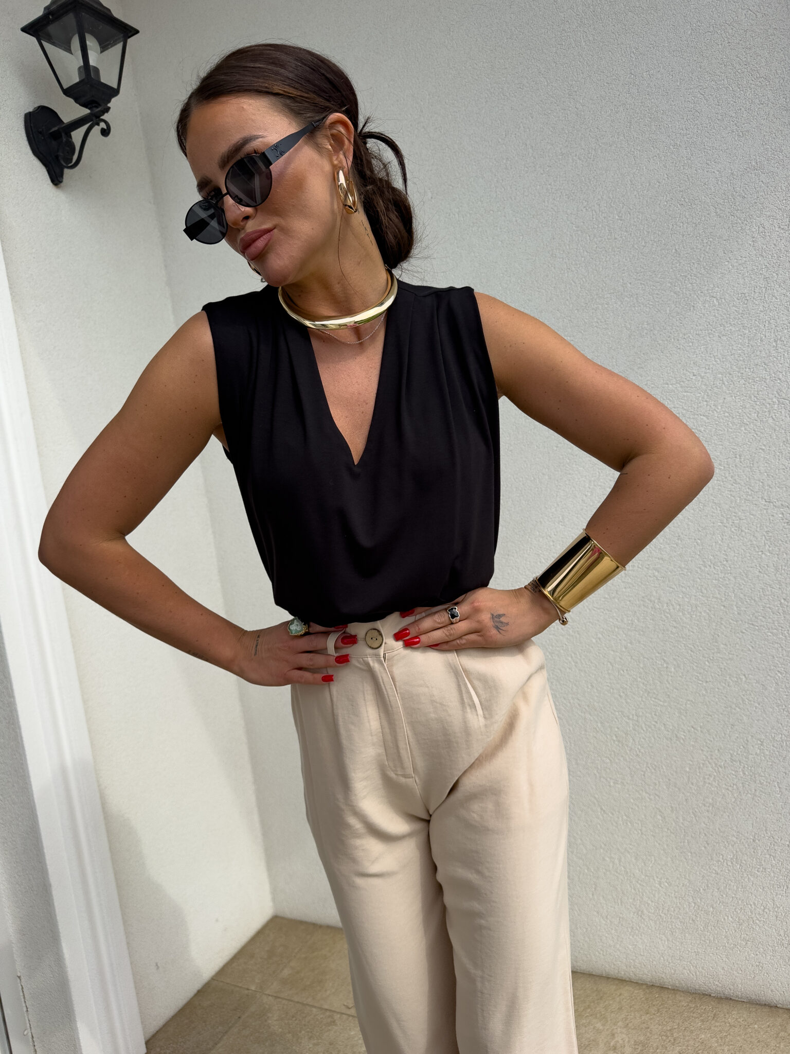 Bluzka bez rękawów wykonana z podwójnej warstwy przyjemnego w dotyku materiału. Klasyczny dekolt w kształcie litery V subtelnie podkreśla szyję i obojczyki. Luźniejszy, delikatnie marszczony przód dodaje lekkości i swobody sylwetce.