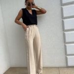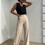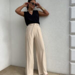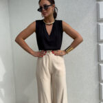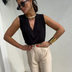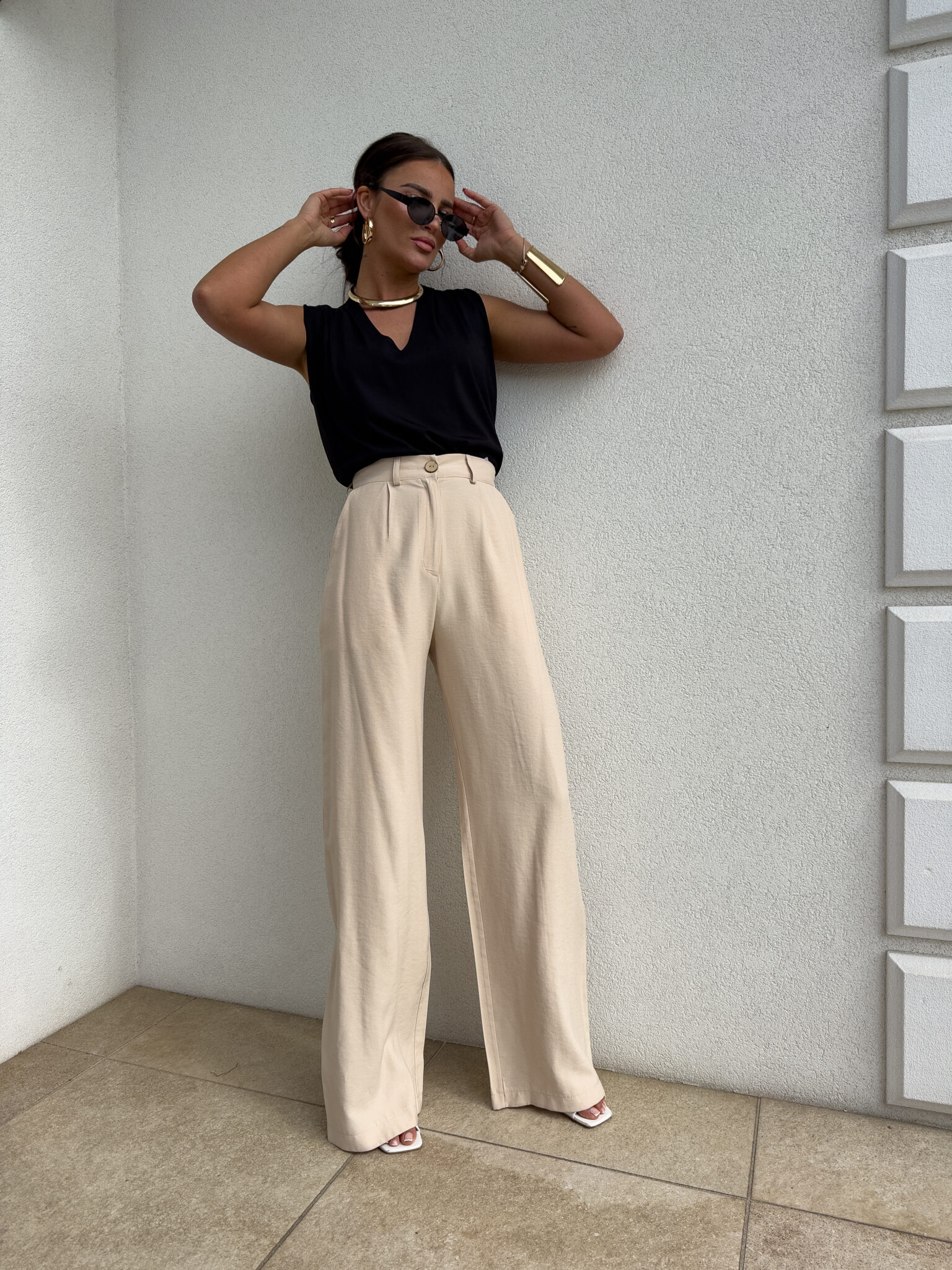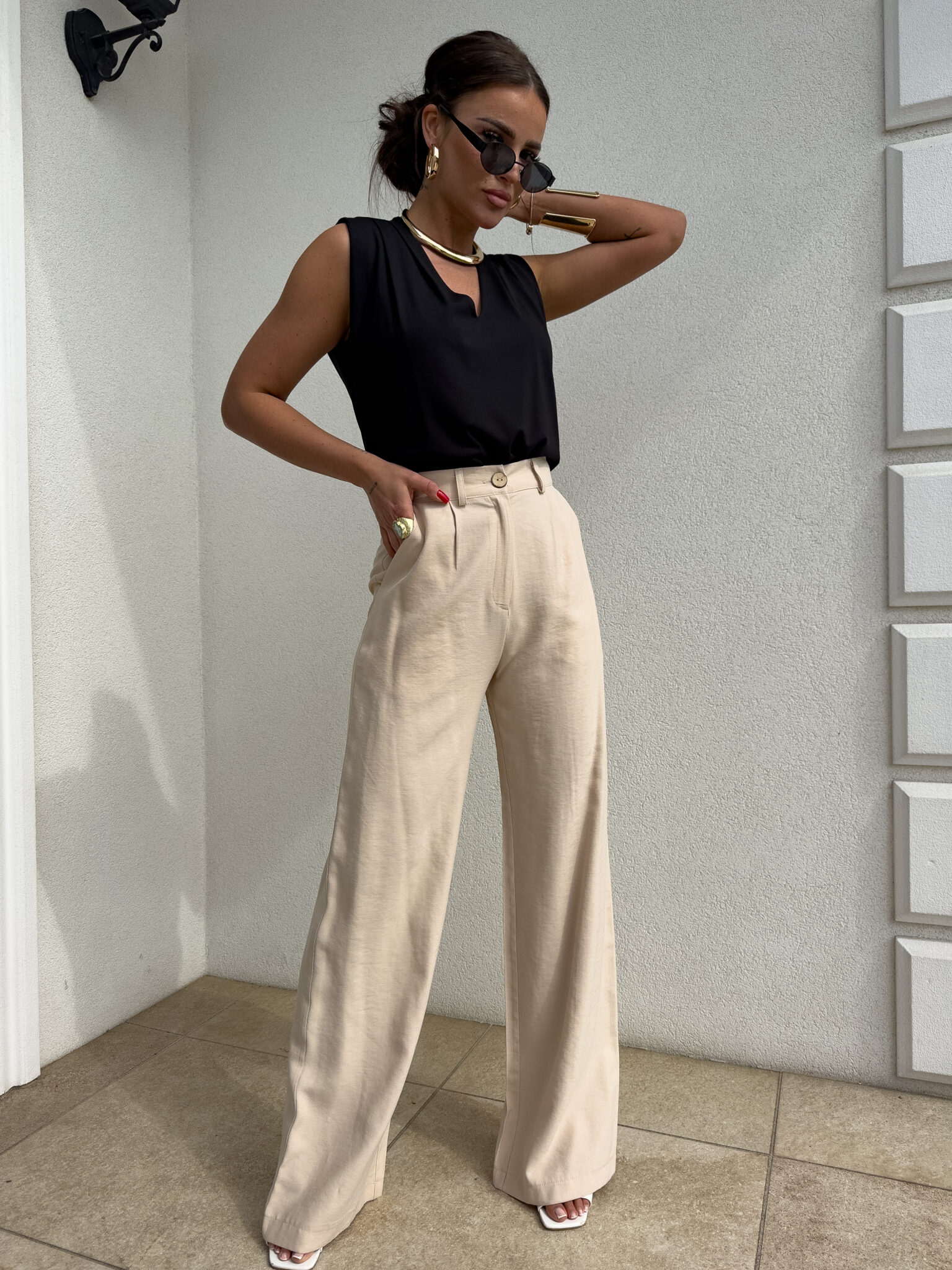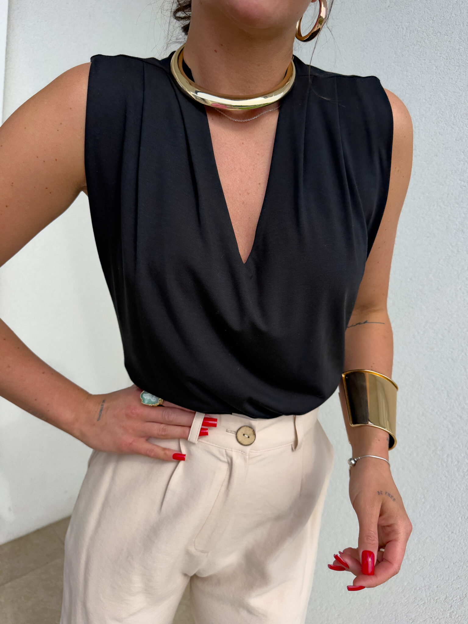 Bluzka bez rękawów wykonana z podwójnej warstwy przyjemnego w dotyku materiału. Klasyczny dekolt w kształcie litery V subtelnie podkreśla szyję i obojczyki. Luźniejszy, delikatnie marszczony przód dodaje lekkości i swobody sylwetce.