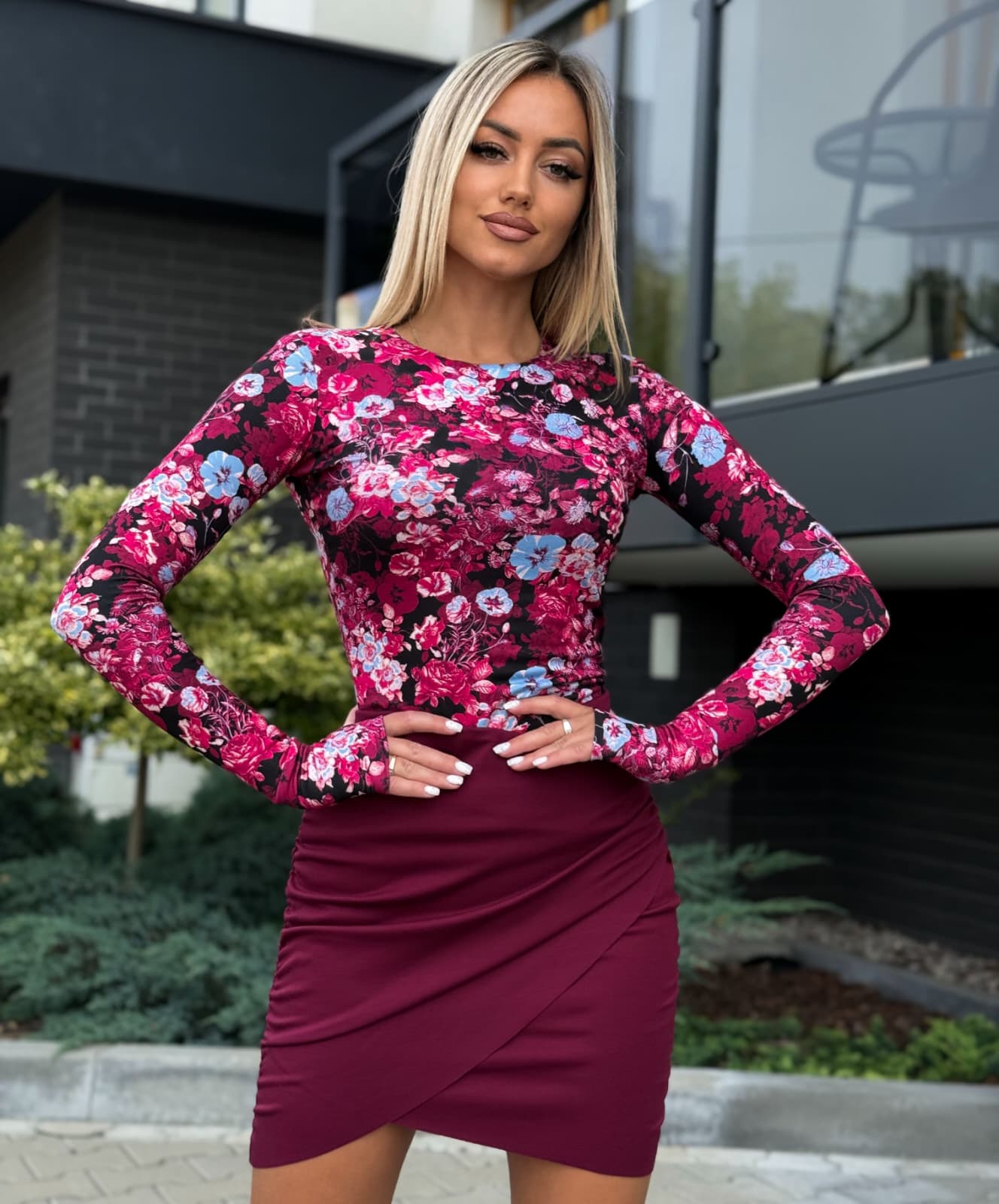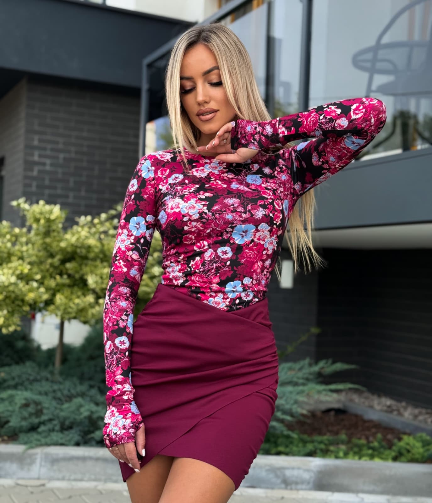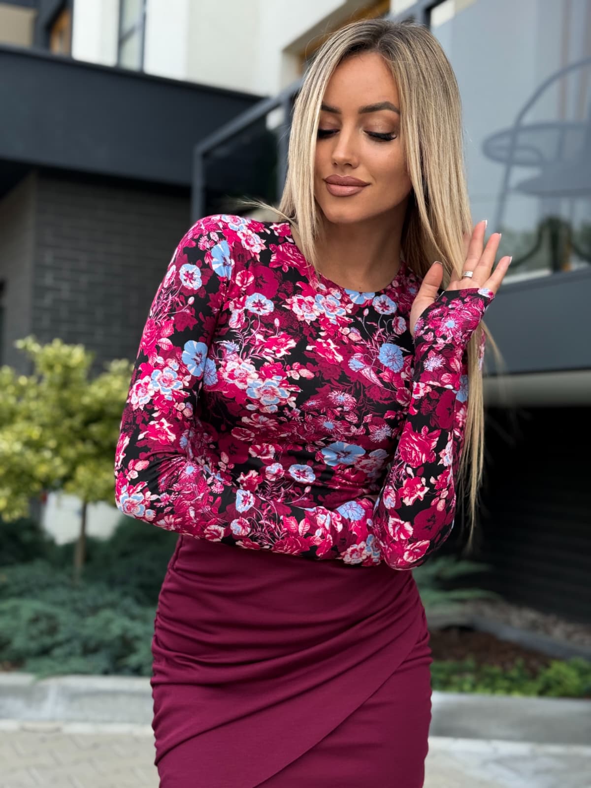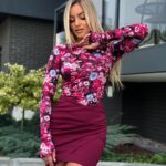 Bluzka CYNTHIA z dziurką na kciuk – bordowe kwiaty
