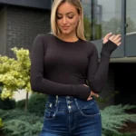 Stylowa, dopasowana bluzka z długim rękawem i otworem na kciuk łączy nowoczesny design z funkcjonalnością. Okrągły dekolt i podwójny materiał zapewniają wygodę oraz estetyczne wykończenie.