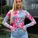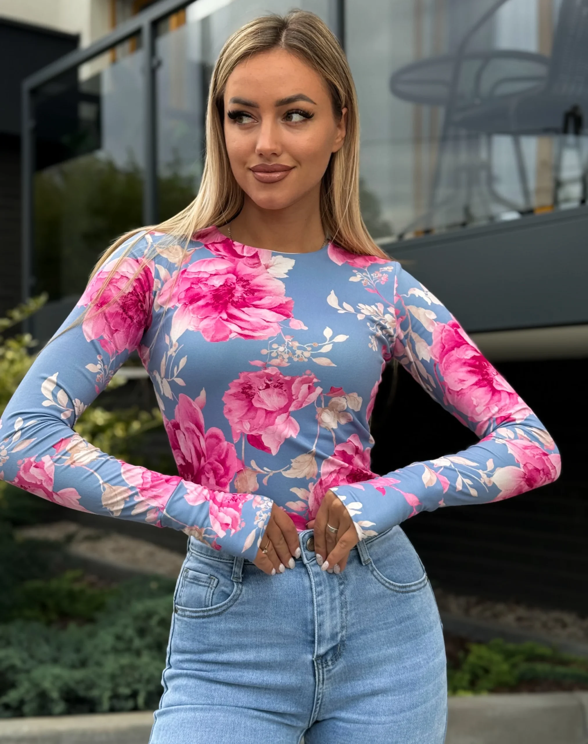 Bluzka CYNTHIA z dziurką na kciuk – różowe kwiaty na niebieskim tle