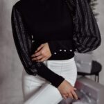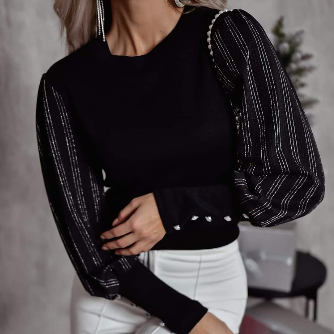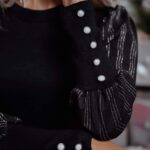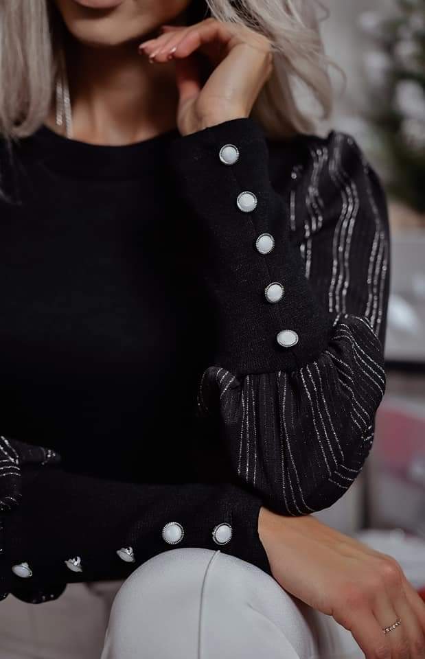 Bluzka sweterkowa GRETA koloru czarny. Ozdobny, szeroki rękaw z innego materiału ze złotą nitką. Na mankiecie wszyte są guziki – 5 sztuk, które zdobią mankiet. Dekolt pod szyję. Rękawek luźny zakończony ściągaczem. Bluzka jest mięciutka i milutka w dotyku, z dodatkiem elastanu, wygodna, niedrapiąca, krój luźny. Bluzeczka idealna do eleganckich spodni, spódnic, jeansów lub legginsów. Uszyta z bardzo miłego w dotyku materiału.