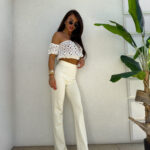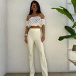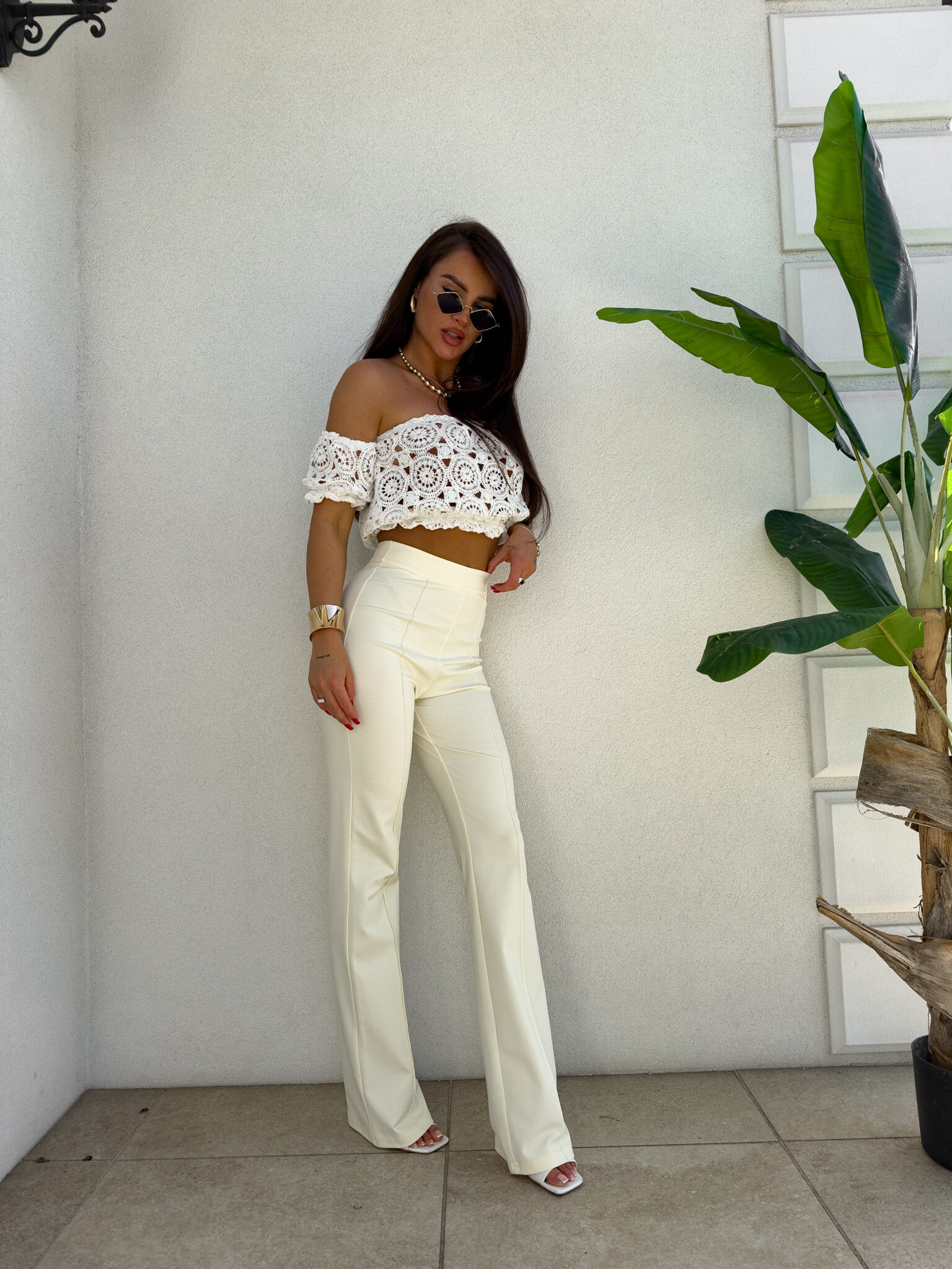 Ażurowa hiszpanka o krótkim kroju zachwyca lekkością i przewiewnym materiałem. Góra wykończona jest elastyczną gumką, która subtelnie dopasowuje się do ciała. Gumki przy rękawach tworzą efekt lekko bufiastego wykończenia.