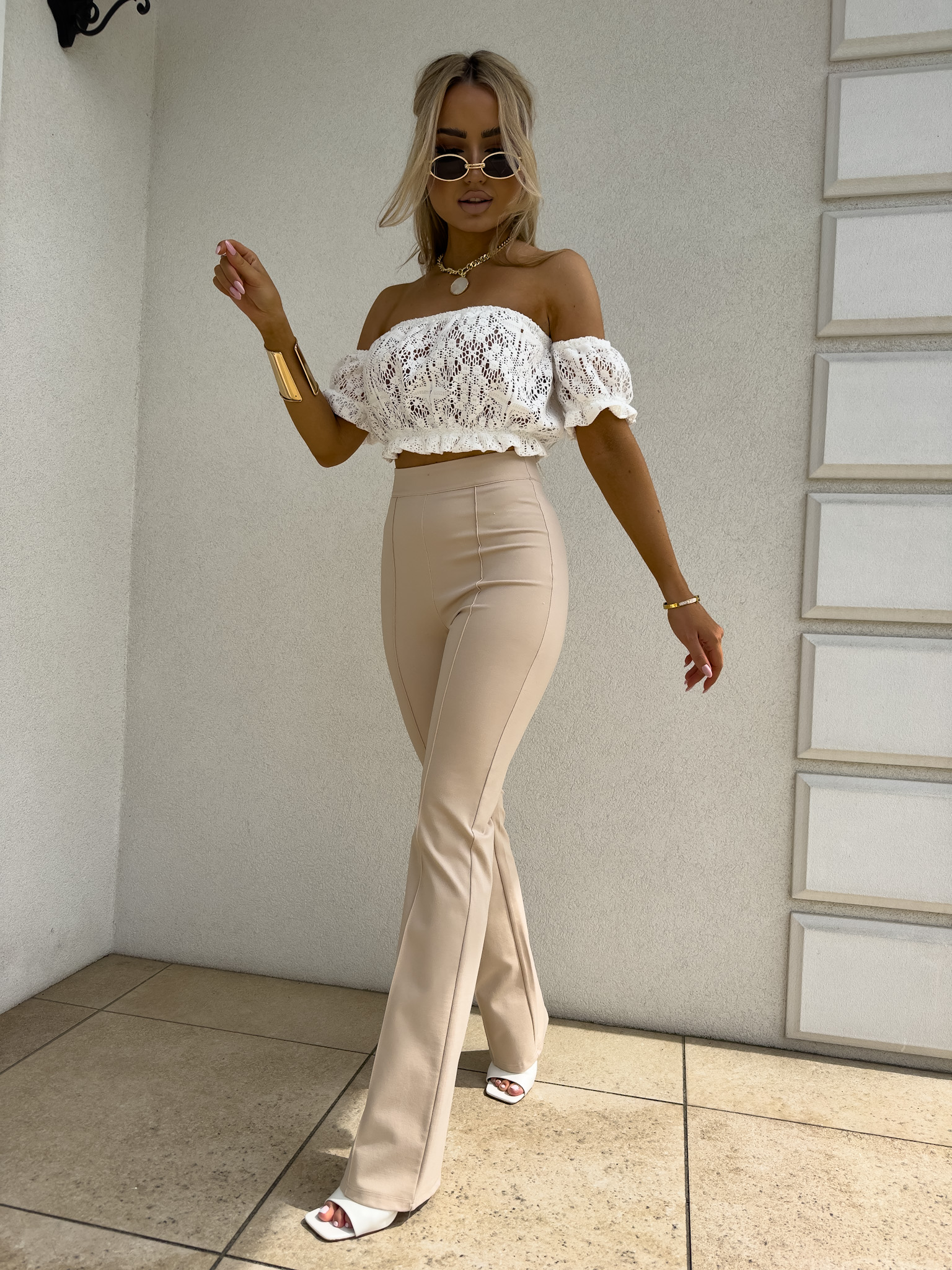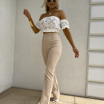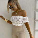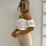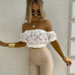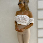 Ażurowa hiszpanka o krótkim kroju zachwyca lekkością i przewiewnym materiałem. Góra wykończona jest elastyczną gumką, która subtelnie dopasowuje się do ciała. Gumki przy rękawach tworzą efekt lekko bufiastego wykończenia.