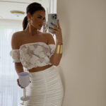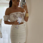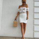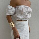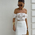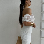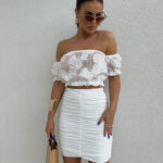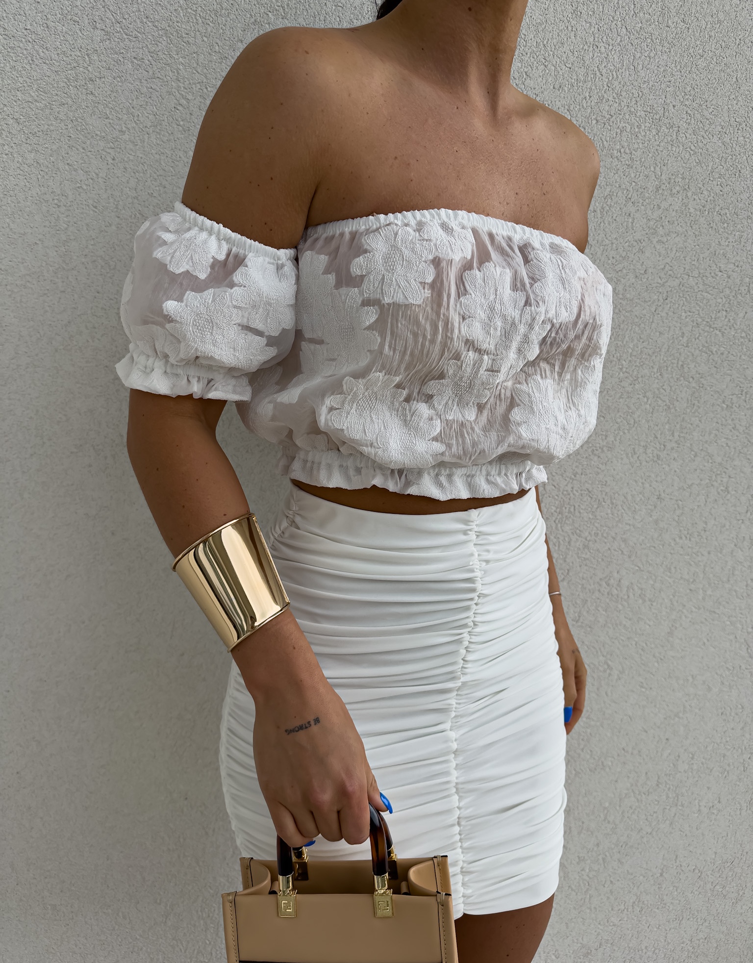 Ażurowa hiszpanka o krótkim kroju zachwyca lekkością i przewiewnym materiałem. Góra wykończona jest elastyczną gumką, która subtelnie dopasowuje się do ciała. Gumki przy rękawach tworzą efekt lekko bufiastego wykończenia.