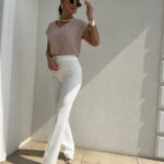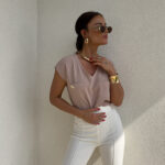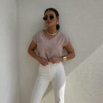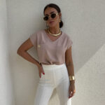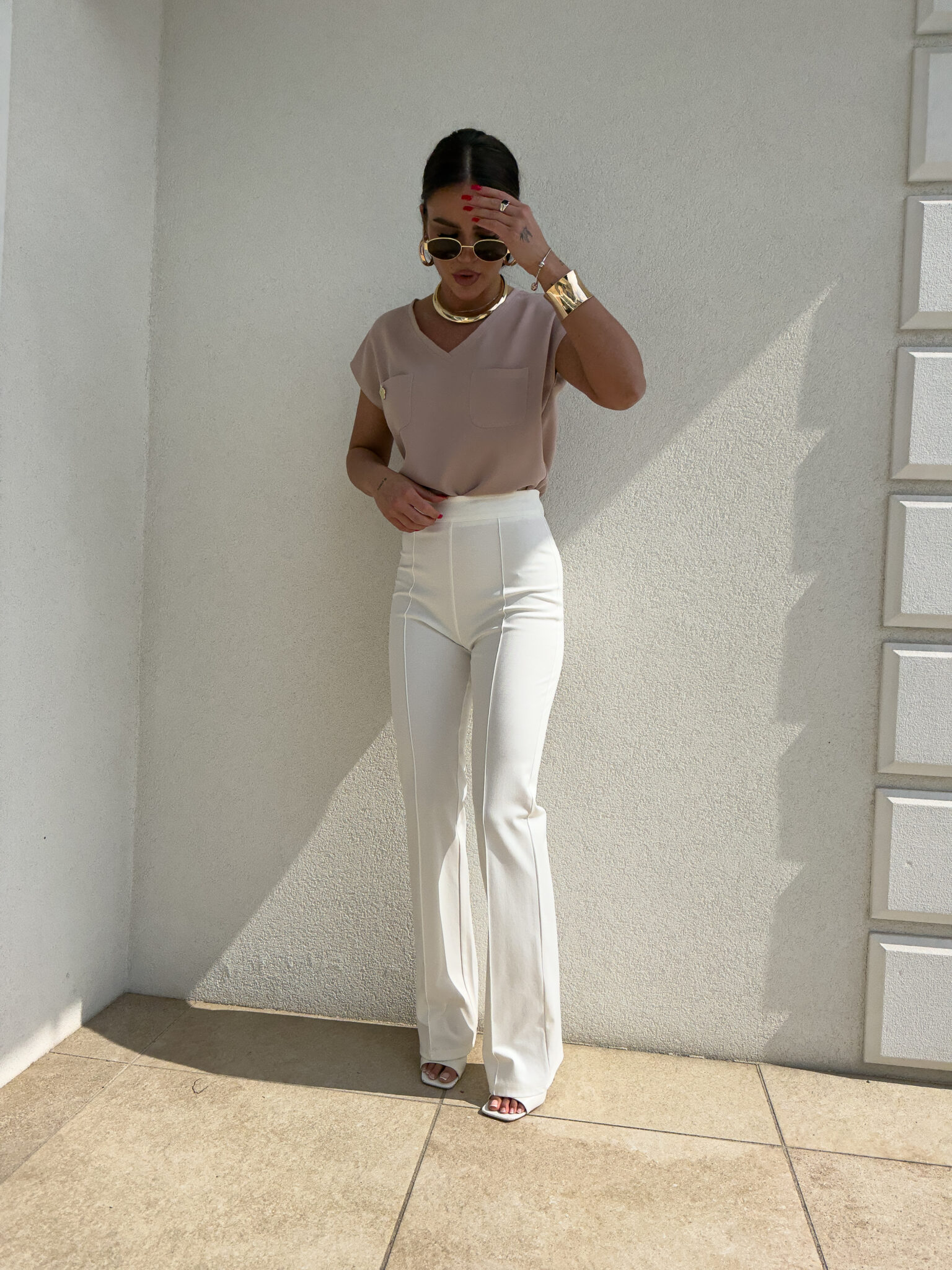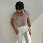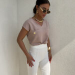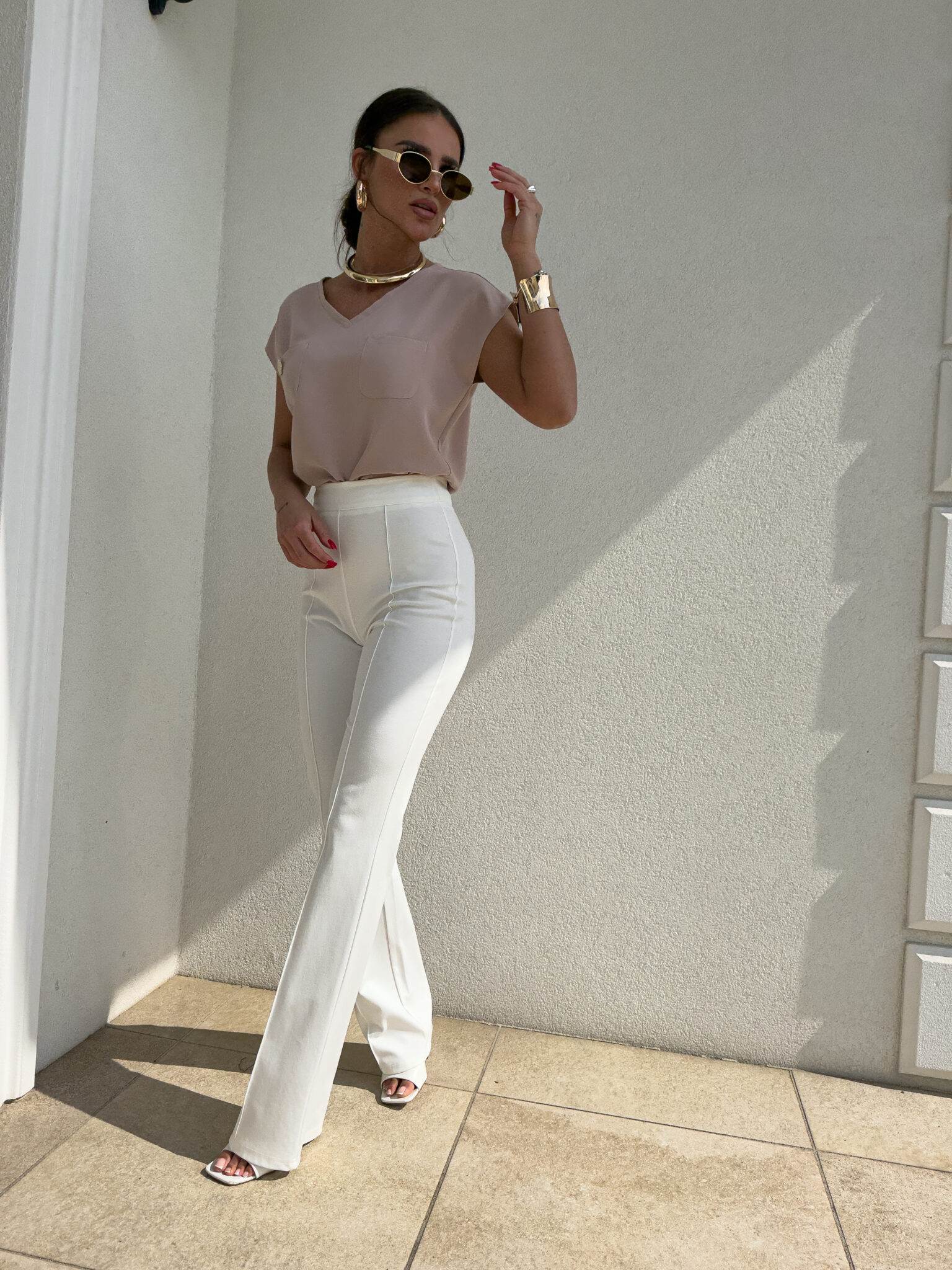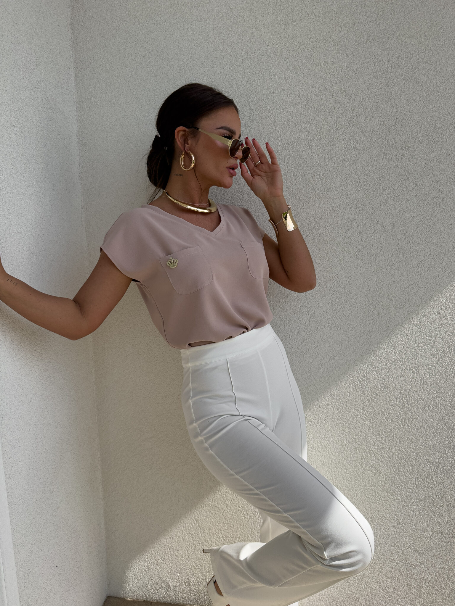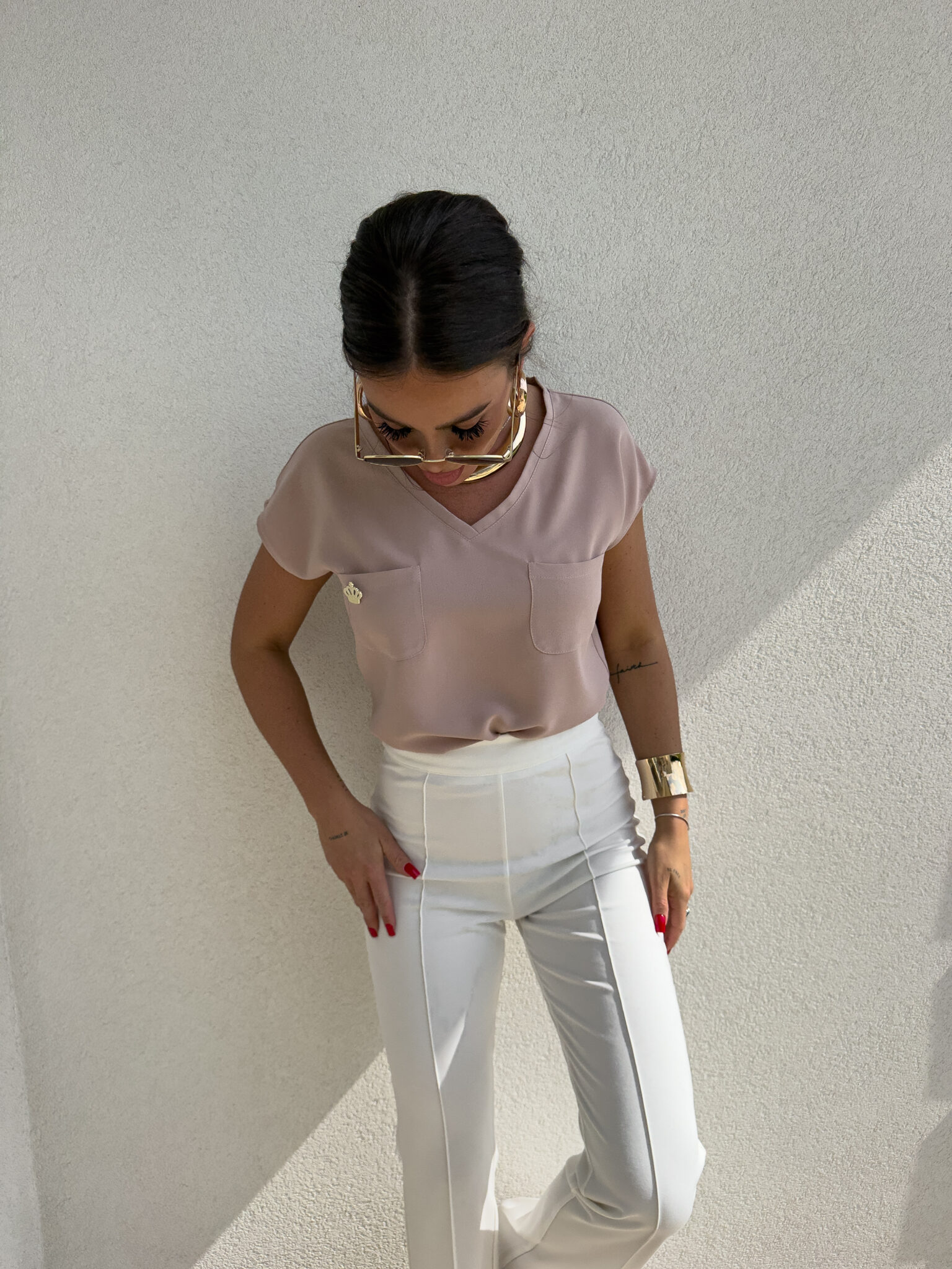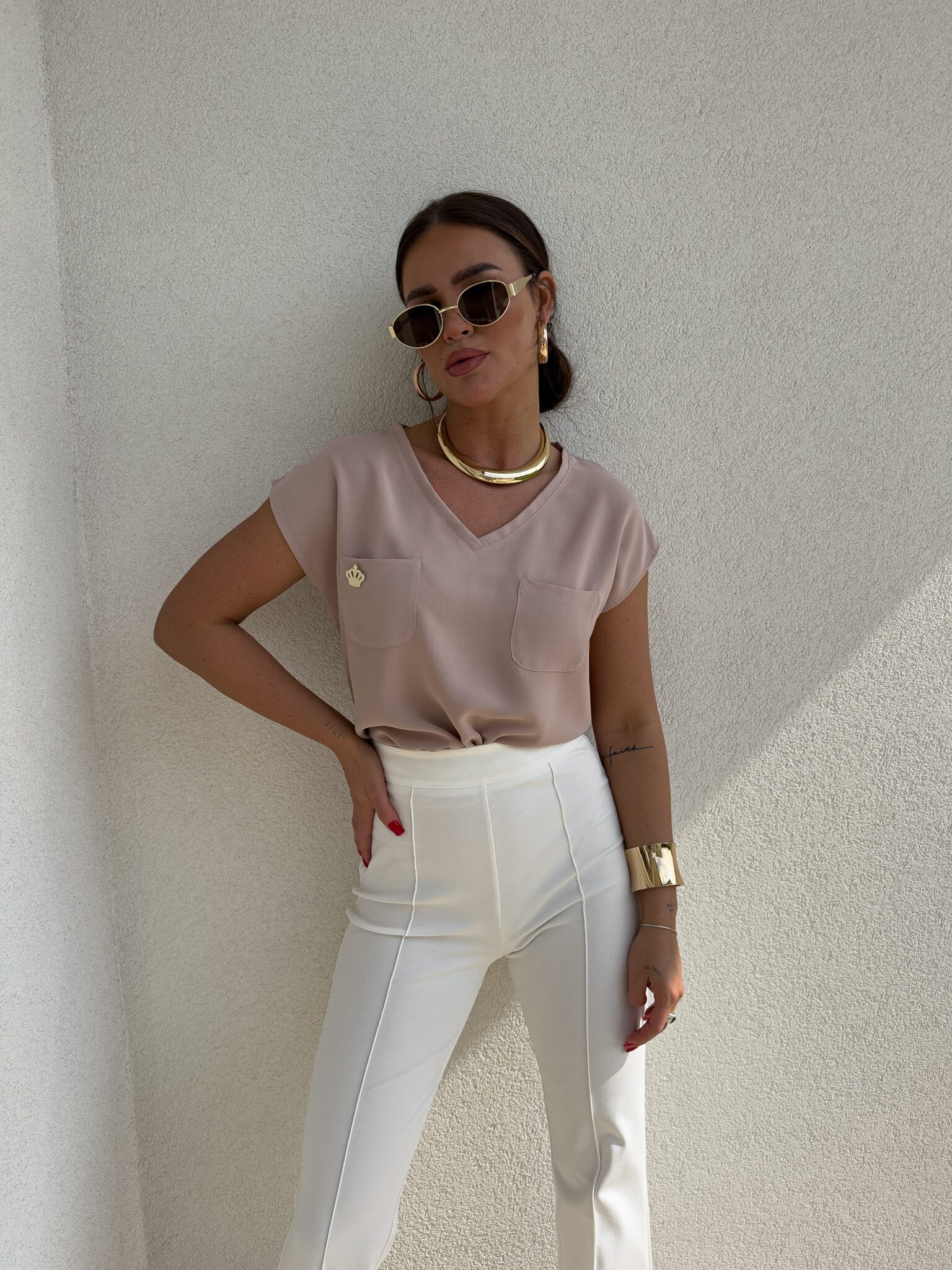 Bluzka o luźnym kroju z dekoltem w serek i krótkimi rękawami. Posiada dwie kieszonki z przodu, które dodają praktyczności. Do zestawu dołączona jest ozdobna broszka.