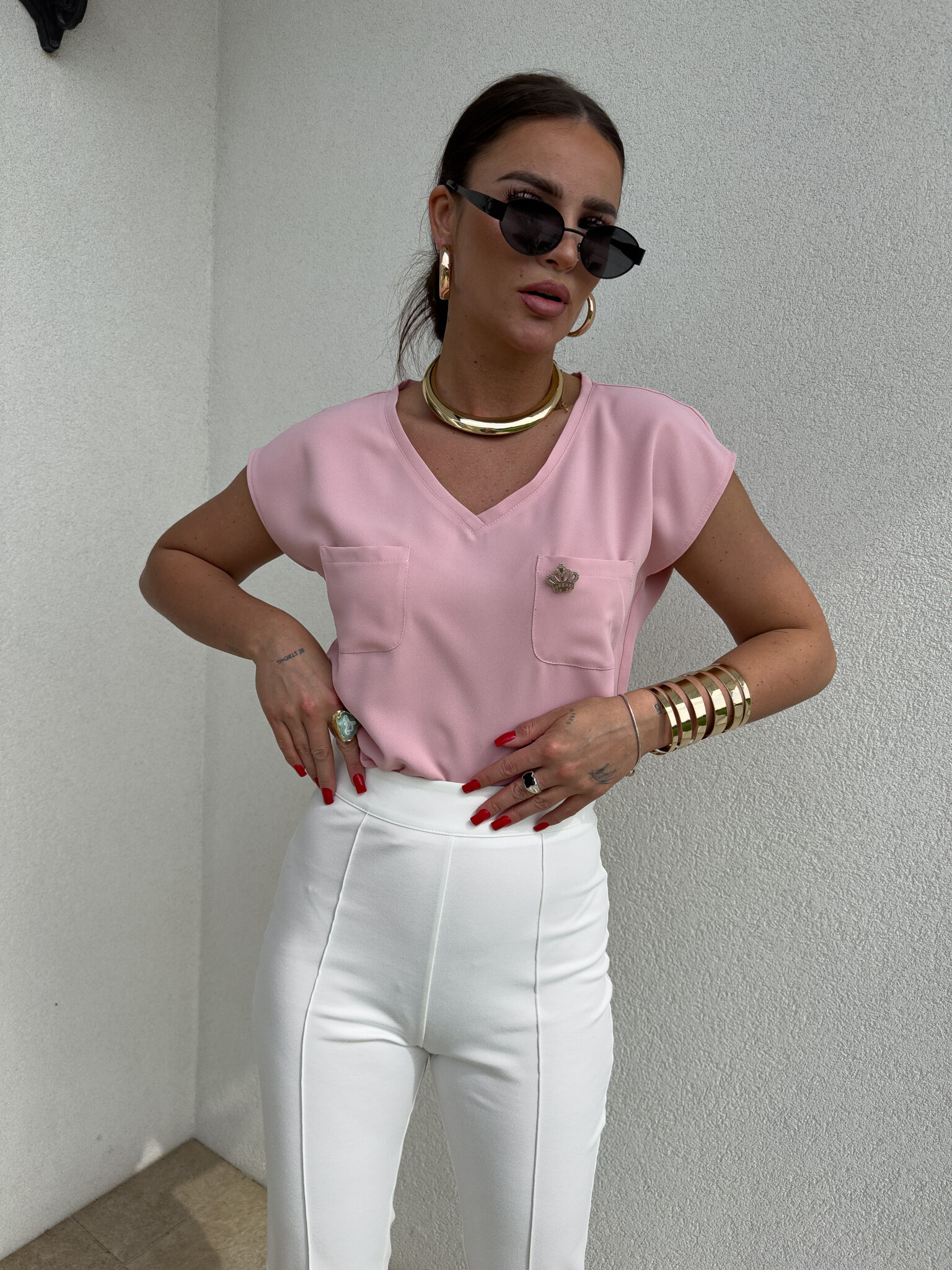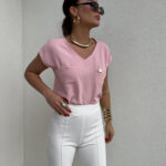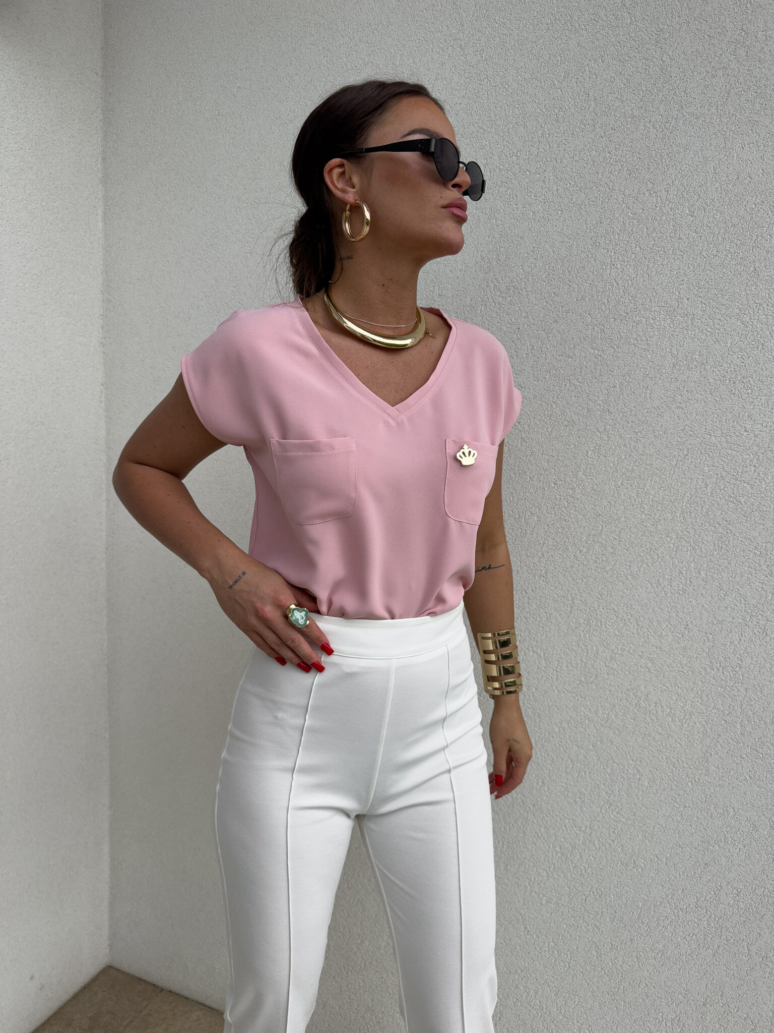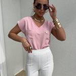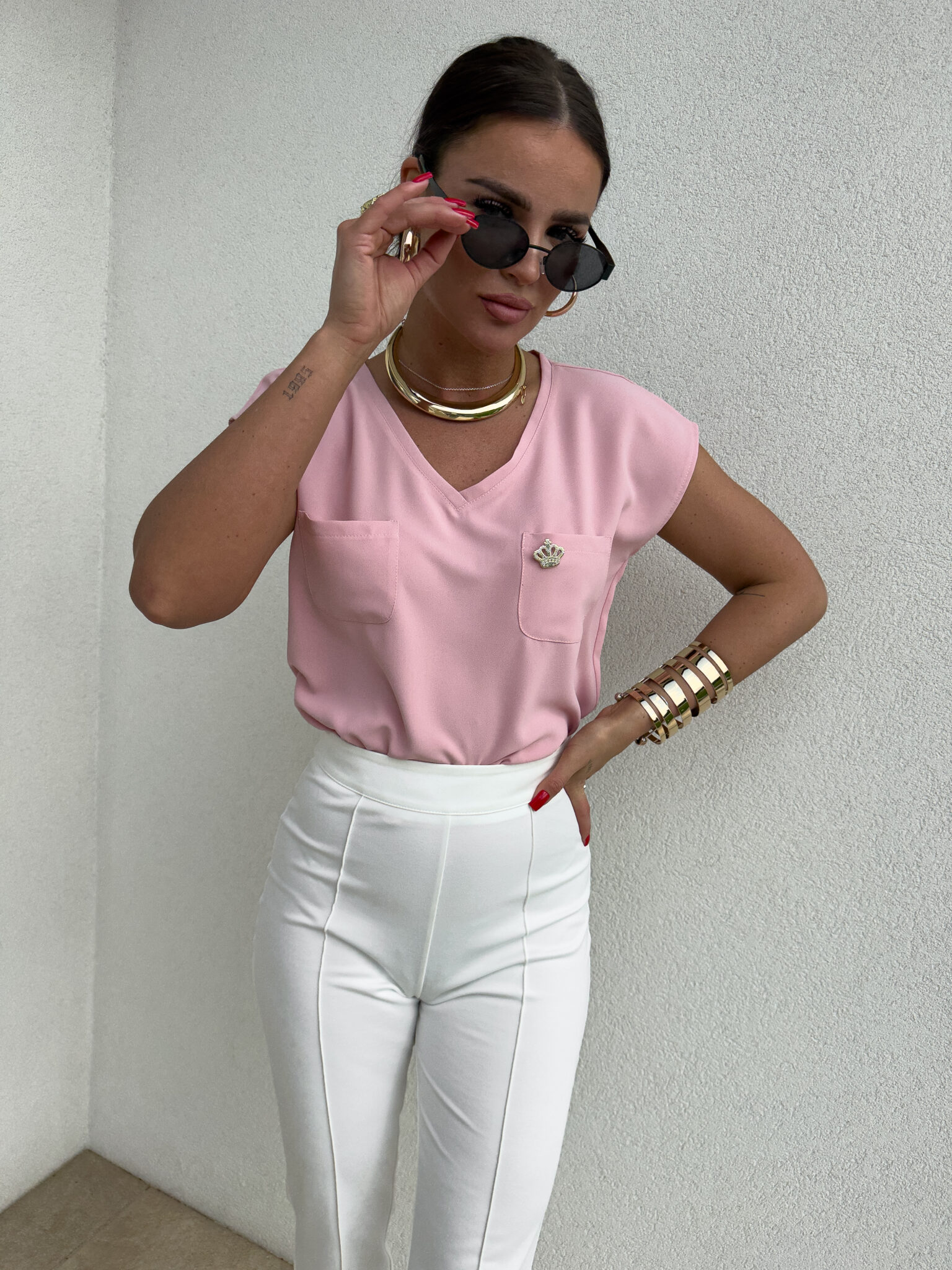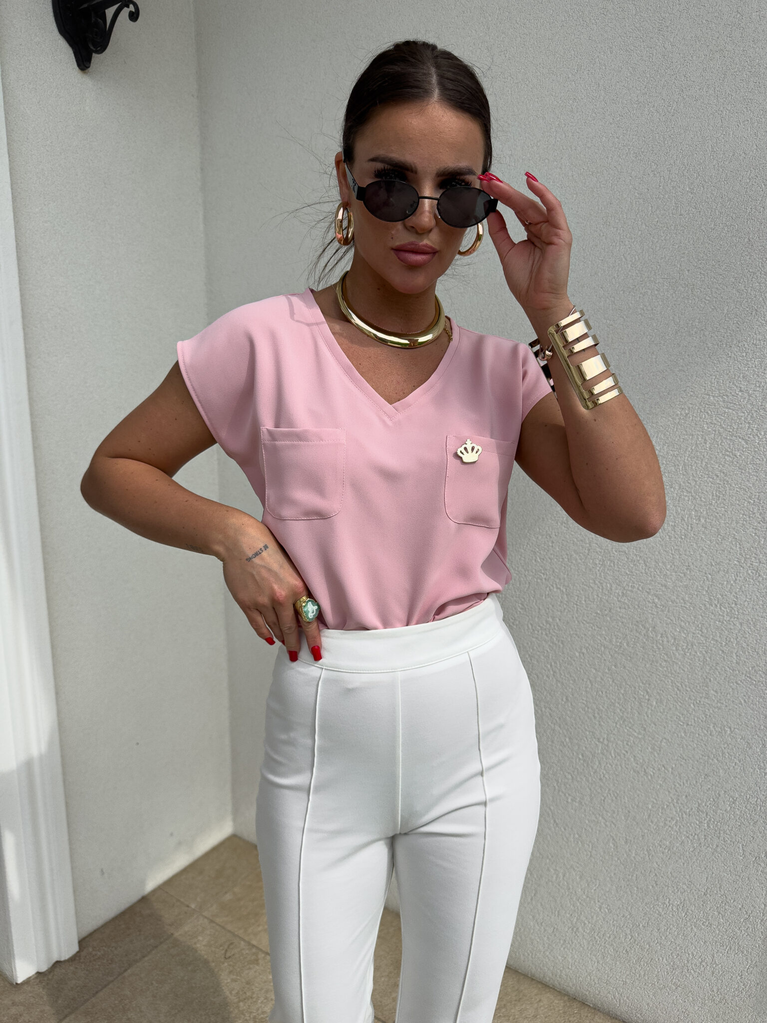Bluzka o luźnym kroju z dekoltem w serek i krótkimi rękawami. Posiada dwie kieszonki z przodu, które dodają praktyczności. Do zestawu dołączona jest ozdobna broszka.