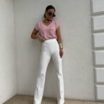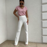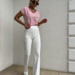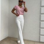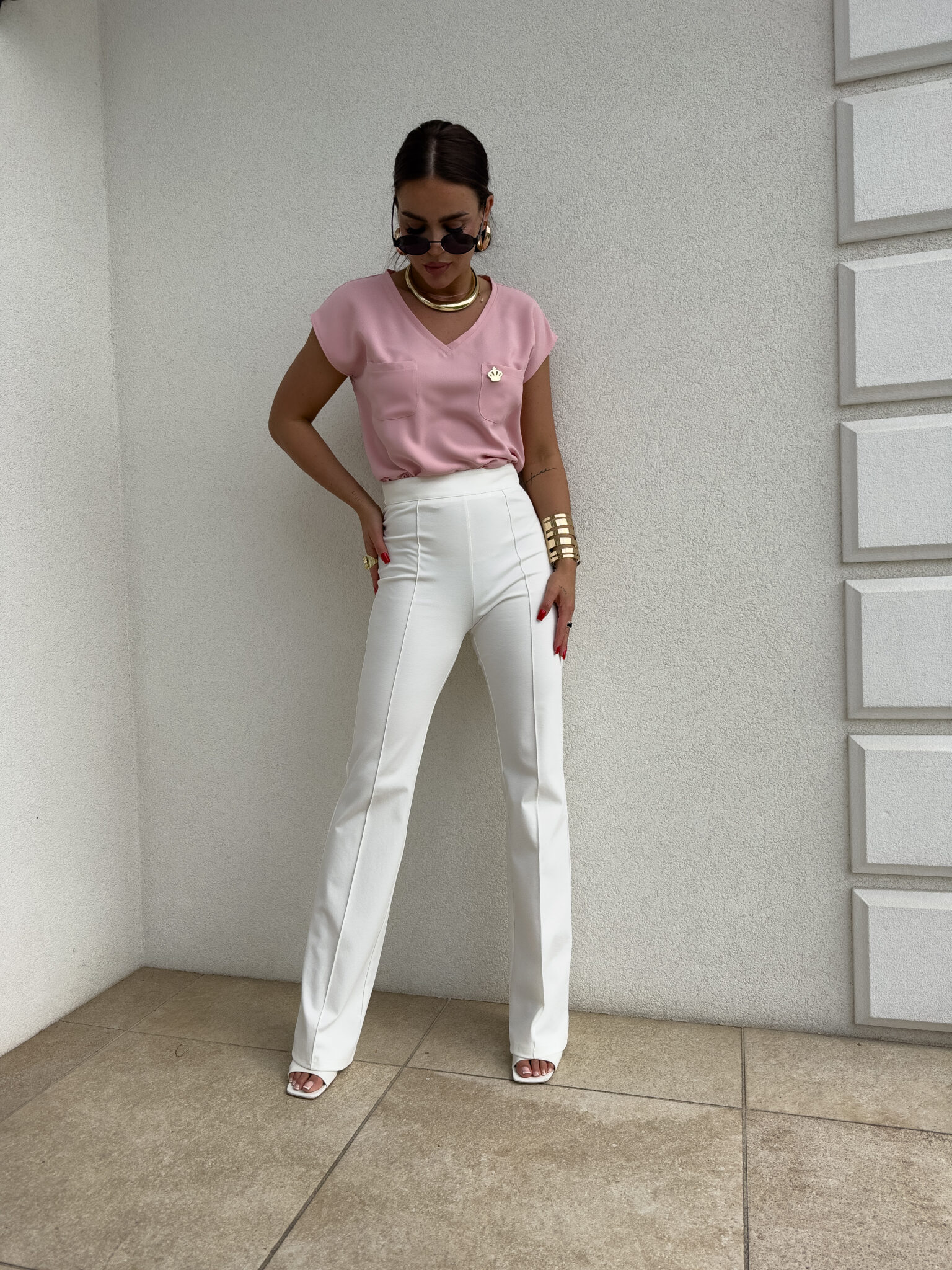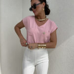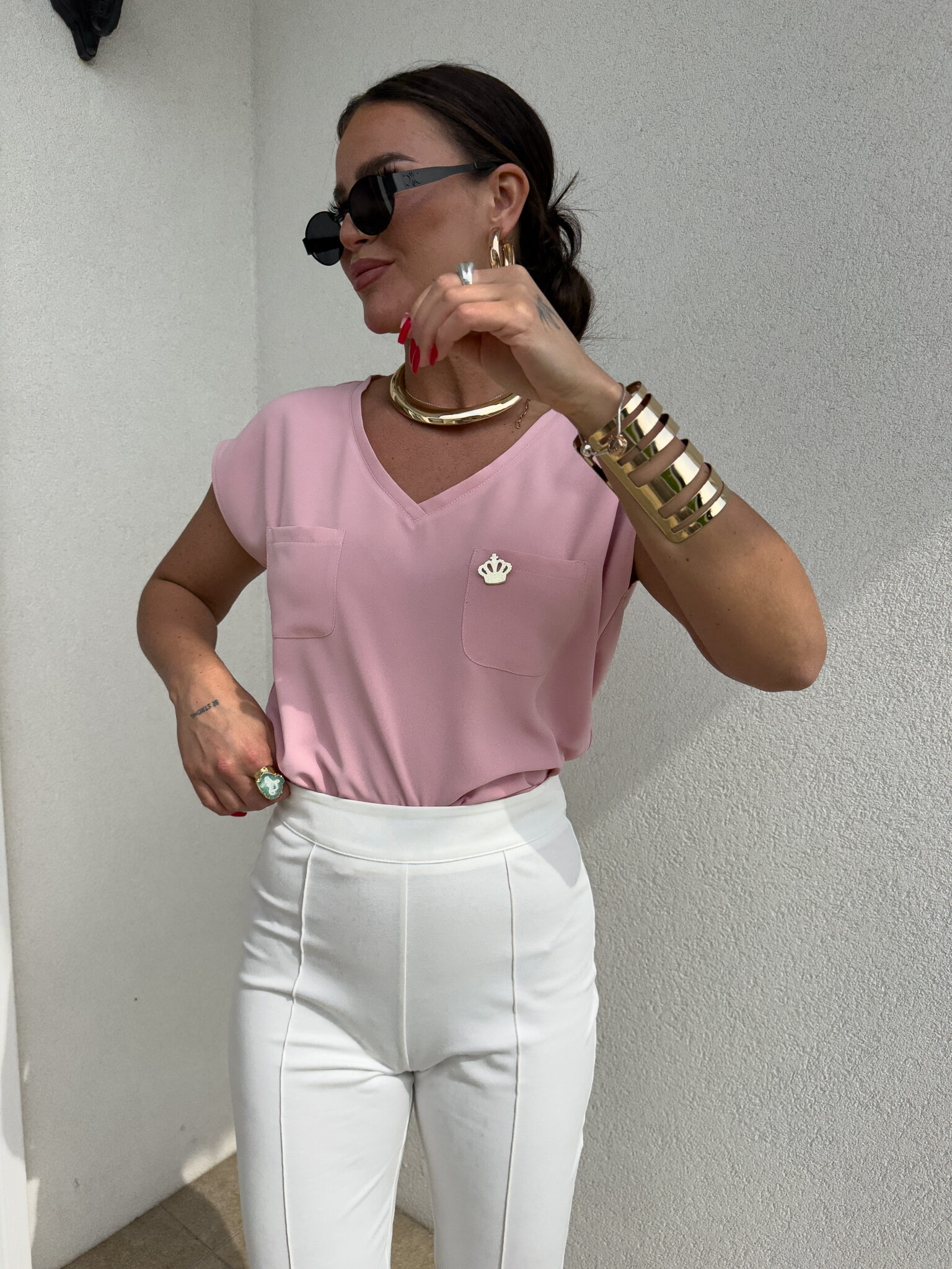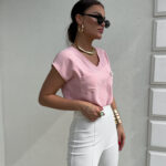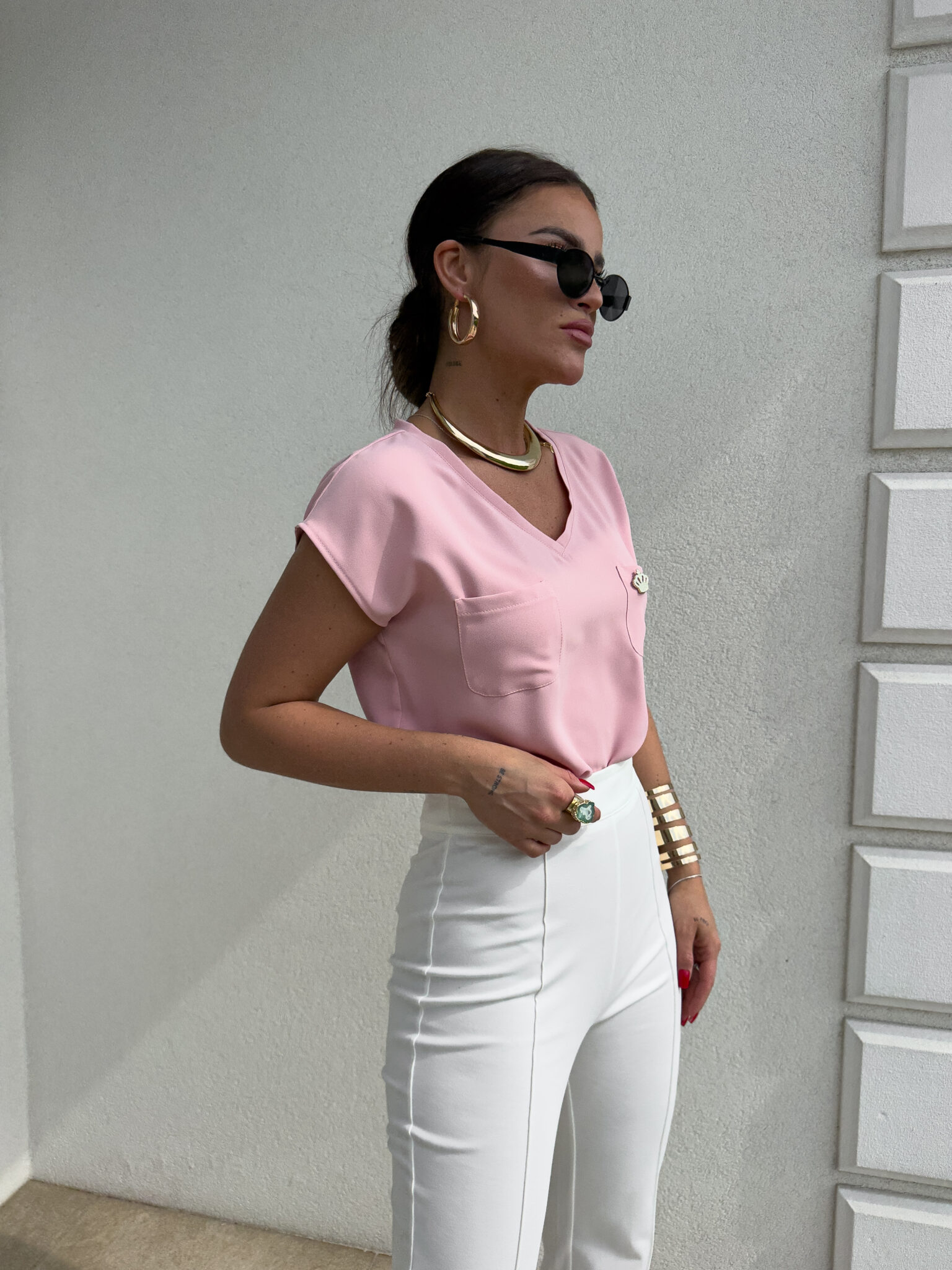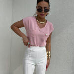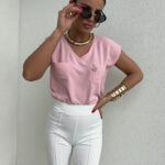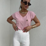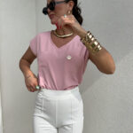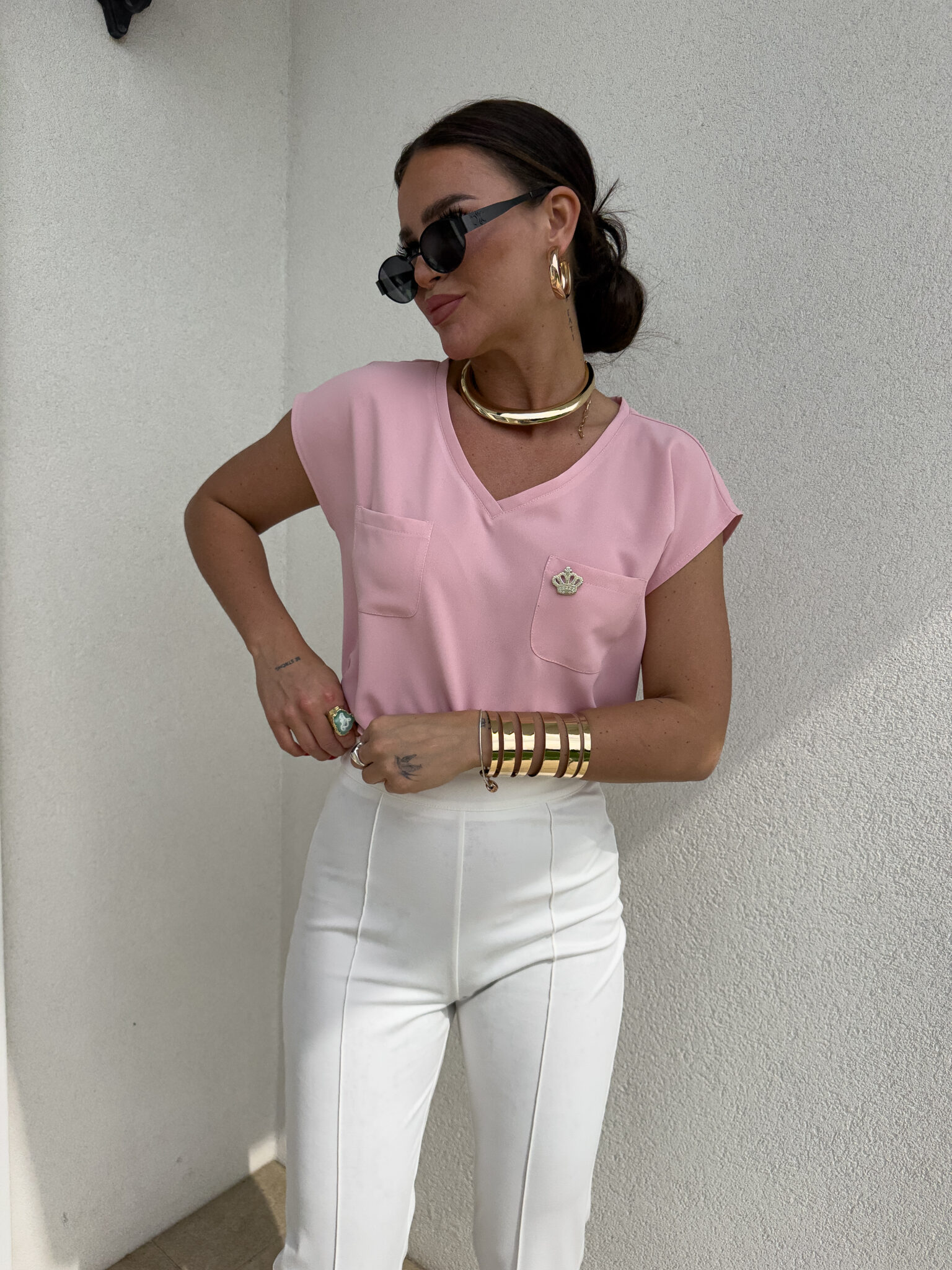 Bluzka o luźnym kroju z dekoltem w serek i krótkimi rękawami. Posiada dwie kieszonki z przodu, które dodają praktyczności. Do zestawu dołączona jest ozdobna broszka.