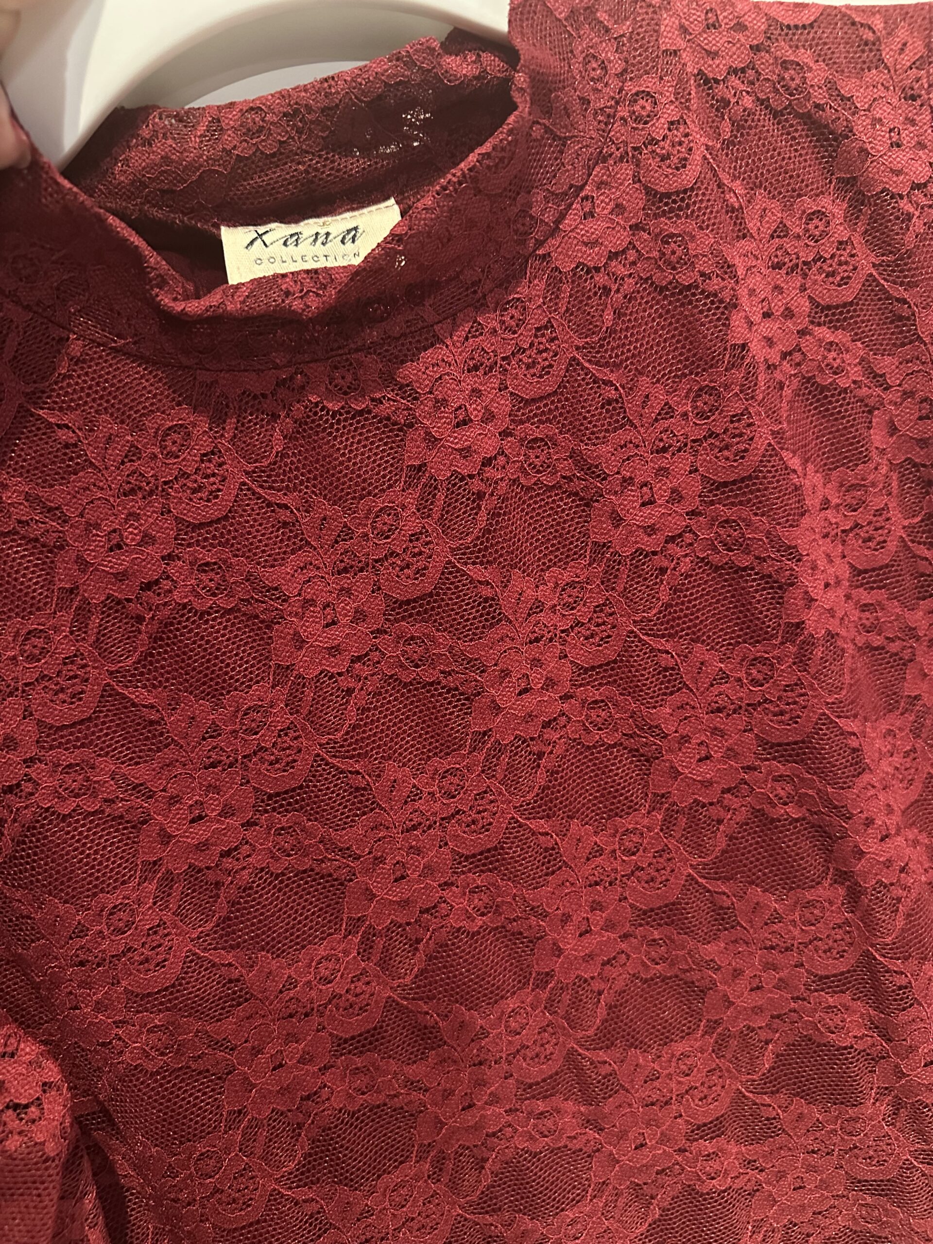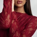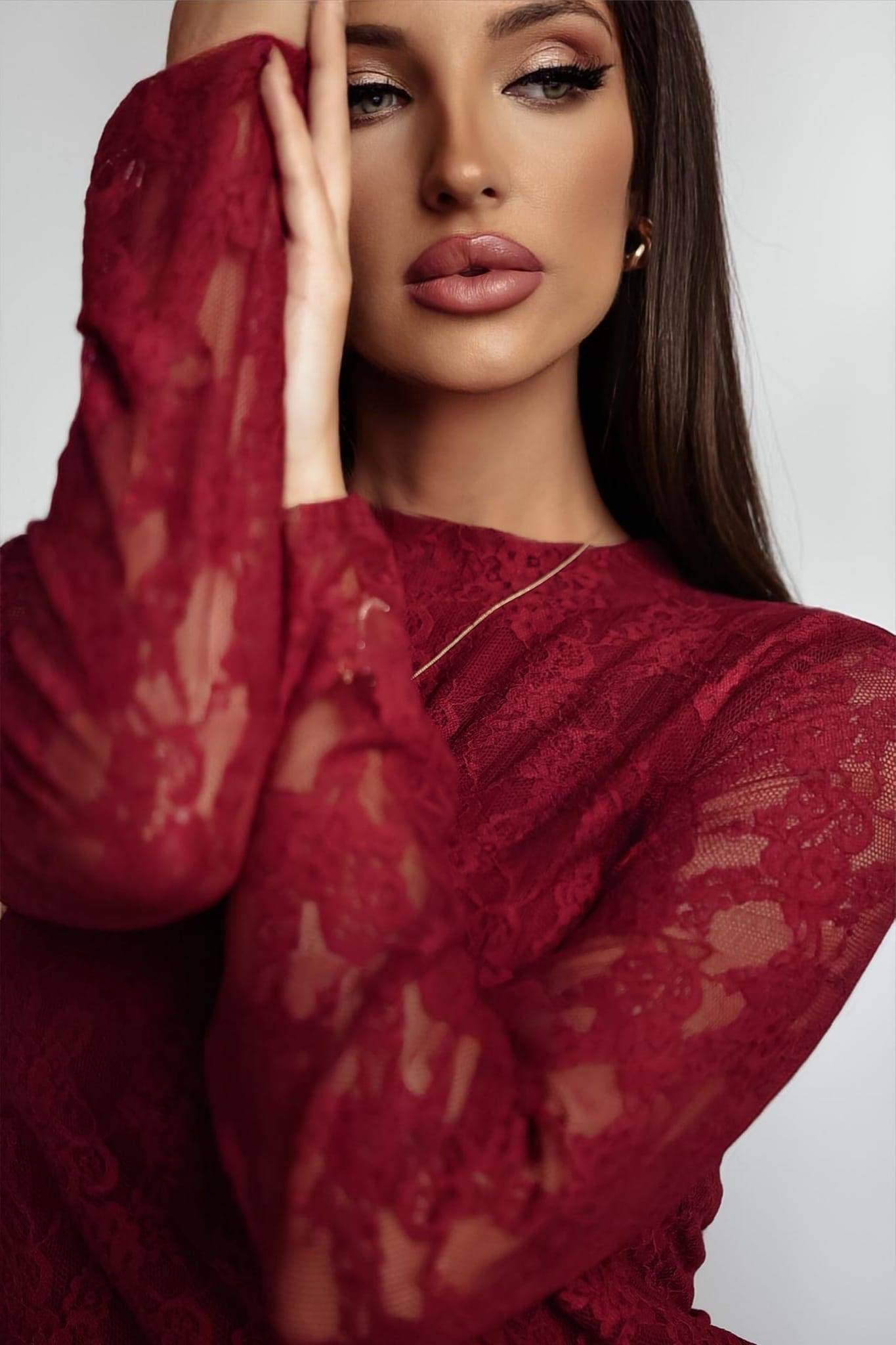 Bluzka koronkowa SARA w kolorze bordowym to połączenie elegancji i wygody. Wykonana z miękkiej, elastycznej koronki, pięknie dopasowuje się do sylwetki. Subtelna stójka i długie rękawy dodają klasy, a podszewka zapewnia komfort noszenia.