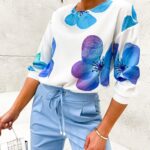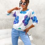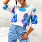 Bluzka koszulowa TRIS, print – duże maki w kolorze niebiesko-turkusowo-fioletowym, z długim rękawem zakończonym ściągaczem gumkowym. Bluzka posiada dekolt pod szyję. Dół jest zakończony ściągaczem gumkowym takim samym, jak przy rękawach. Koszula ma kształt delikatnego nietoperza i jest zwężana ku dołowi. Bluzka uszyta jest z cienkiego, lekkiego materiału. Bluzka koszulowa będzie doskonałym dodatkiem do spodni oraz spódnic, jak również pod żakiet. Model niezwykle kobiecy, który założysz do eleganckiego stroju do pracy w urzędzie lub biurze oraz na co dzień.