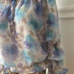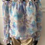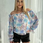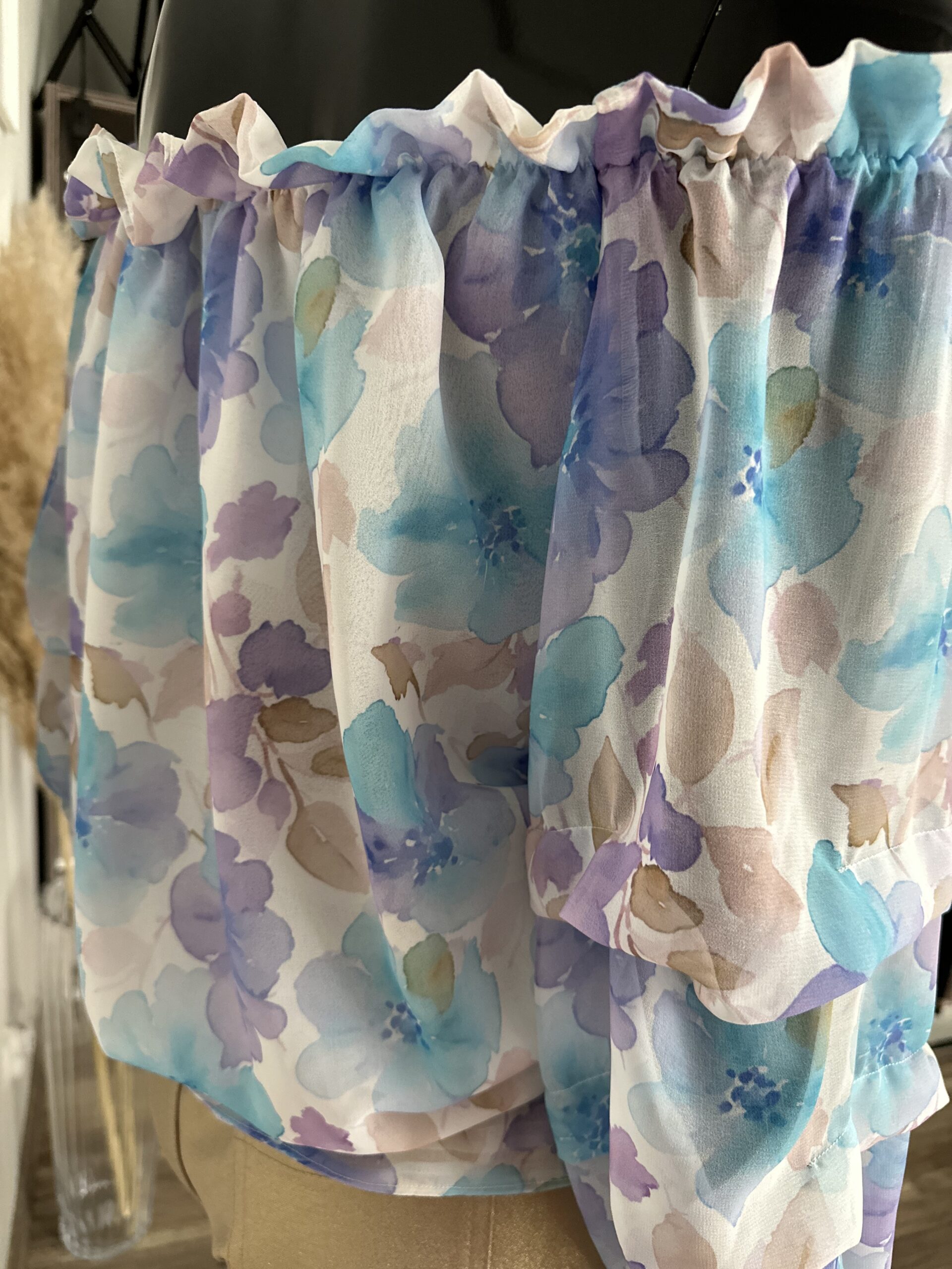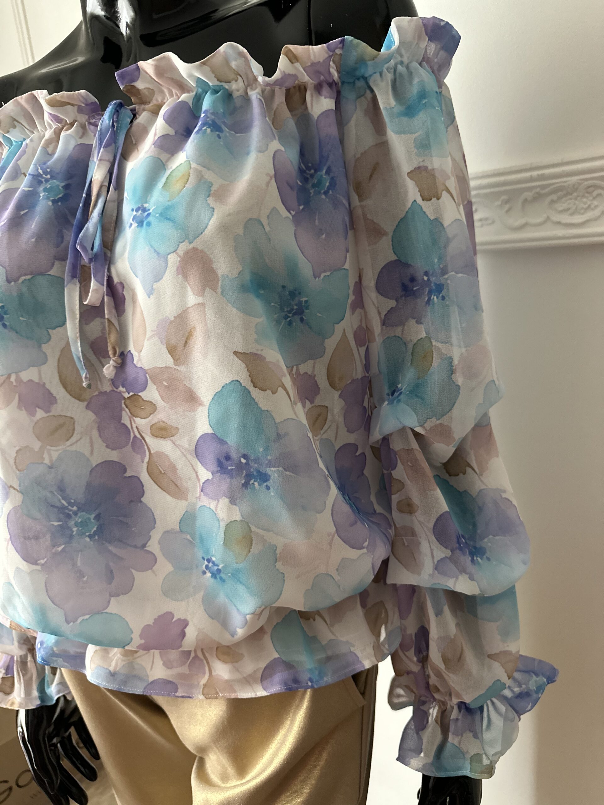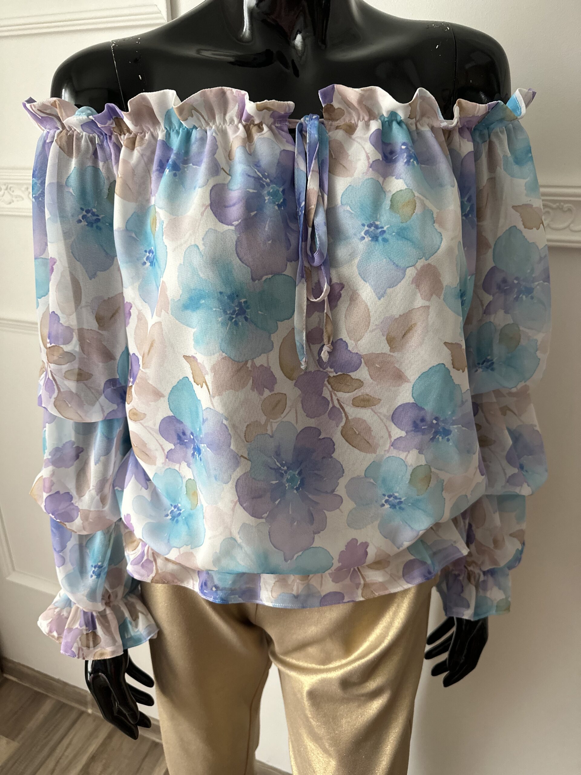 Bluzka MELANIE, kolor błękitny z beżowo-fioletowymi kwiatami oraz liśćmi, przepiękna bluzka hiszpanka charakteryzująca się luźnym fasonem, u góry wykończona ściągaczem gumkowym oraz wiązaniem na środku, dopasowuje się do sylwetki, Rękawy ma długie, luźne, szersze, drapowane, zakończone ściągaczem gumkowym z falbanką. W pasie posiada również gumkę, a tuż za nią jest gustowna niewielka baskinka, która dodaje uroku całej bluzeczce. Środek zawiera podszewkę. Pięknie podkreśla sylwetkę i jest niezwykle sexowna, zwiewna i lekka. Bluzeczka uszyta jest z miłego w dotyku szyfonu. Bluzka jest idealna do jeansów, spódniczek, spodenek, eleganckich spodni. Krój bluzeczki zagwarantuje komfort i wygodę noszenia.