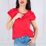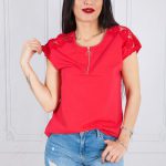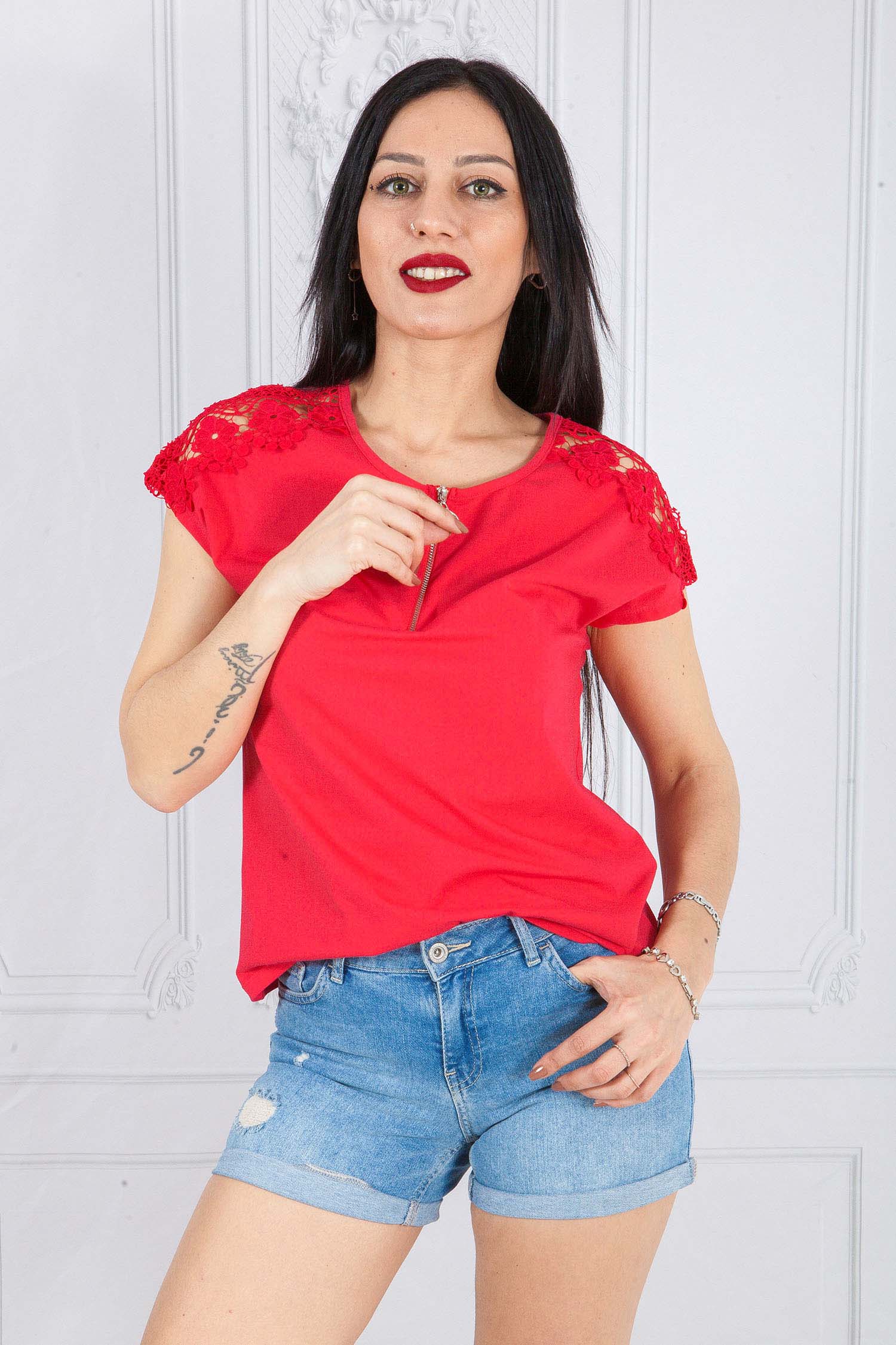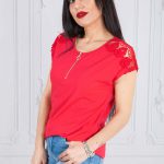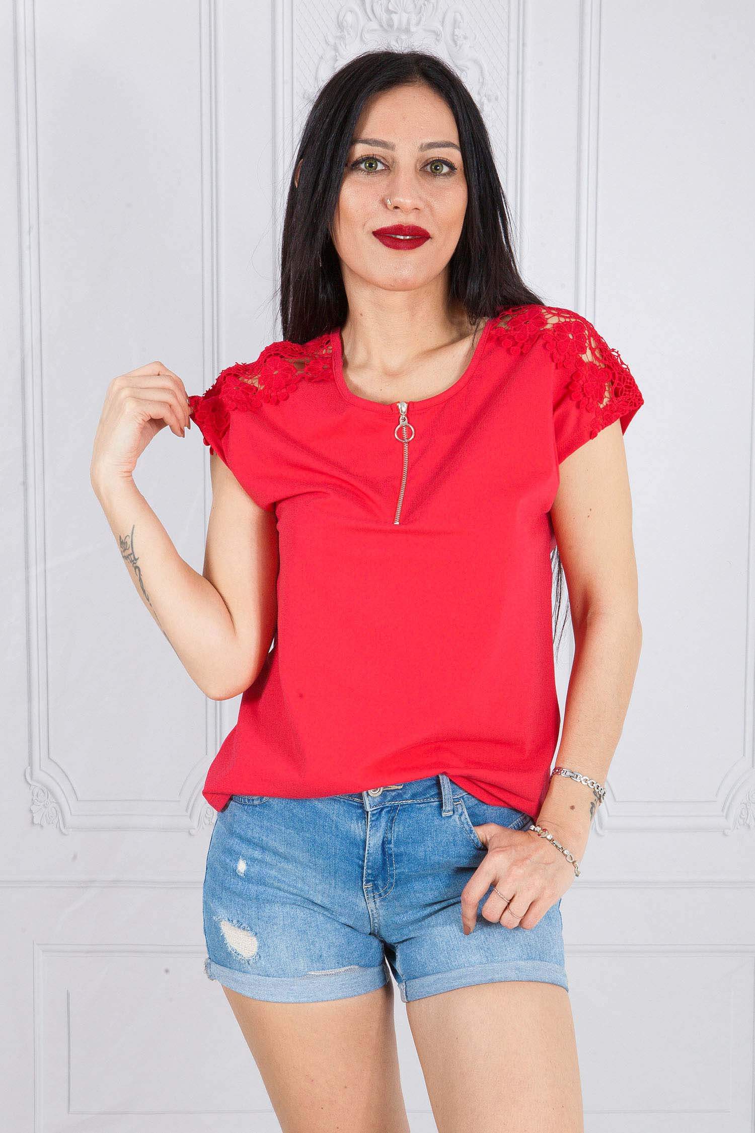 Bluzka MONKY z krótkim rękawem, wykończonym na ramionach gipiurą koronkową, krój przylegający, z przodu krótki suwak metalowy, kolor koral. Bardzo piękna i elegancka bluzka o ciekawym kroju, idealna do szortów, spodni, spódnic. Uszyta według najnowszego trendu w modzie z najwyższej jakości tureckiej bawełny. Bluzka jest uszyta z niezwykłą starannością i dbałością o wykończenie.