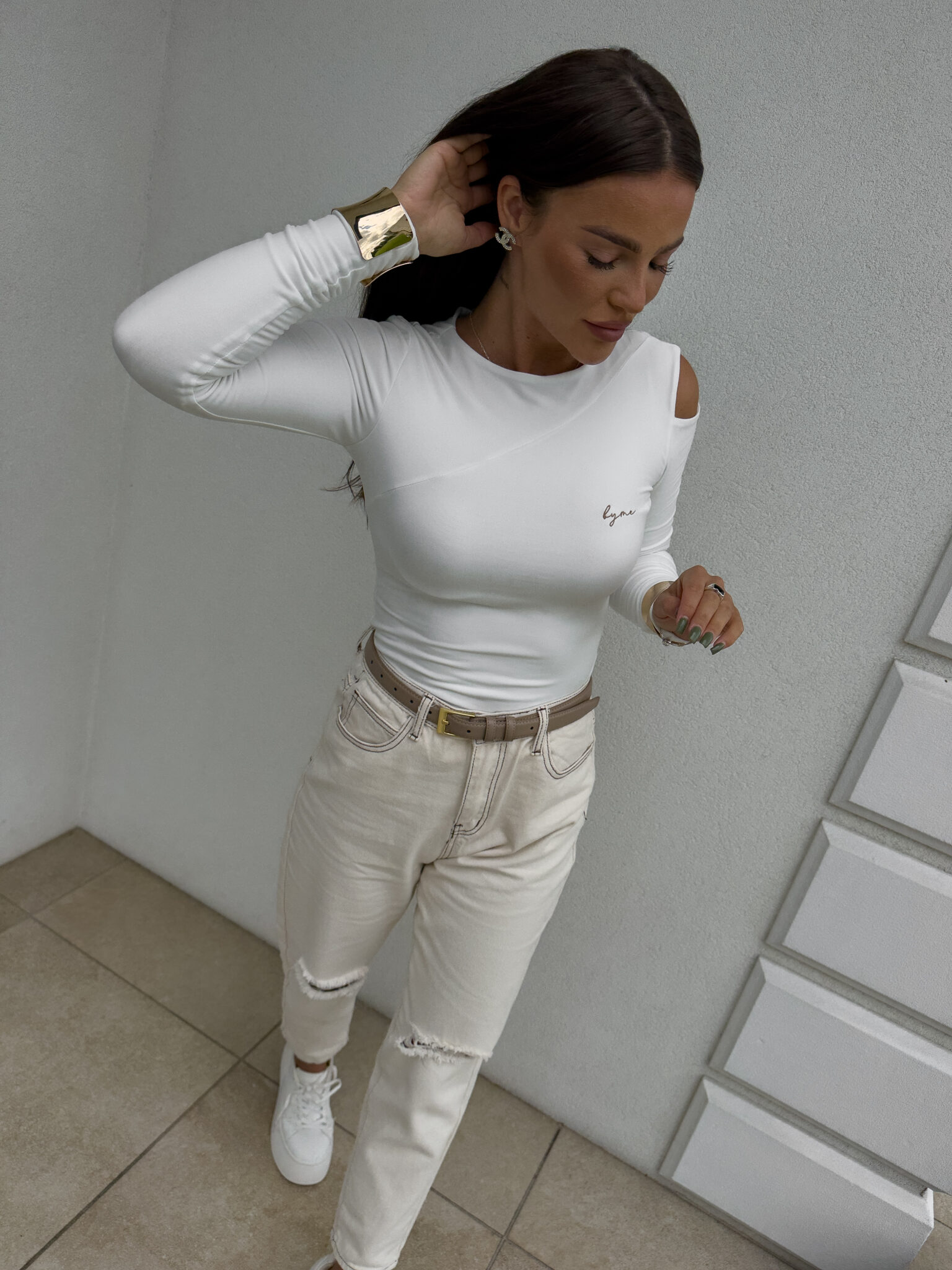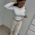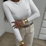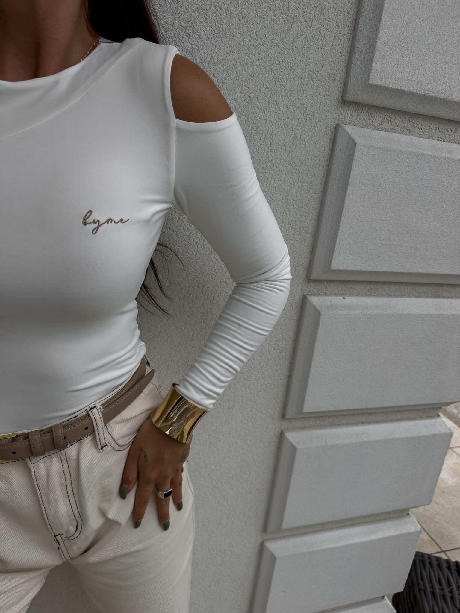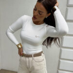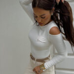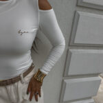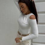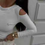 Bluzka MORENITA o asymetrycznym kroju to nowoczesna i kobieca propozycja. Posiada długi rękaw, jedno odkryte ramię oraz subtelny, półokrągły dekolt. Z przodu zdobi ją delikatne, minimalistyczne logo.