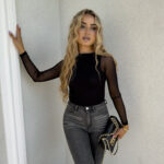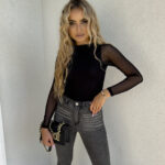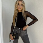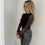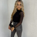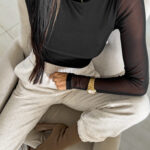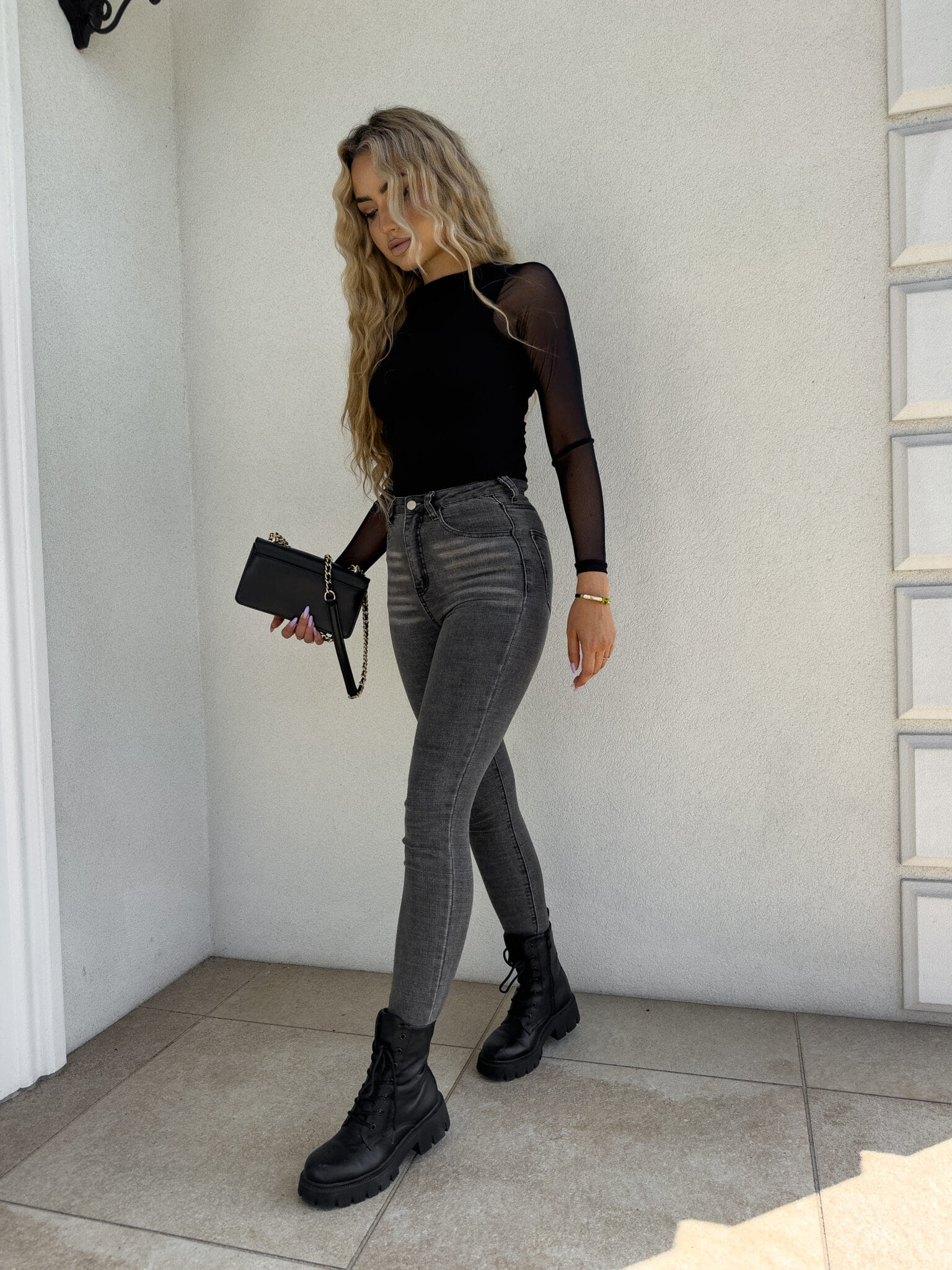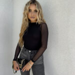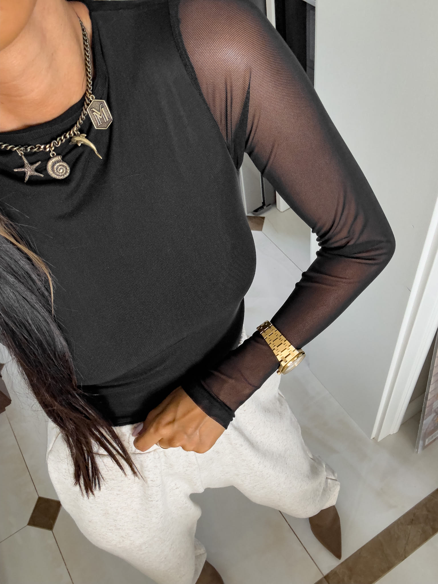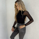 Bluzka SKIN o dopasowanym kroju wykonana jest z wyjątkowo delikatnej, przyjemnej w dotyku siateczki. Przód i tył posiadają subtelną podszewkę, która zapobiega prześwitywaniu. Model wyróżnia się długim rękawem typu long sleeve oraz delikatną stójką, nadającą całości eleganckiego charakteru.