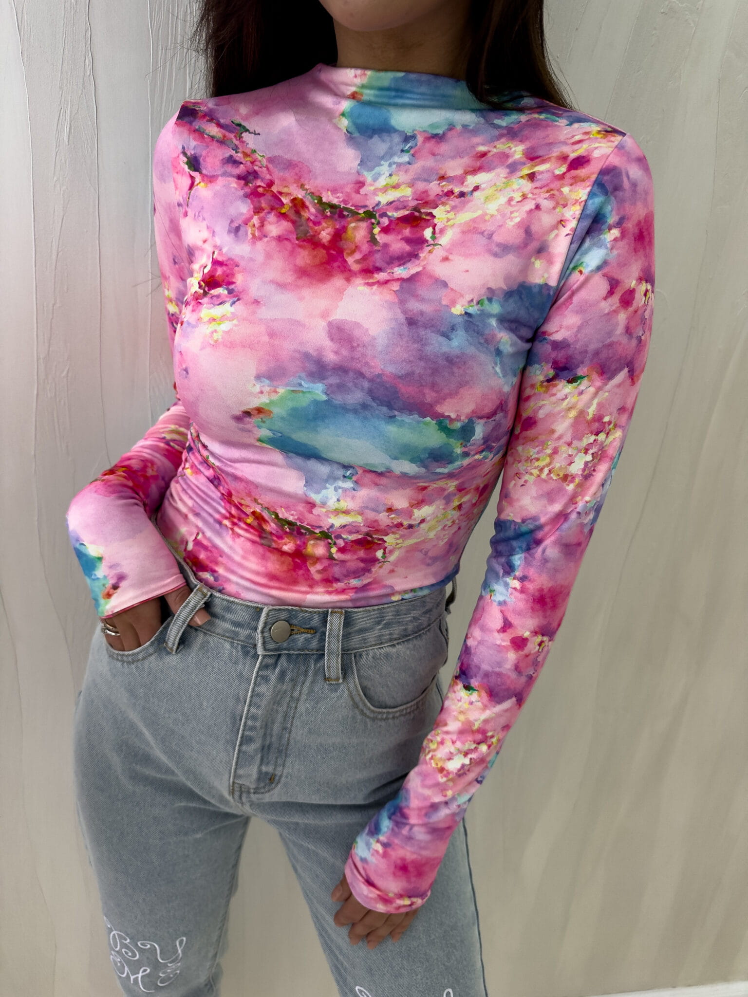 Bluzka SKIN o dopasowanym kroju wyróżnia się subtelną stójką i długim rękawem typu long sleeve. Przód i tył posiadają delikatną podszewkę, która zapobiega prześwitywaniu.