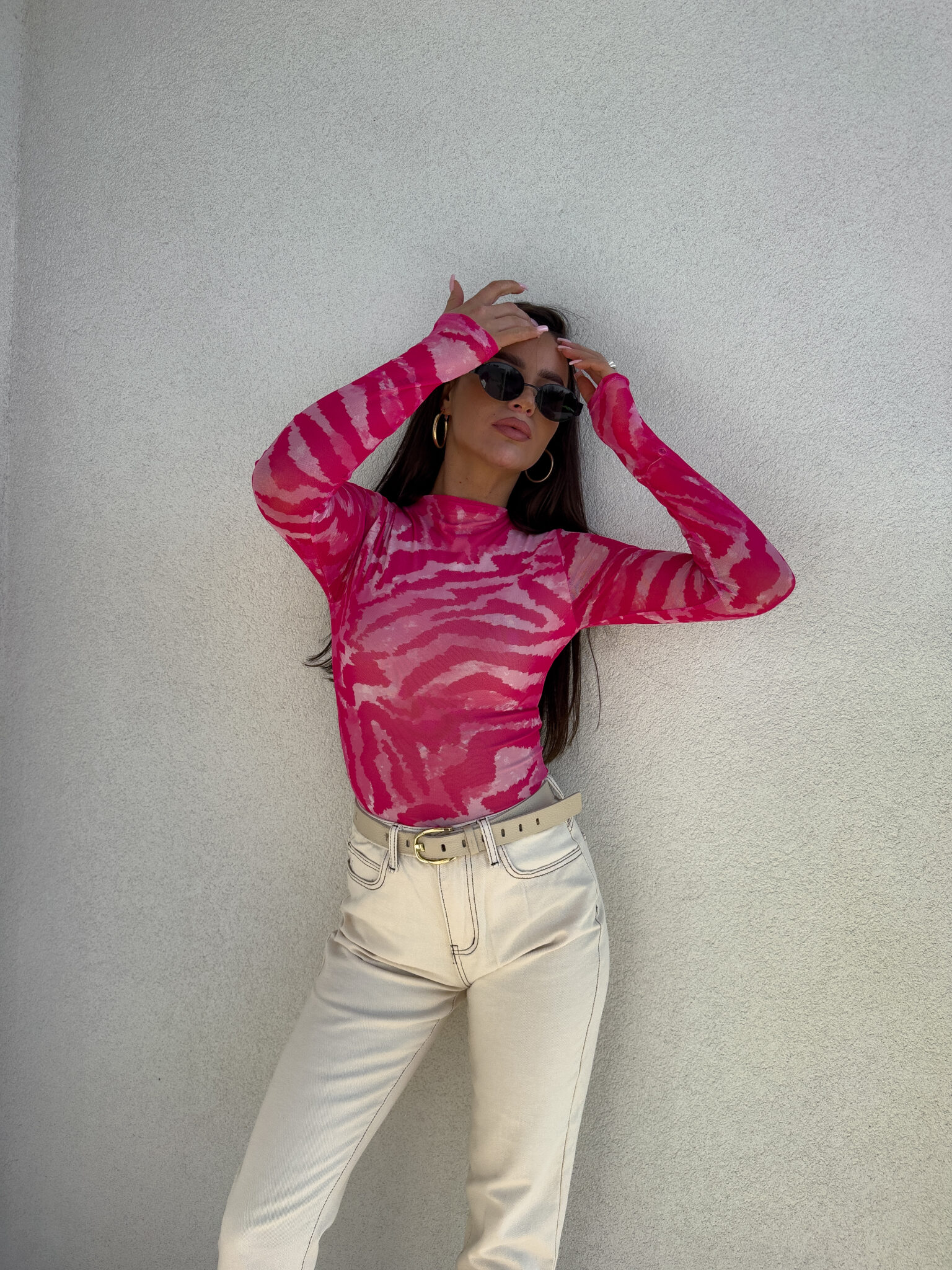 Bluzka SKIN o dopasowanym kroju wykonana jest z wyjątkowo delikatnej, przyjemnej w dotyku siateczki. Przód i tył posiadają subtelną podszewkę, która zapobiega prześwitywaniu. Model wyróżnia się długim rękawem typu long sleeve oraz delikatną stójką, nadającą całości eleganckiego charakteru.