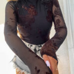 Bluzka SKIN o dopasowanym kroju wykonana jest z wyjątkowo delikatnej, przyjemnej w dotyku siateczki. Przód i tył posiadają subtelną podszewkę, która zapobiega prześwitywaniu. Model wyróżnia się długim rękawem typu long sleeve oraz delikatną stójką, nadającą całości eleganckiego charakteru.