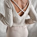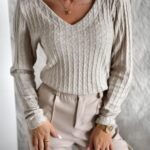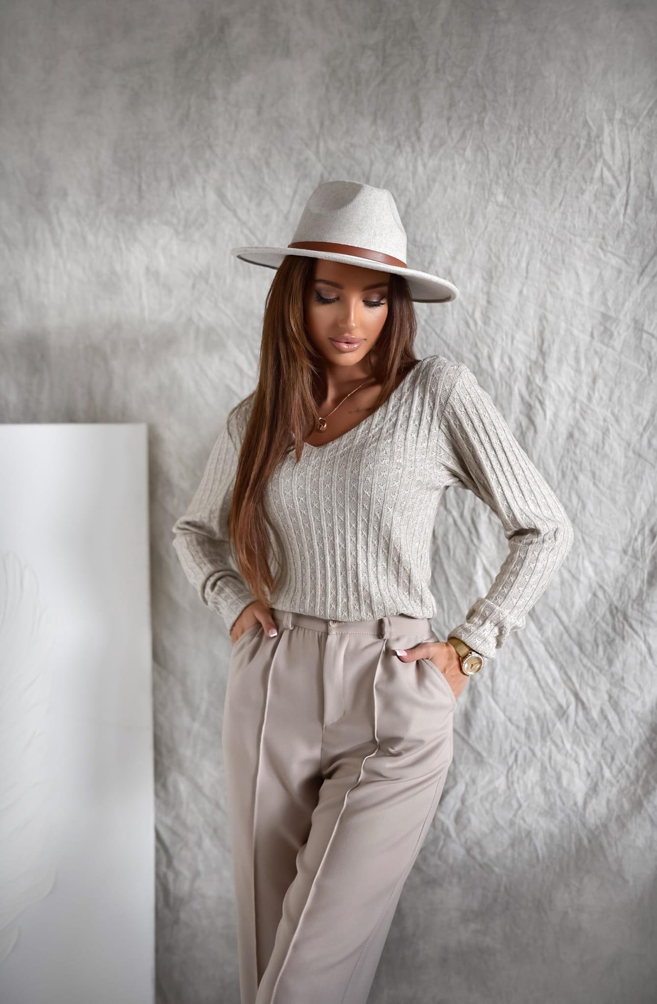Bluzka STEPHANIE w kolorze beżowym z delikatną nitką koloru srebrnego. Bluzka jest sweterkowa, elastyczna w szerszy prążek ze wzorem, z tyłu na plecach ma krzyż. Dekolt w kształcie litery V. Rękawek prosty, dopasowany, bez ściągacza. Krój bluzki prosty, przylegający do sylwetki. Bluzka jest mięciutka i milutka w dotyku, z dodatkiem elastanu, wygodna, niedrapiąca. Może stanowić świetną bazę pod żakiet oraz do spodni z wyższym stanem. Bluzeczka idealna do eleganckich spodni, spódnic, jeansów lub legginsów. Uszyta z bardzo miłego w dotyku materiału.