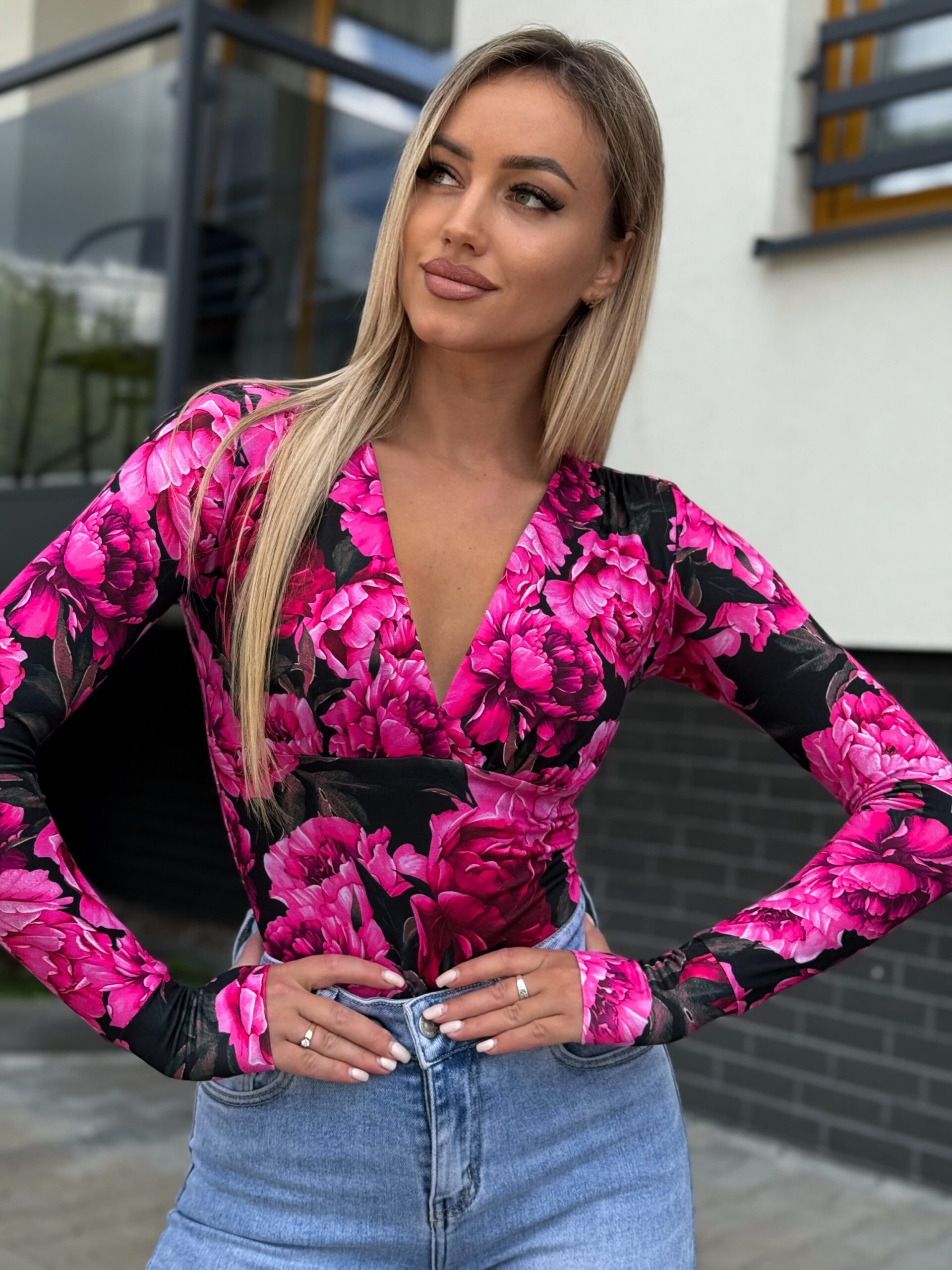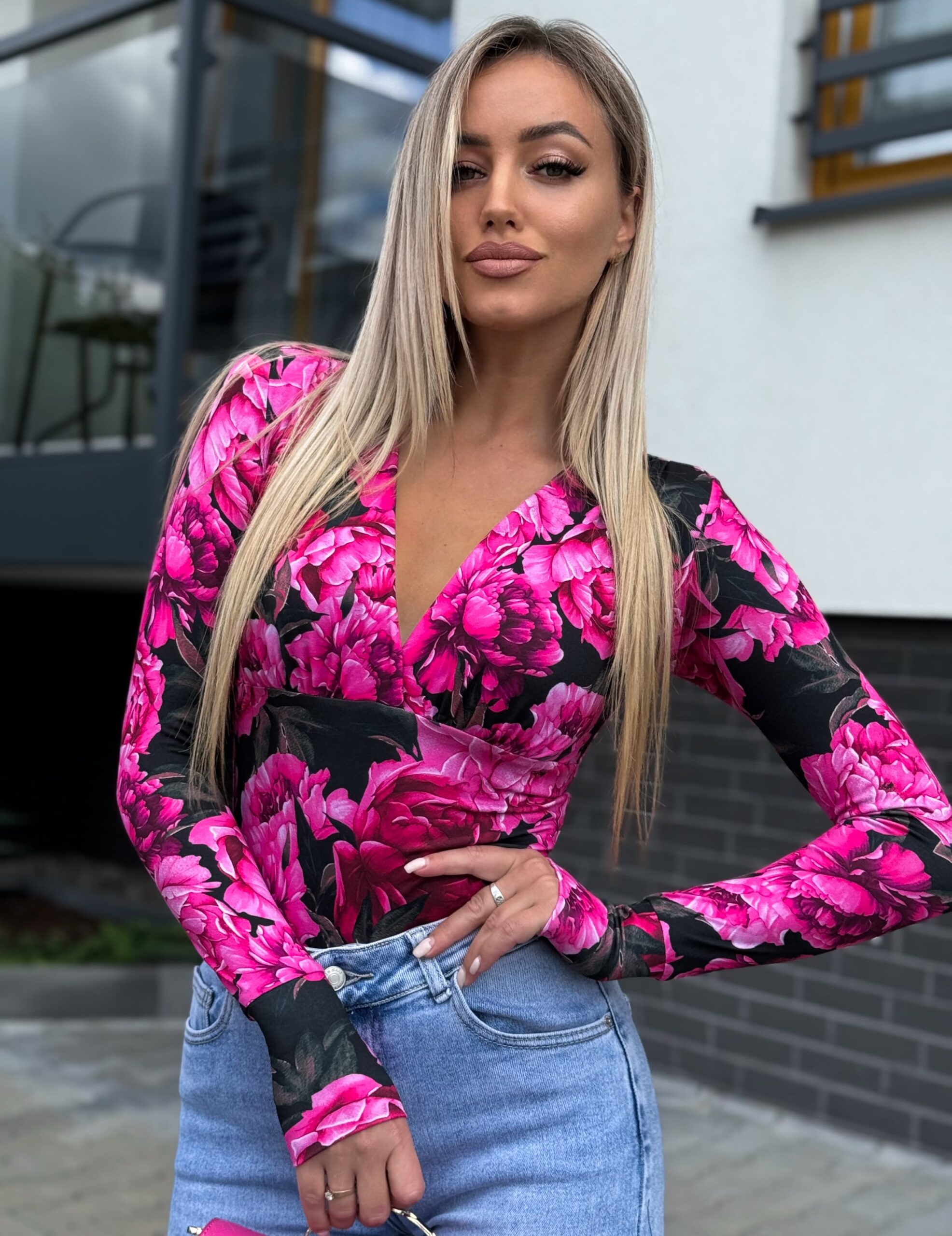 Bluzka w serek Marina – różowe kwiaty na czarnym tle