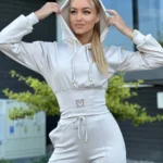 Dwuczęściowy komplet dresowy składa się z bluzy na suwak z kapturem i zaszewkami na rękawach oraz spodni z wysokim stanem. Spodnie mają rozszerzaną nogawkę, boczne kieszenie, troczek w pasie i modne przeszycia w kant.