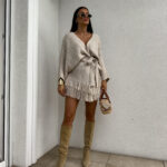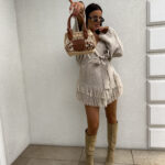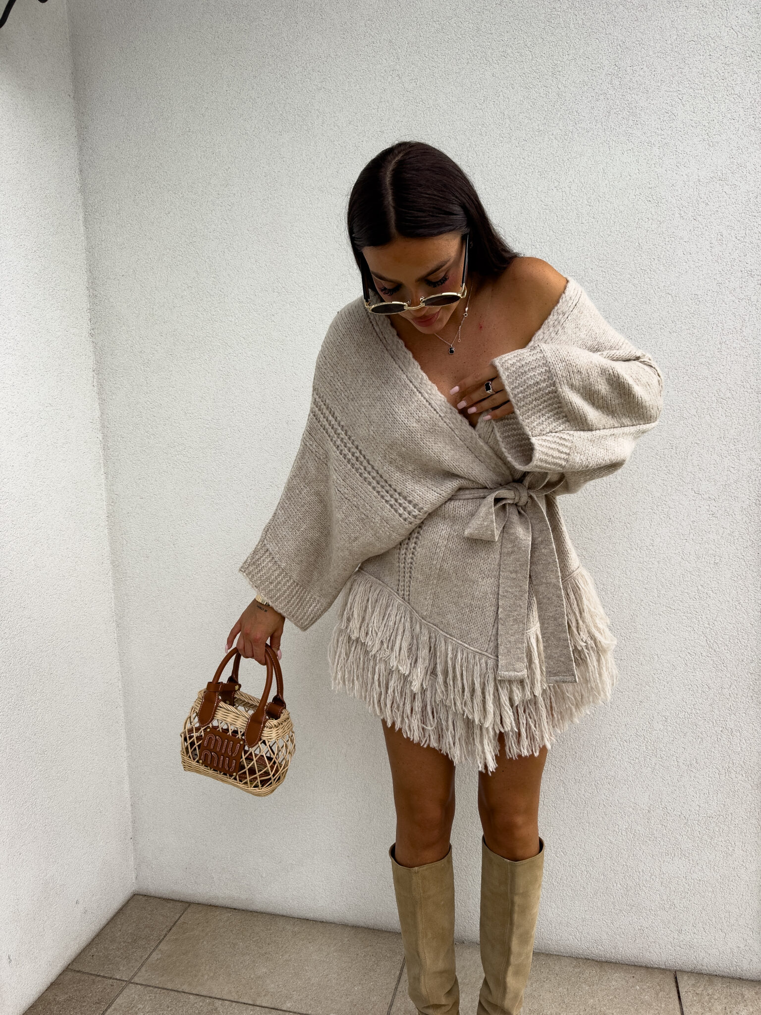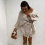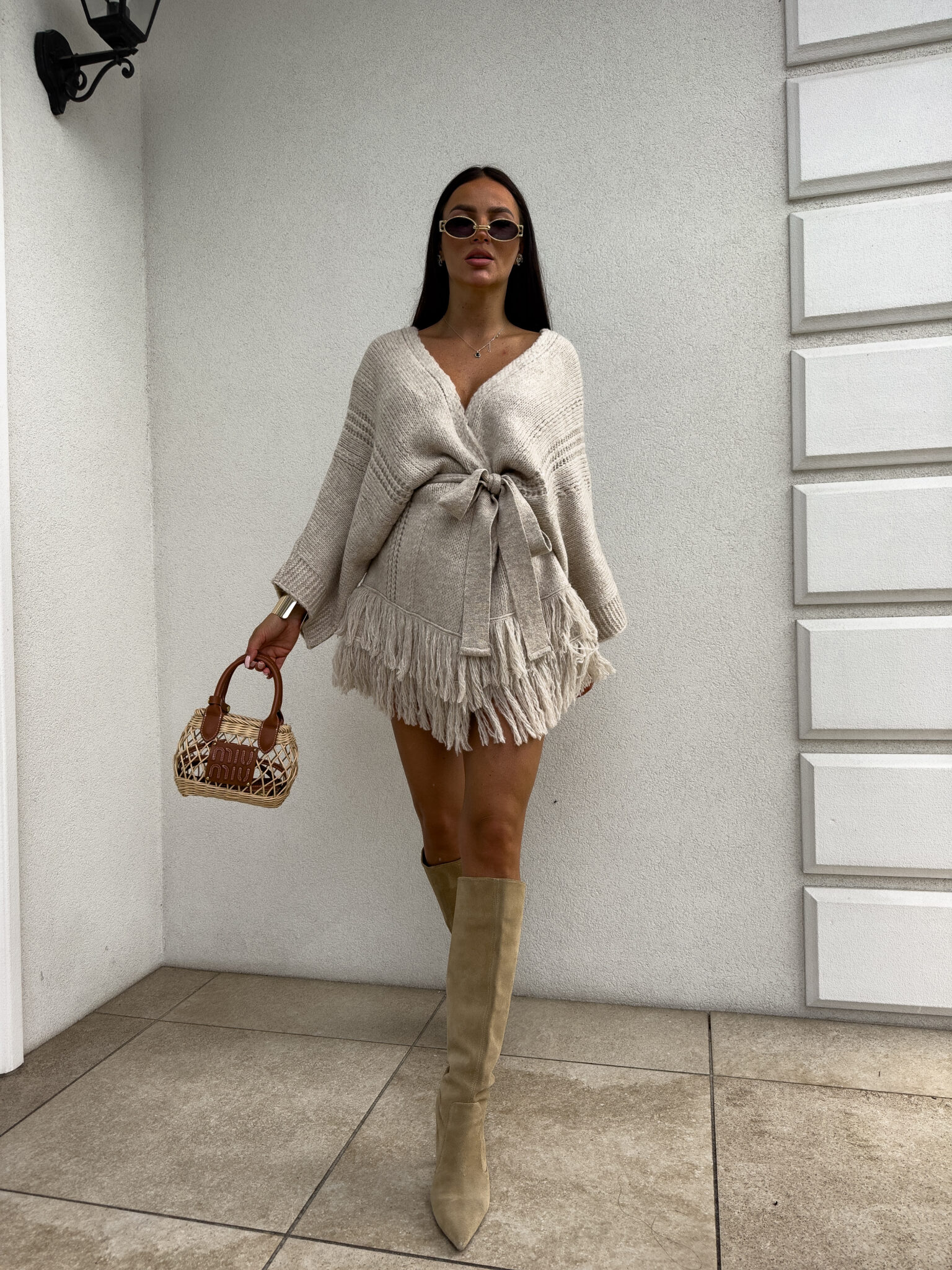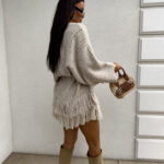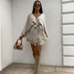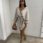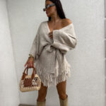 Kardigan ORIANA ma luźny, otwarty fason z paskiem, który podkreśla talię. Dół ozdobiony jest frędzlami. Pasek jest dołączony do kompletu.