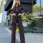 Stylowy kombinezon z kołnierzykiem i efektowną górą zapinaną na złote napy to idealne połączenie elegancji i nowoczesności. Model ma odcięcie w talii, patki na wysokości biustu oraz boczne kieszenie. Rozszerzana nogawka od kolana optycznie wydłuża i wysmukla sylwetkę.