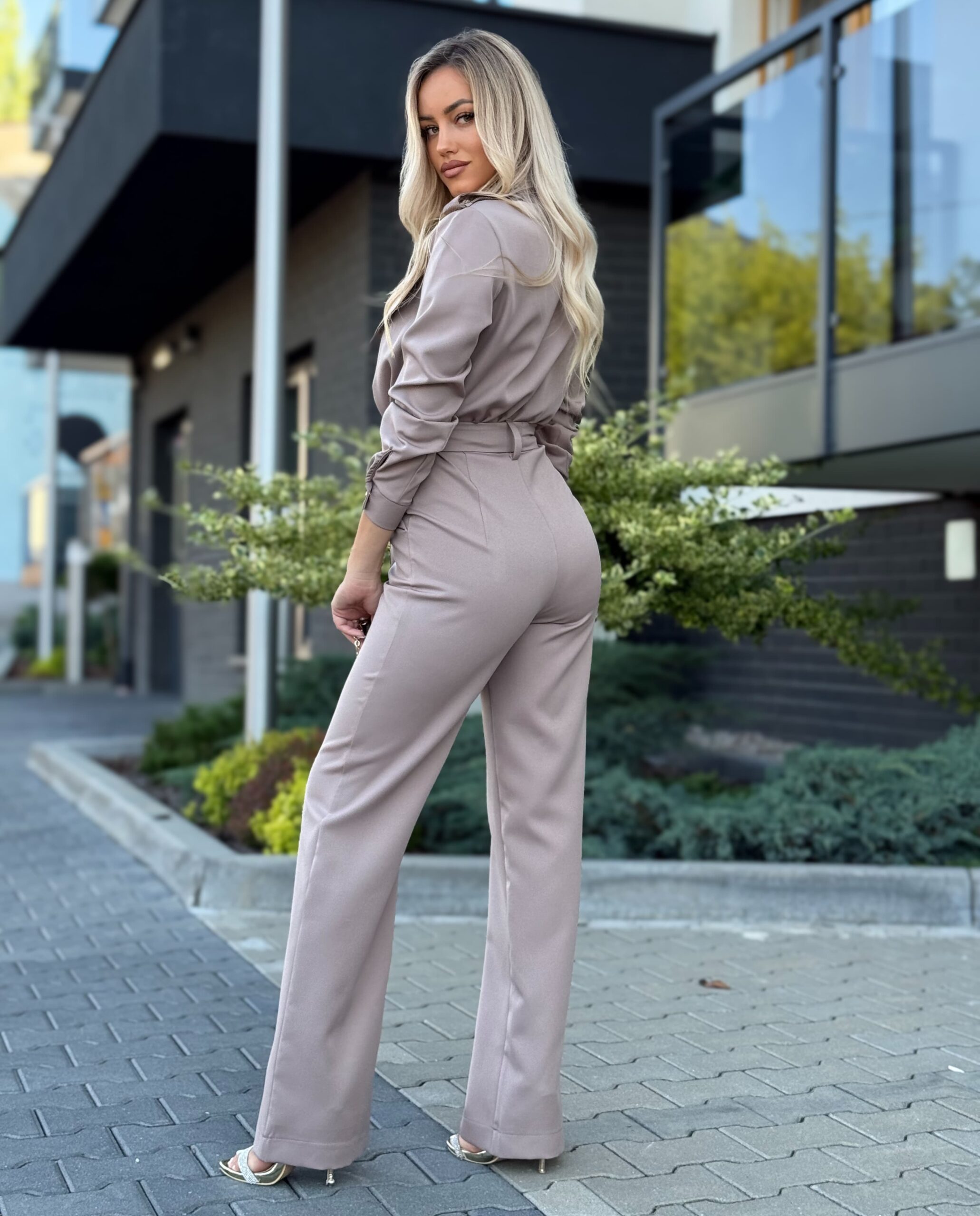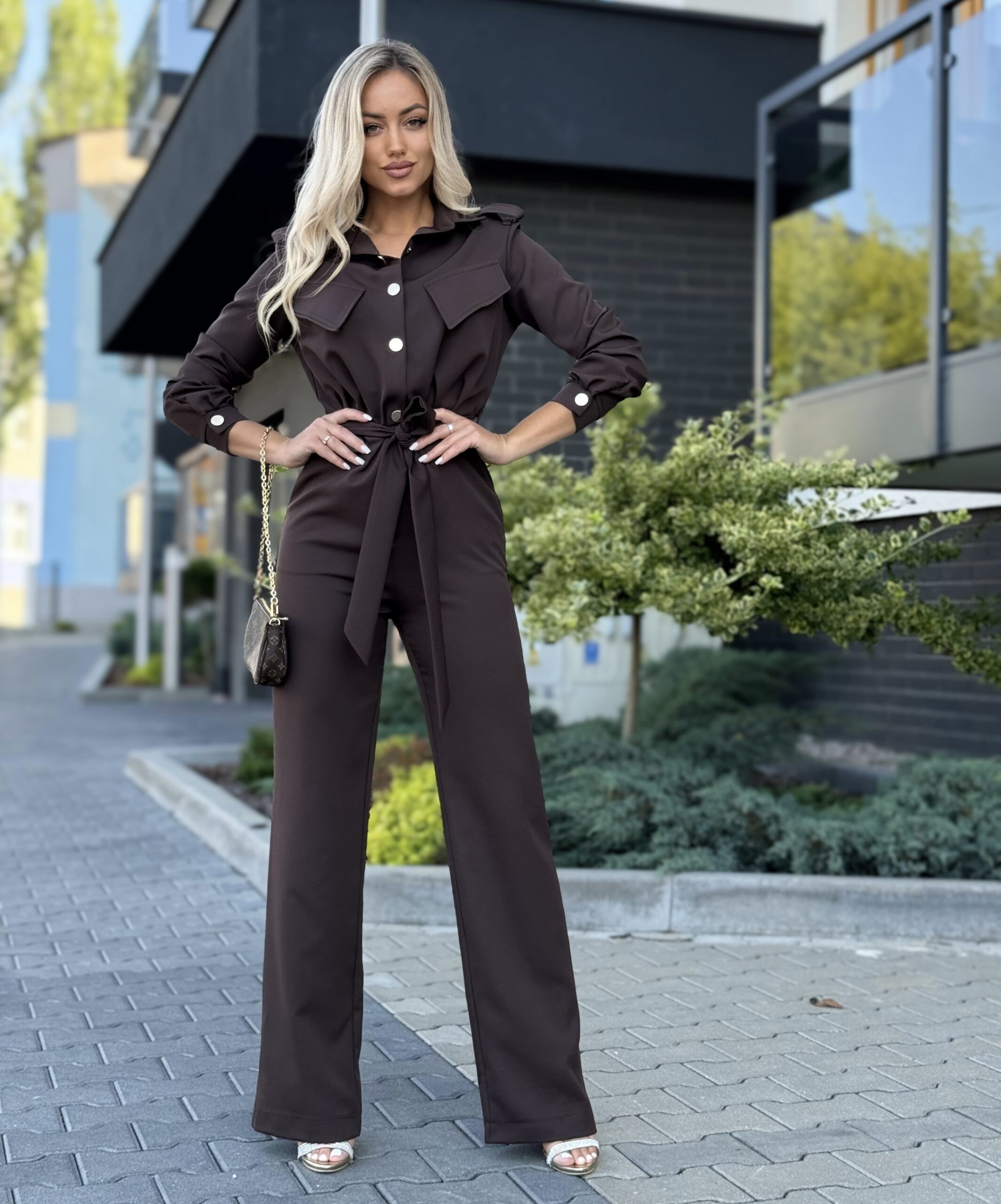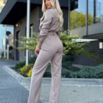 Stylowy kombinezon z kołnierzykiem i efektowną górą zapinaną na złote napy to idealne połączenie elegancji i nowoczesności. Model ma odcięcie w talii, patki na wysokości biustu oraz boczne kieszenie. Rozszerzana nogawka od kolana optycznie wydłuża i wysmukla sylwetkę.