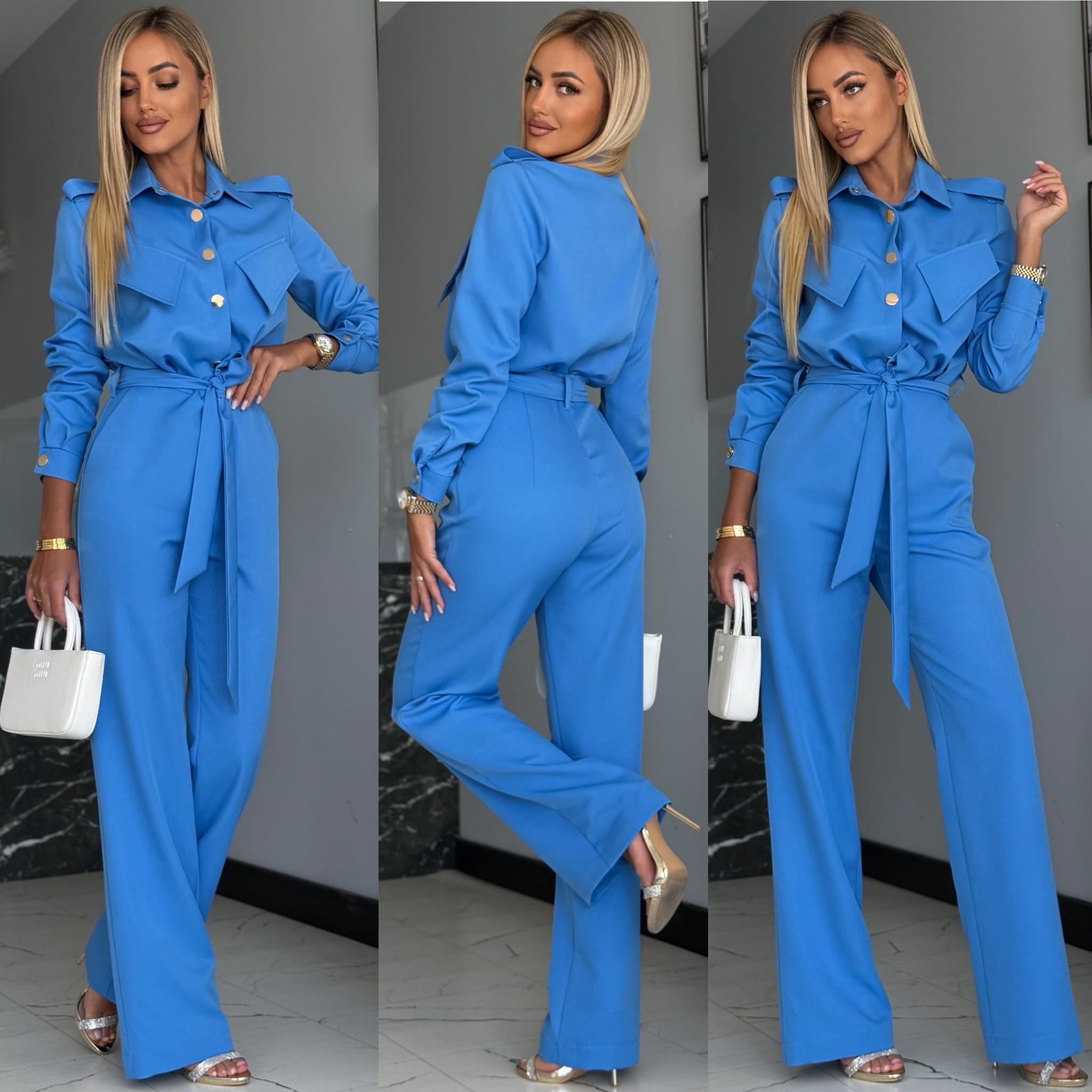 Stylowy kombinezon z kołnierzykiem i efektowną górą zapinaną na złote napy to idealne połączenie elegancji i nowoczesności. Model ma odcięcie w talii, patki na wysokości biustu oraz boczne kieszenie. Rozszerzana nogawka od kolana optycznie wydłuża i wysmukla sylwetkę.