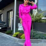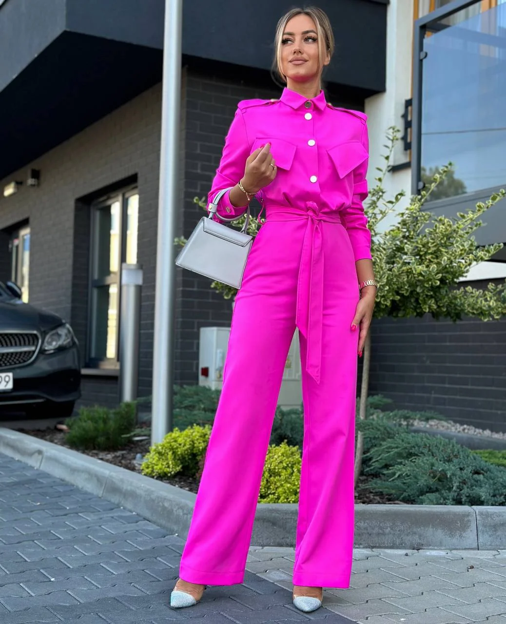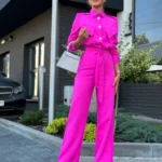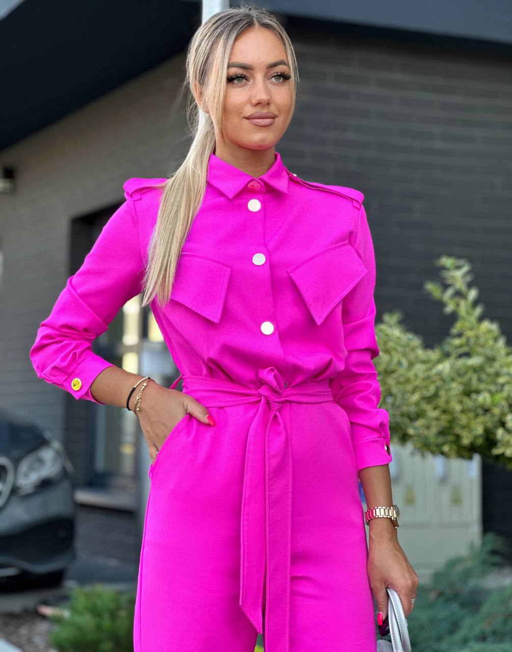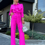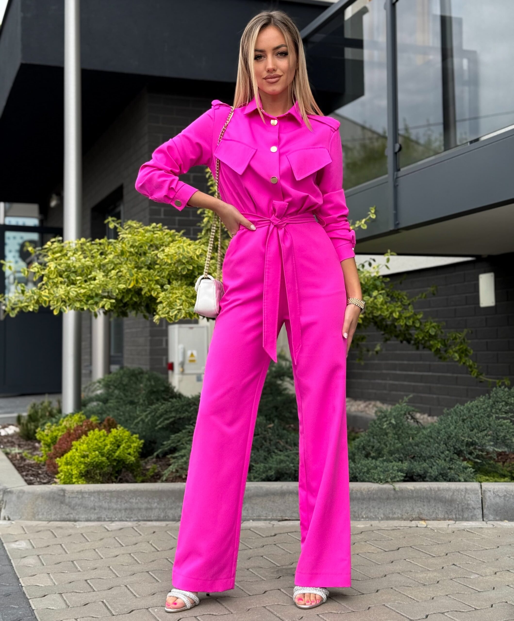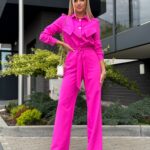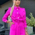 Stylowy kombinezon z kołnierzykiem i efektowną górą zapinaną na złote napy to idealne połączenie elegancji i nowoczesności. Model ma odcięcie w talii, patki na wysokości biustu oraz boczne kieszenie. Rozszerzana nogawka od kolana optycznie wydłuża i wysmukla sylwetkę.