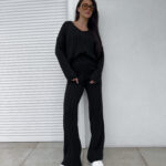 Komplet CANDICE składa się z oversize’owego swetra z długimi rękawami oraz spodni z wysokim stanem, wykonanych z miękkiej, przyjemnej w dotyku dzianiny. Sweter zakładany przez głowę ma dekolt w serek i ozdobne pionowe przeszycia, a spodnie z szerokimi nogawkami wyróżniają się pionowym wzorem.