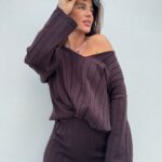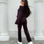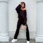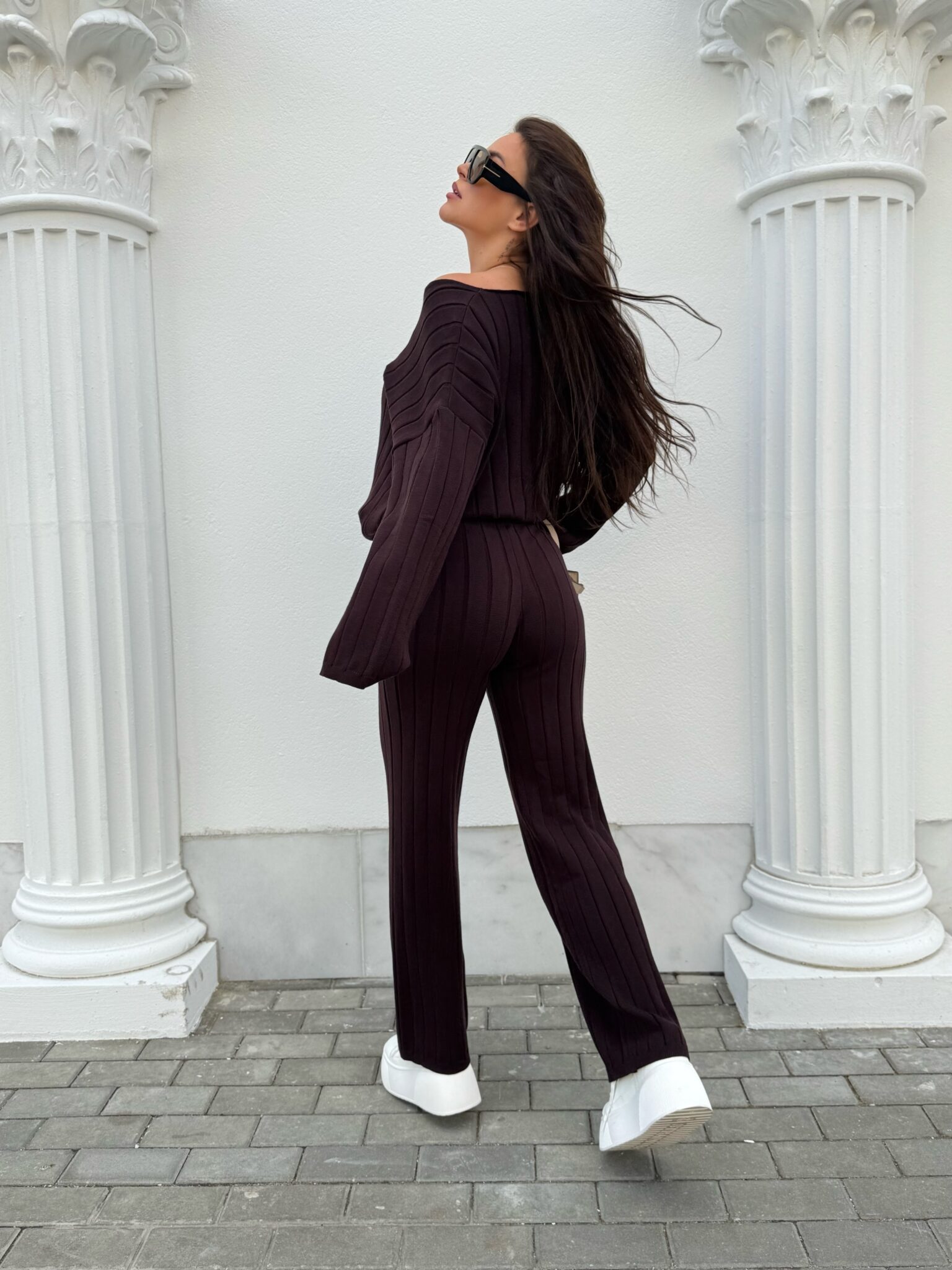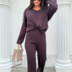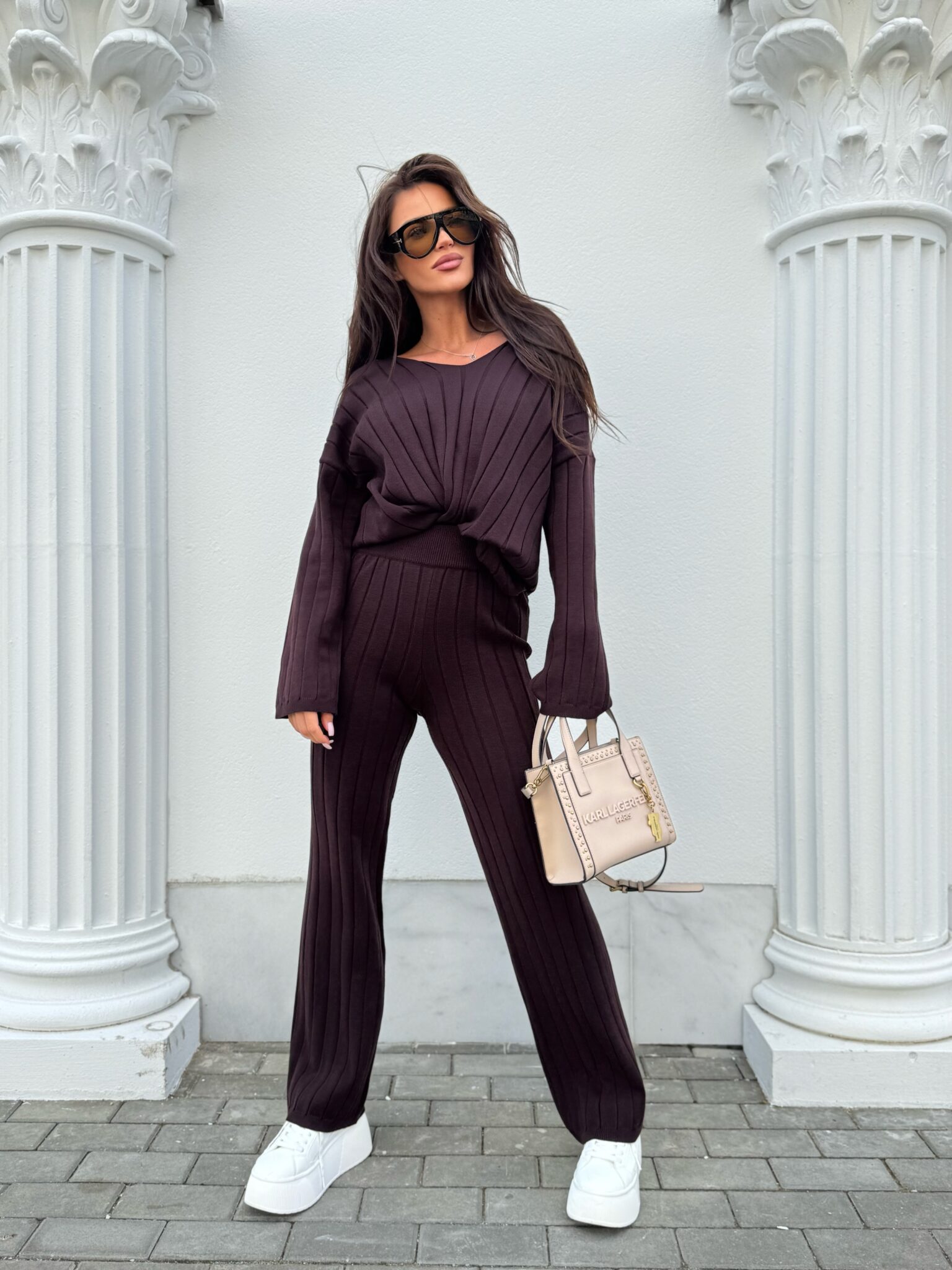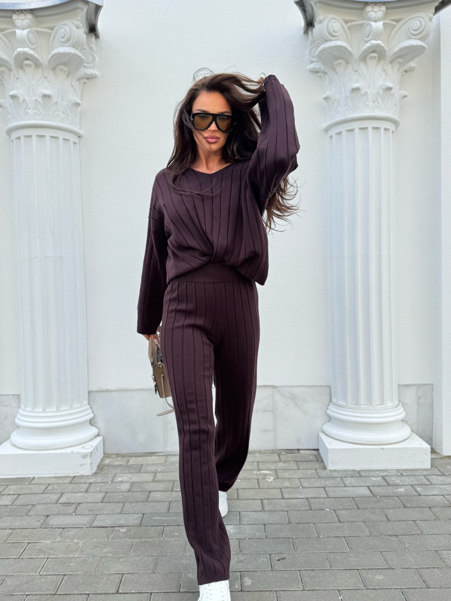 Komplet CANDICE składa się z oversize’owego swetra z długimi rękawami oraz spodni z wysokim stanem, wykonanych z miękkiej, przyjemnej w dotyku dzianiny. Sweter zakładany przez głowę ma dekolt w serek i ozdobne pionowe przeszycia, a spodnie z szerokimi nogawkami wyróżniają się pionowym wzorem.