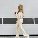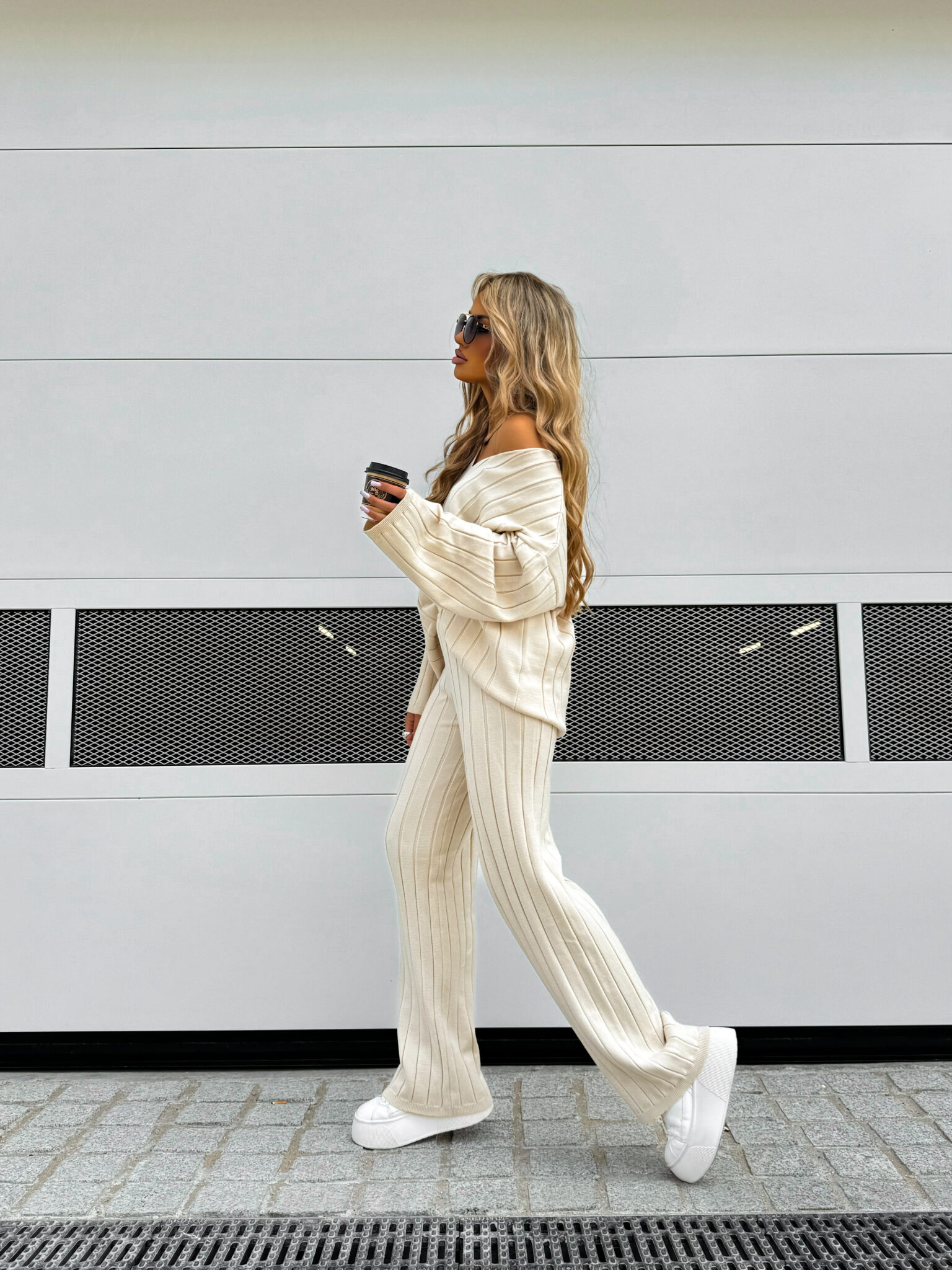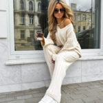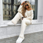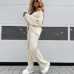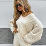 Komplet CANDICE składa się z oversize’owego swetra z długimi rękawami oraz spodni z wysokim stanem, wykonanych z miękkiej, przyjemnej w dotyku dzianiny. Sweter zakładany przez głowę ma dekolt w serek i ozdobne pionowe przeszycia, a spodnie z szerokimi nogawkami wyróżniają się pionowym wzorem.