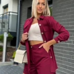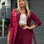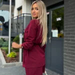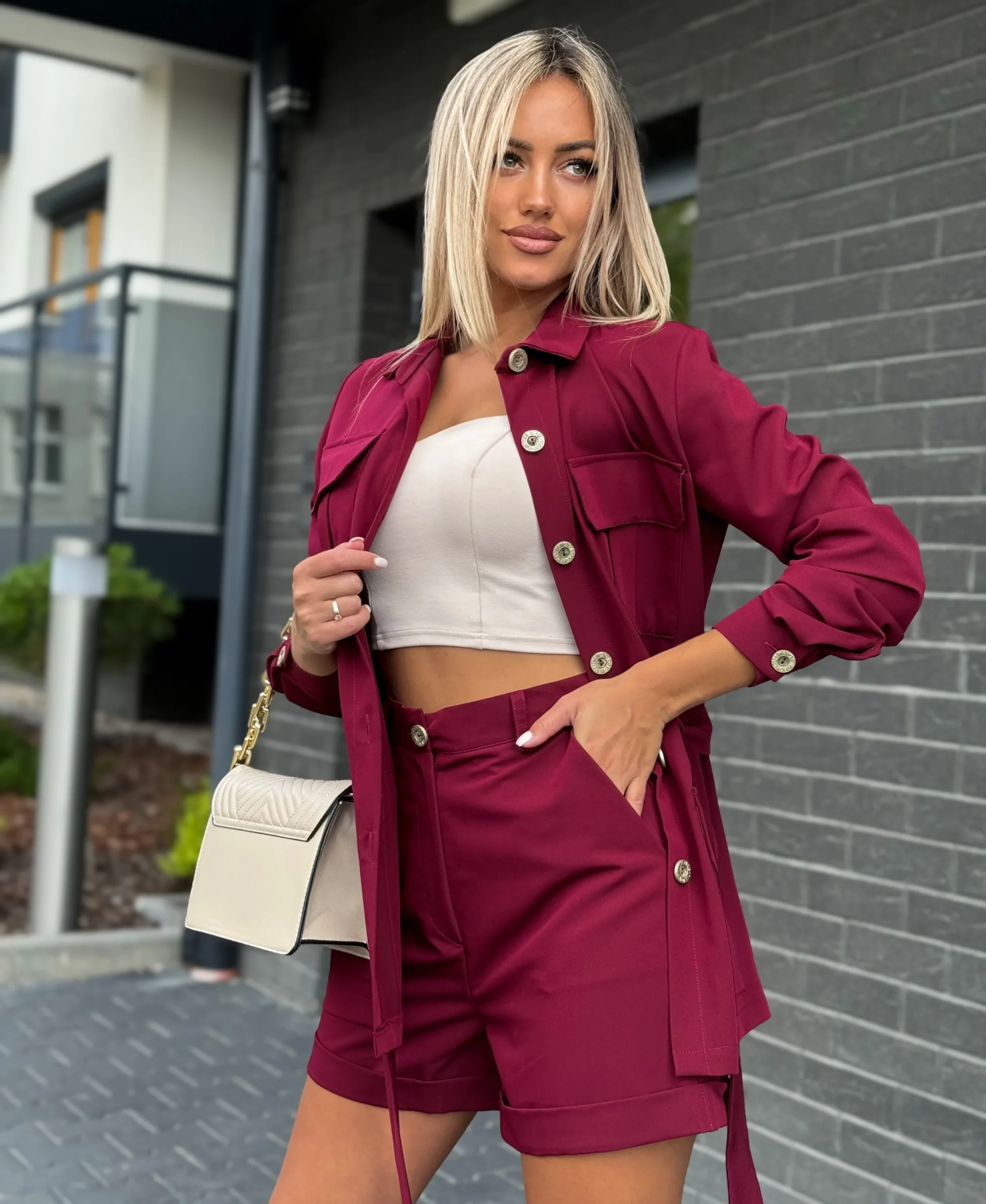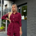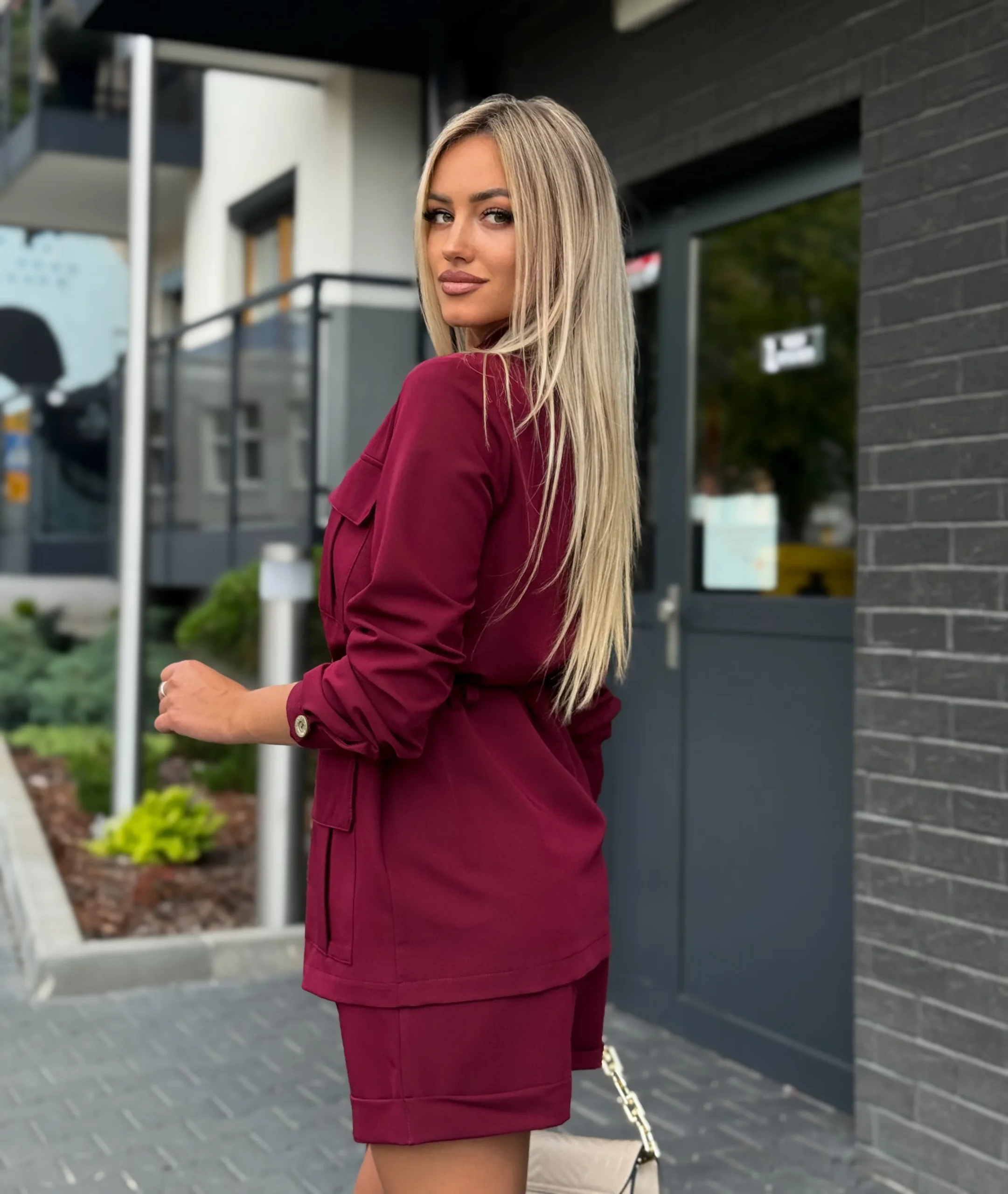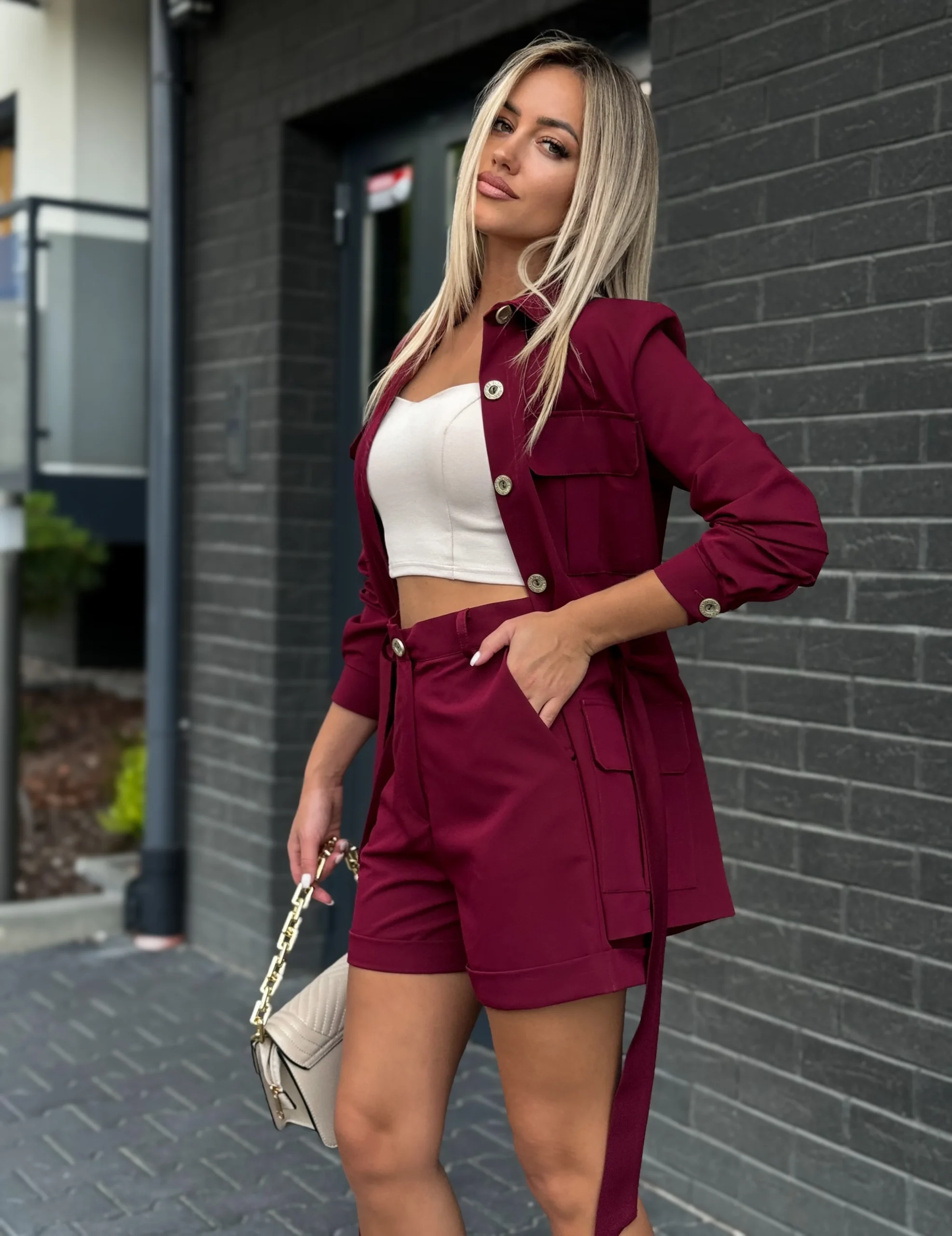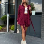 Elegancki komplet składa się z luźnego żakietu z wiązaniem w pasie, które pięknie podkreśla talię, oraz modnych szortów o lekkim charakterze. Duże kieszenie w żakiecie dodają całości stylowego i nowoczesnego wyglądu.