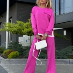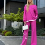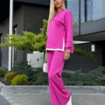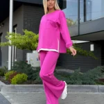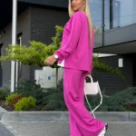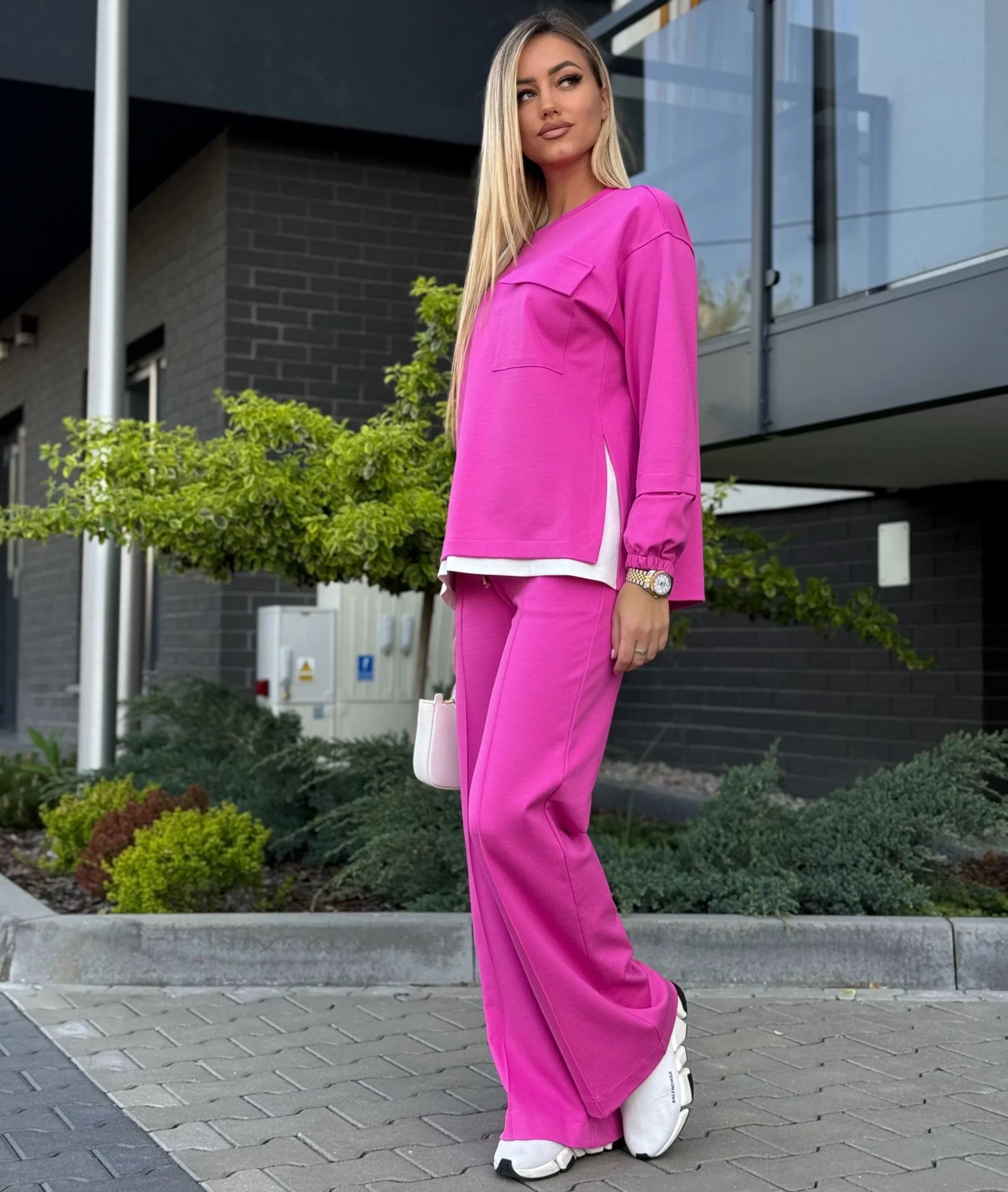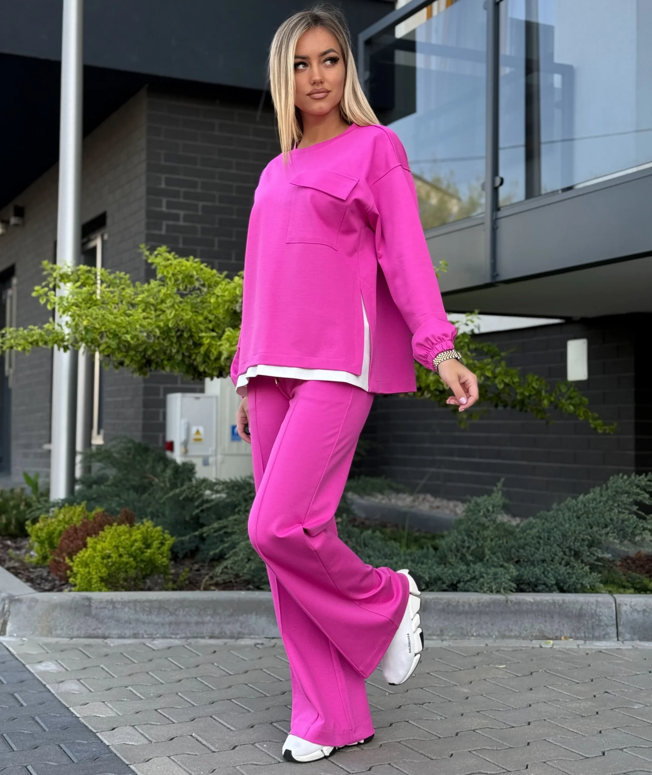 Komplet dresowy składa się z luźnej bluzy wykończonej od spodu białym materiałem oraz spodni z wysokim stanem i swobodnym krojem. To wygodna i stylowa propozycja na co dzień.