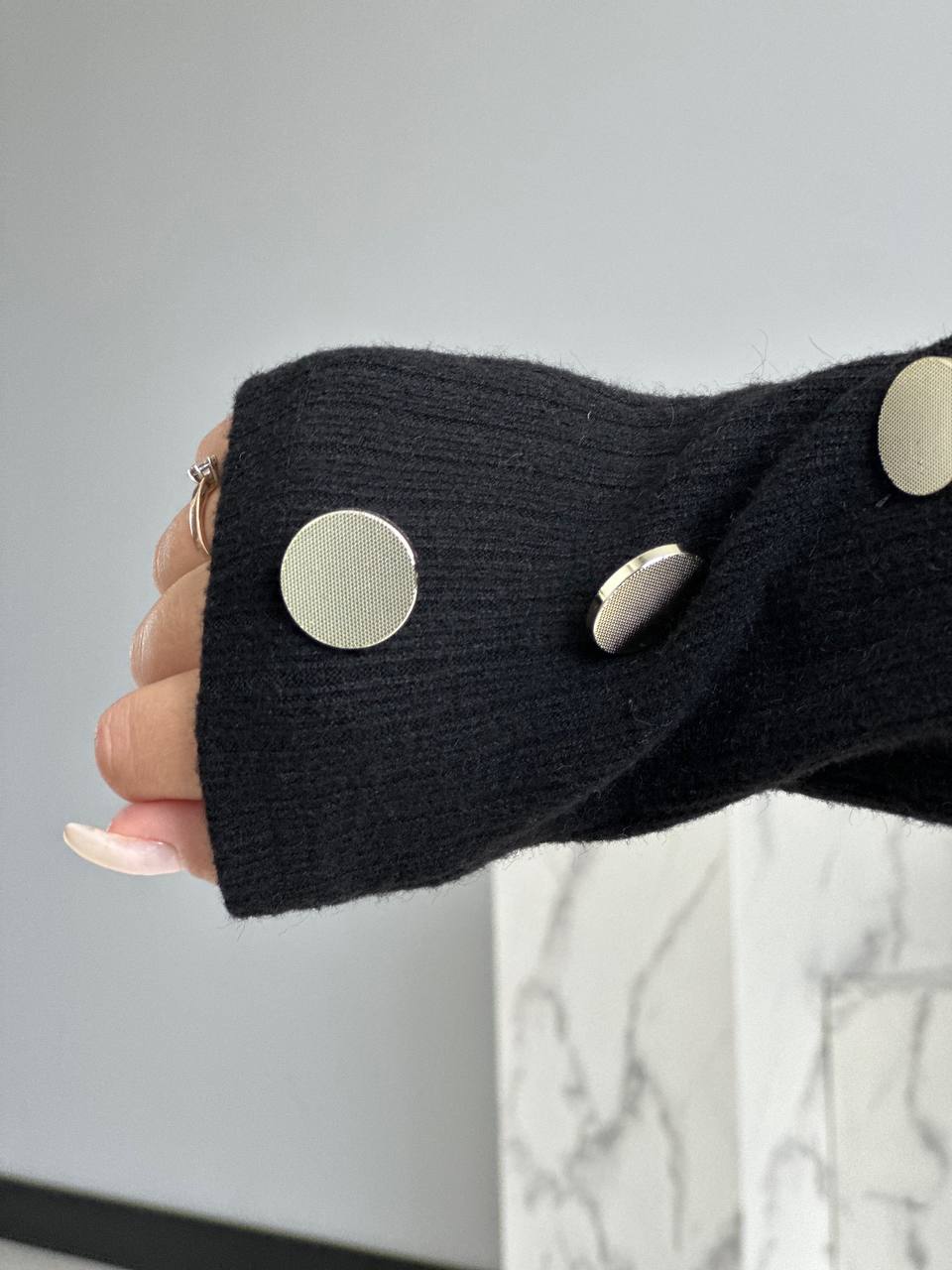 Dzianinowy komplet wykonany z wysokiej jakości materiałów zapewnia trwałość i komfort noszenia. W zestawie znajduje się spódnica z elastycznym ściągaczem w pasie oraz wygodny sweter z ozdobnymi, złotymi guzikami na mankietach. To stylowa i praktyczna propozycja na wiele okazji.
