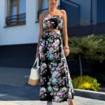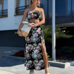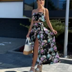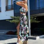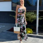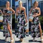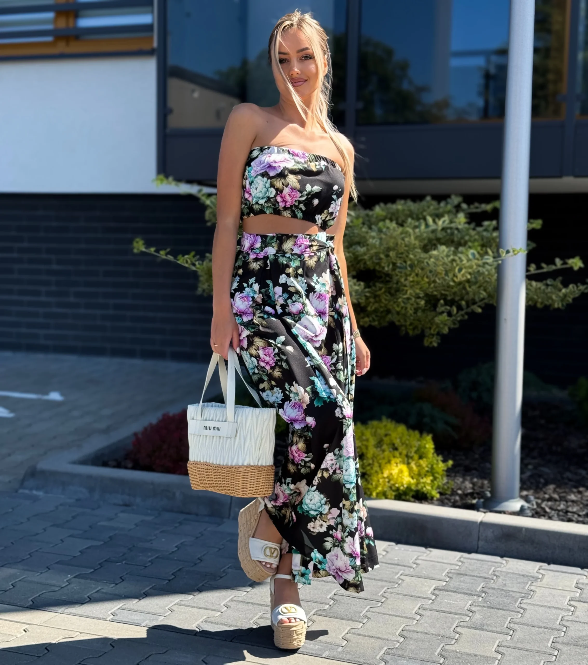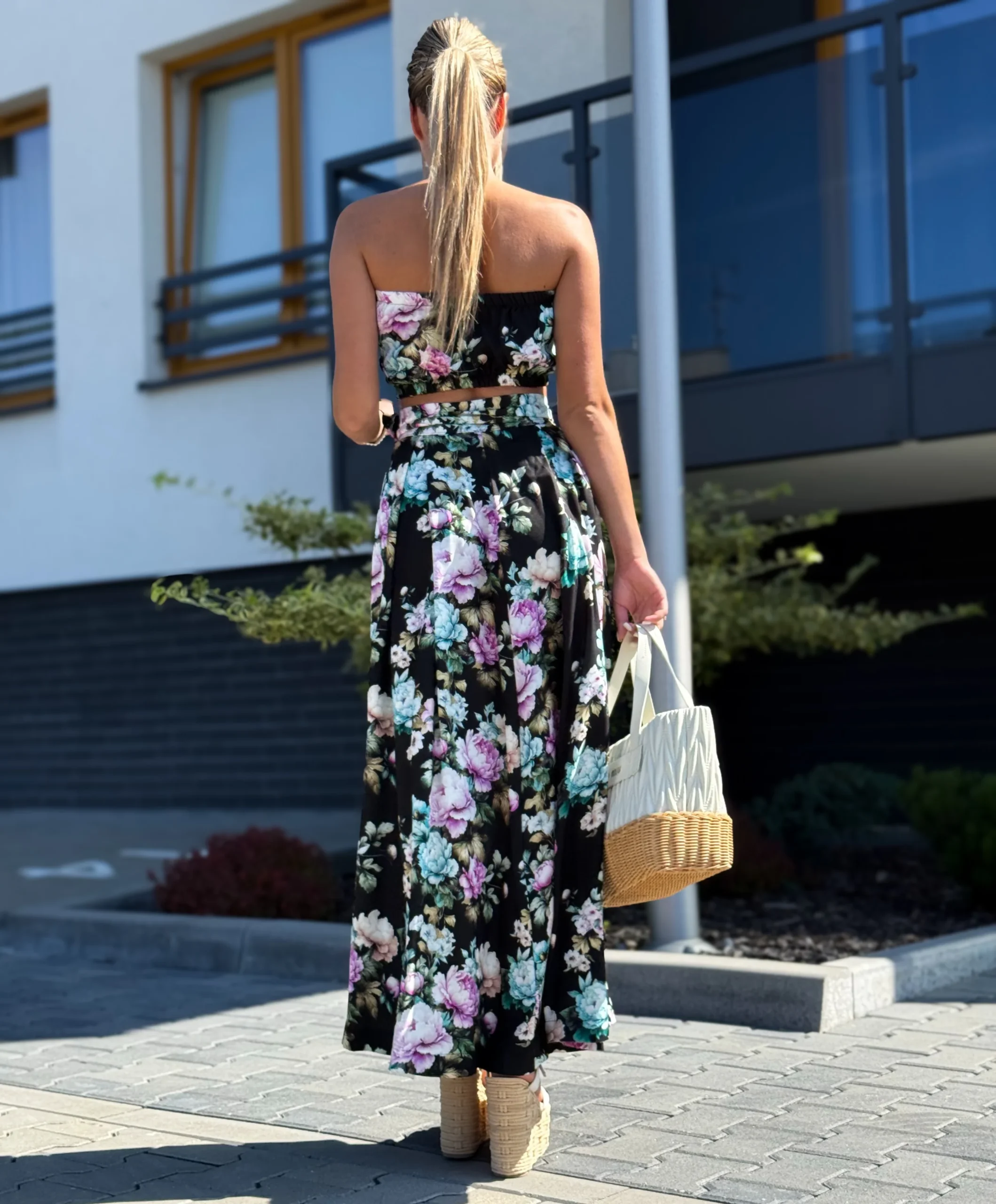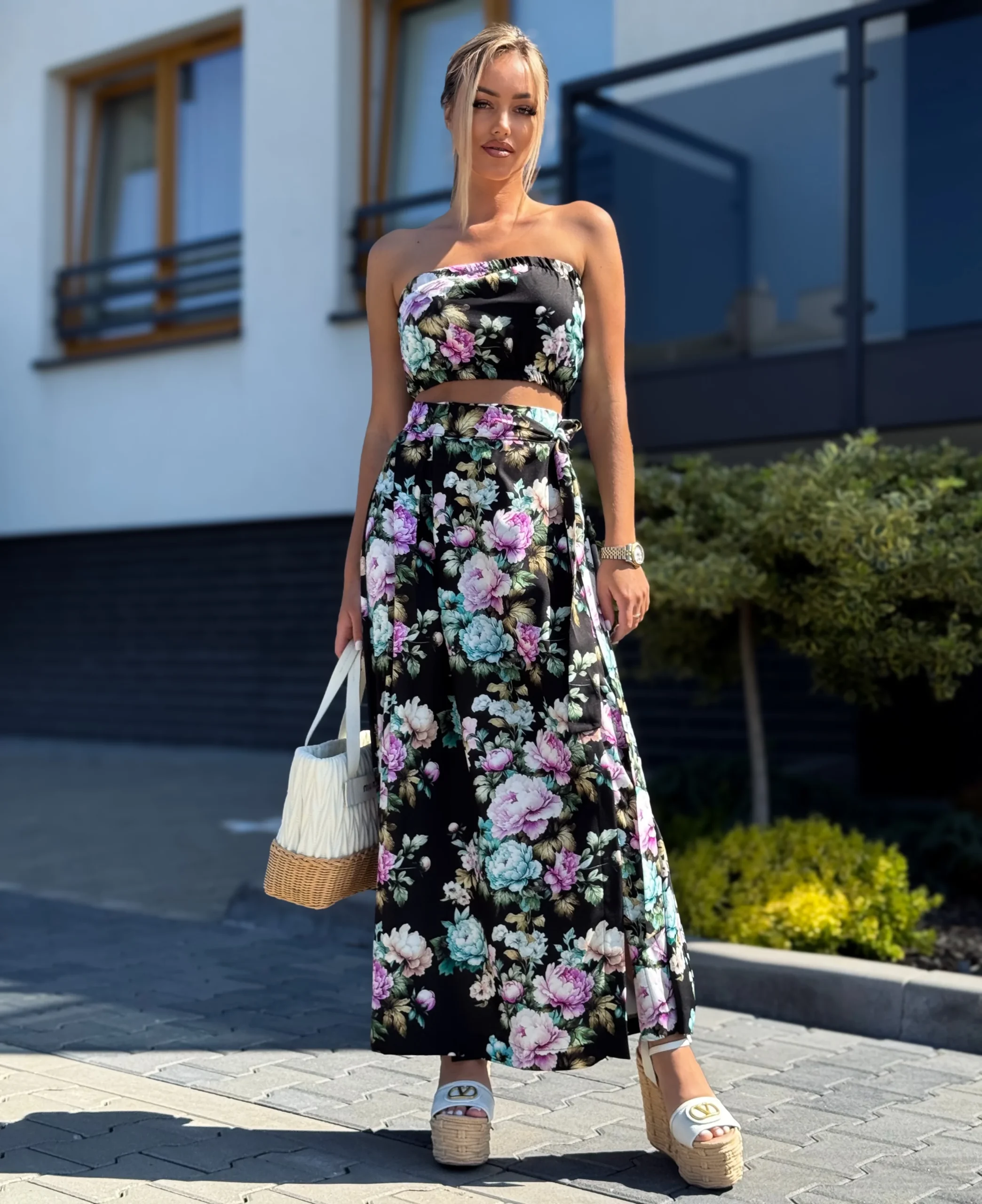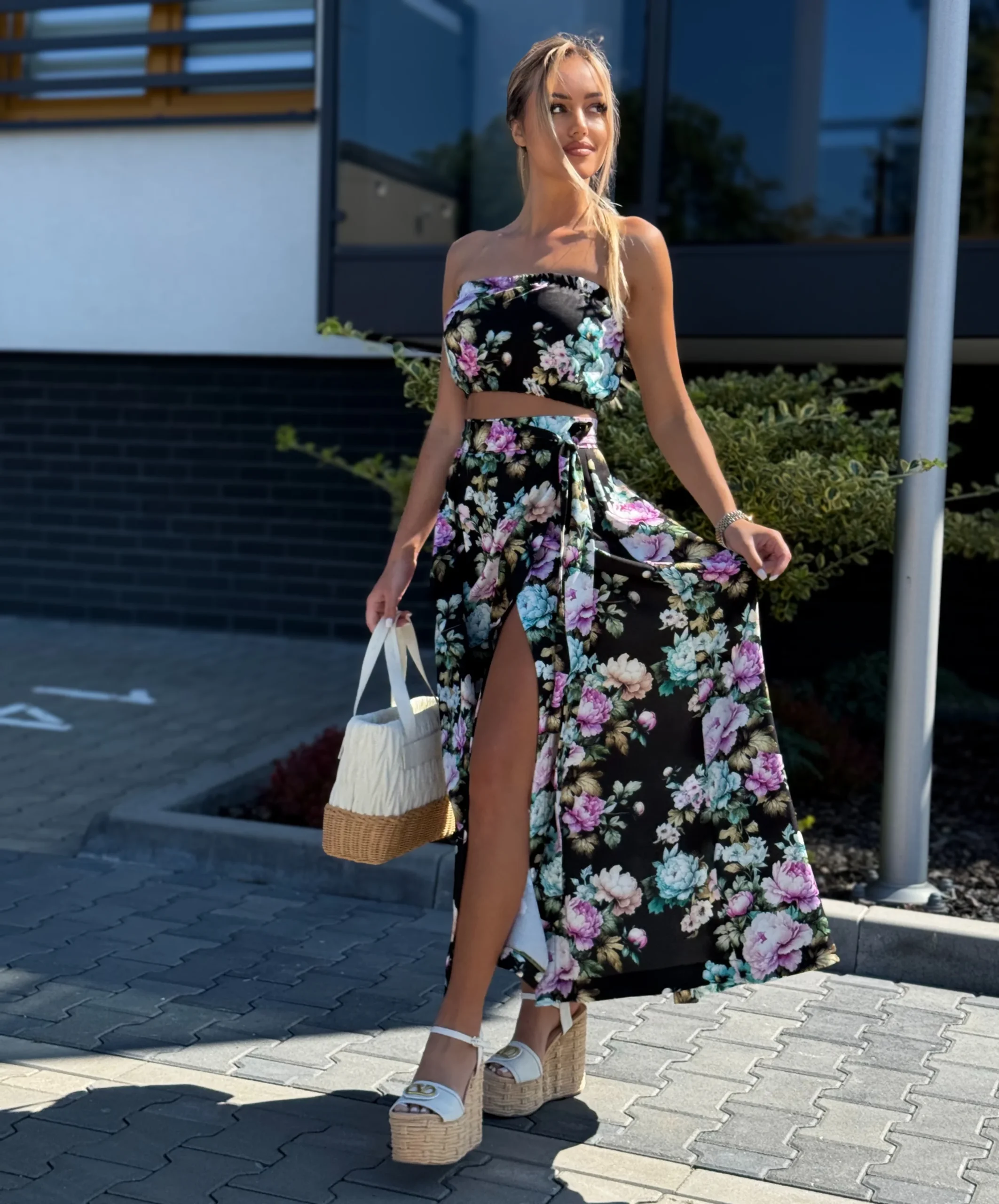 Komplet LORIS składa się z topu z gumką, który dopasowuje się do sylwetki, oraz spódnicy midi z modnym wiązaniem i rozcięciami na nogi. Pasek w talii pozwala na regulację i idealne dopasowanie.