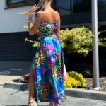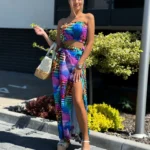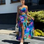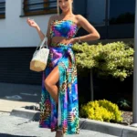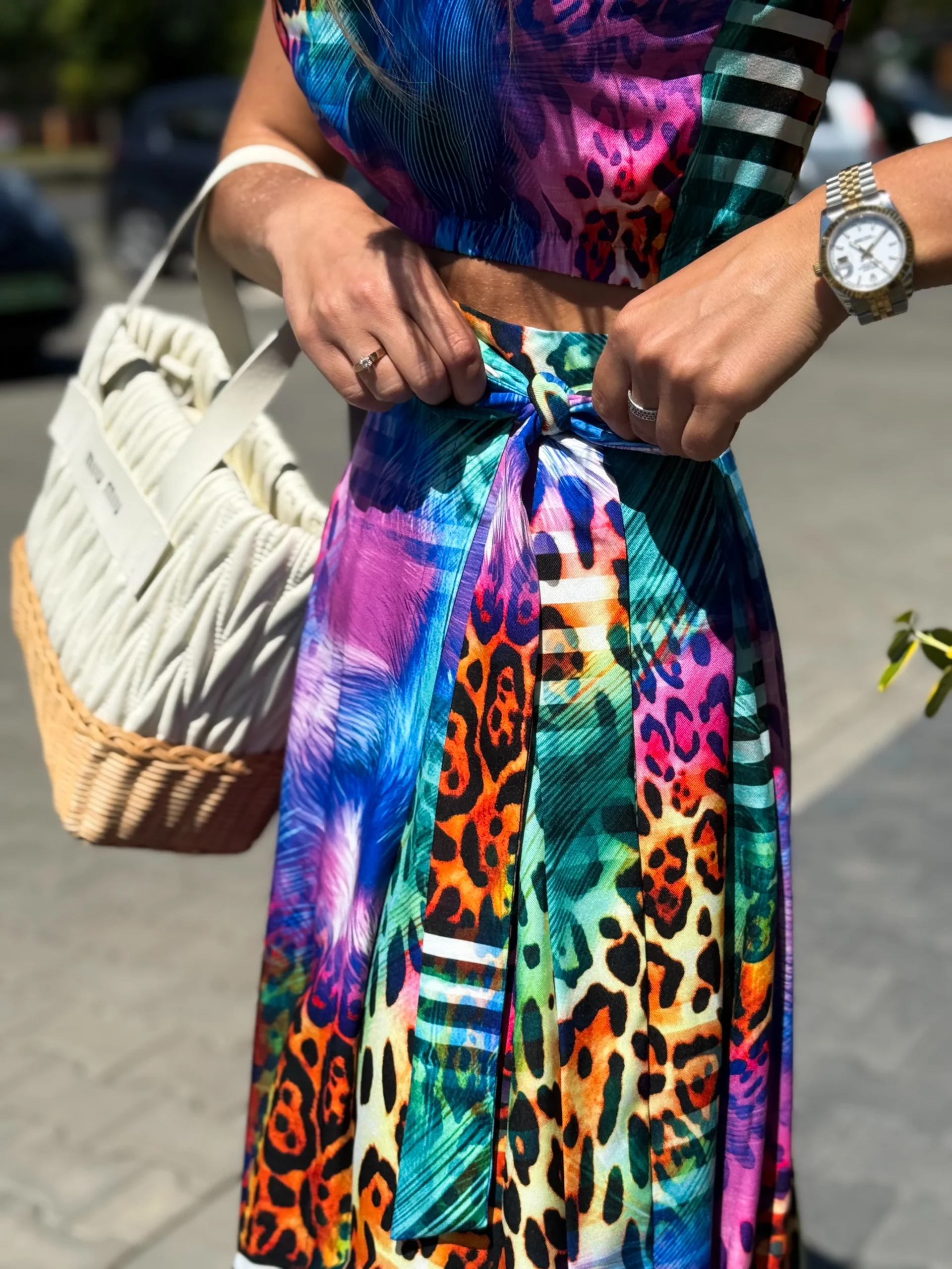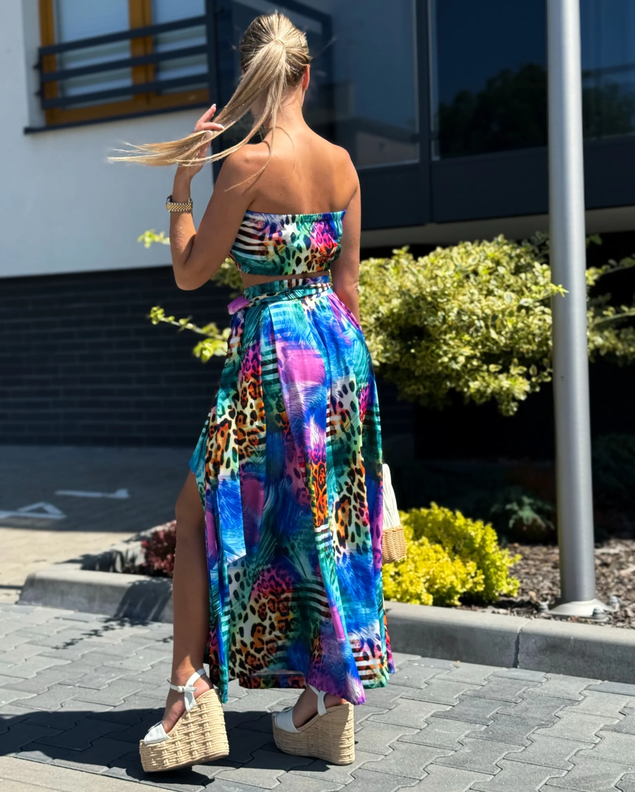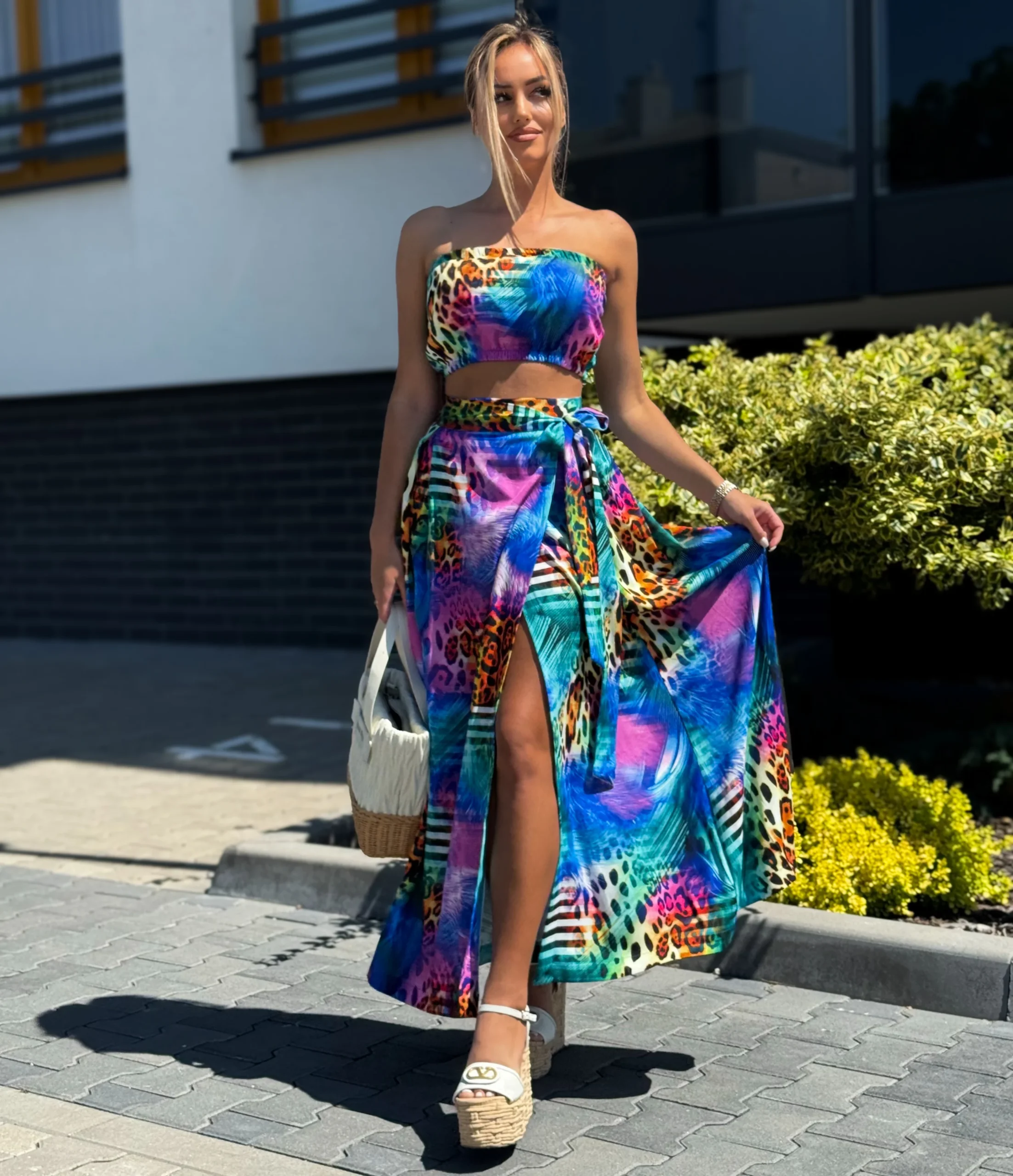 Komplet LORIS składa się z topu z gumką, który dopasowuje się do sylwetki, oraz spódnicy midi z modnym wiązaniem i rozcięciami na nogi. Pasek w talii pozwala na regulację i idealne dopasowanie.