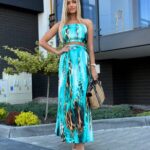 Komplet LORIS składa się z topu z gumką, który dopasowuje się do sylwetki, oraz spódnicy midi z modnym wiązaniem i rozcięciami na nogi. Pasek w talii pozwala na regulację i idealne dopasowanie.