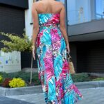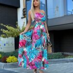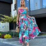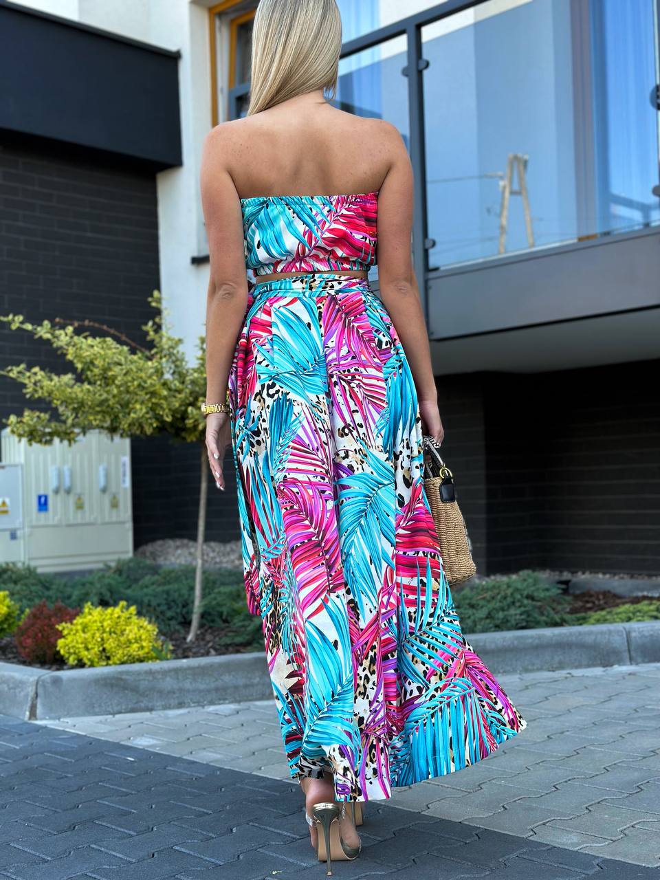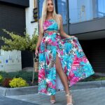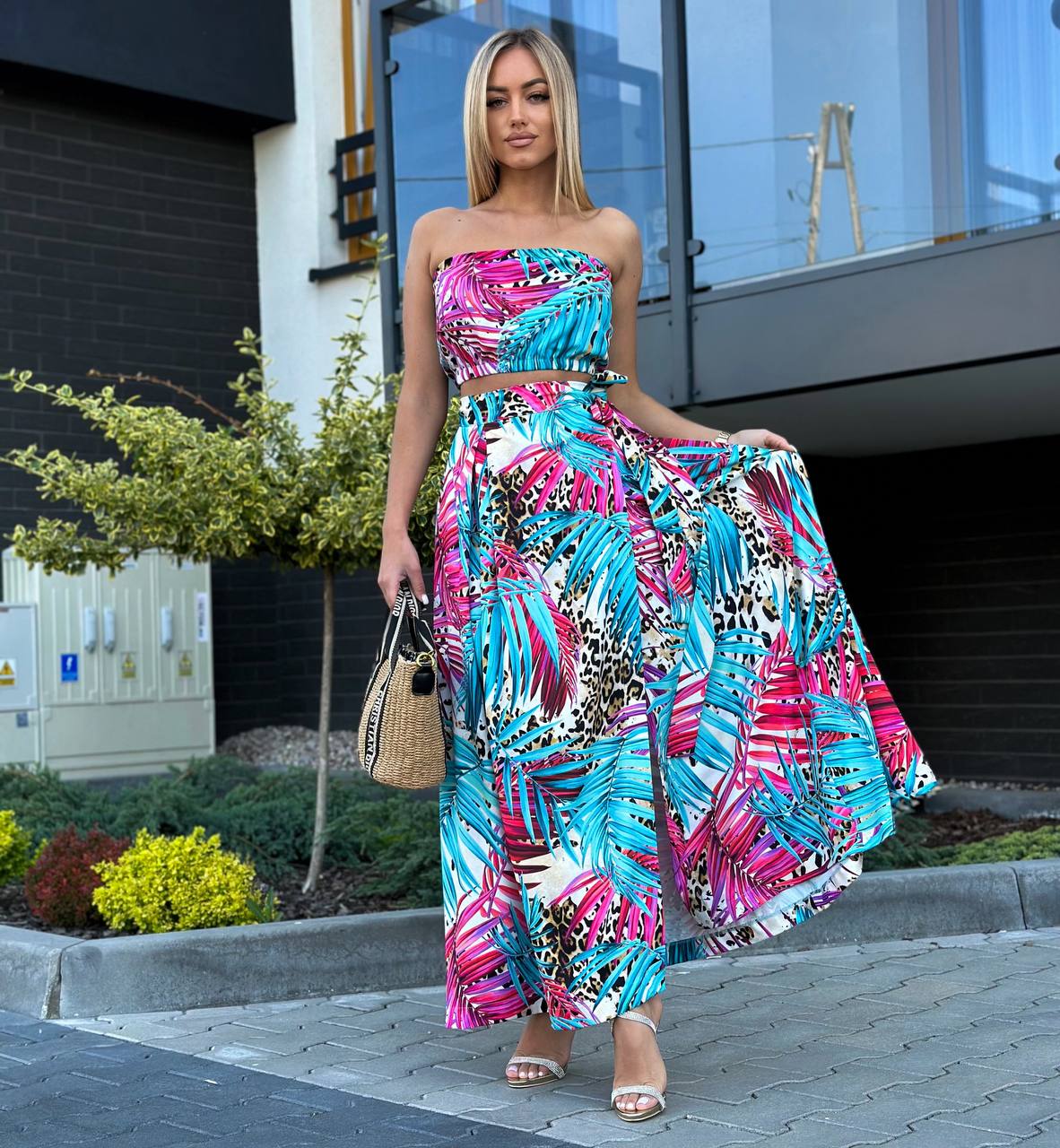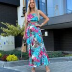 Komplet LORIS składa się z topu z gumką, który dopasowuje się do sylwetki, oraz spódnicy midi z modnym wiązaniem i rozcięciami na nogi. Pasek w talii pozwala na regulację i idealne dopasowanie.
