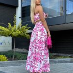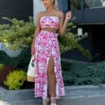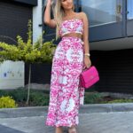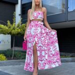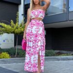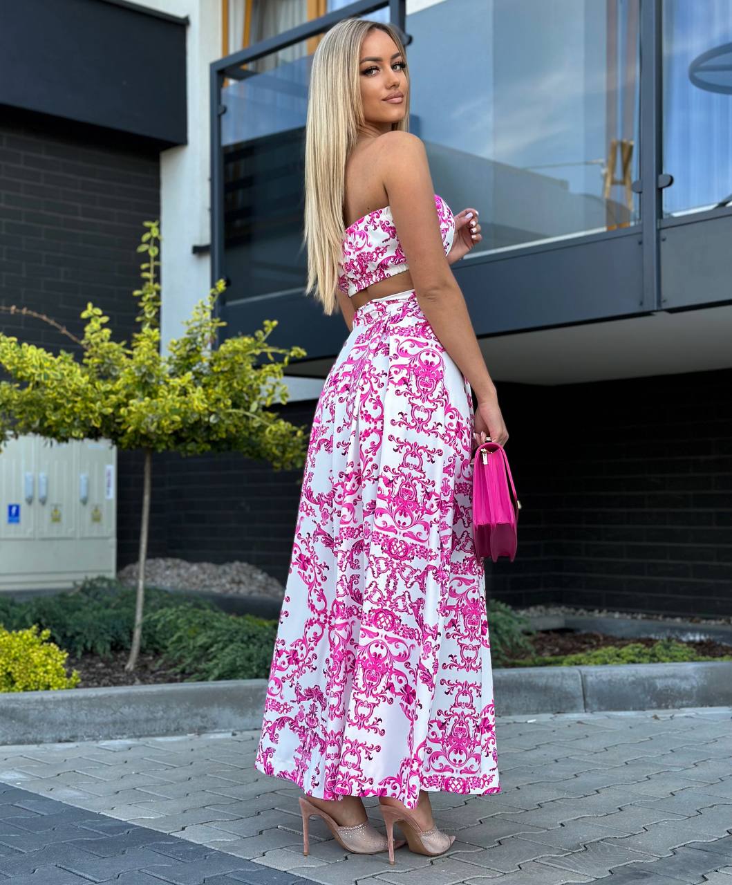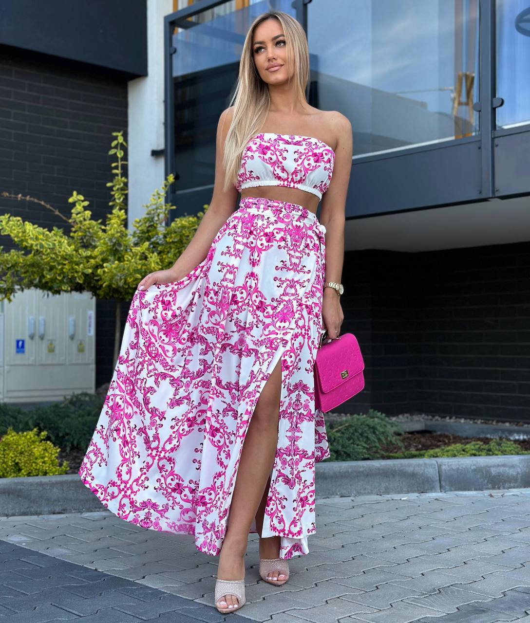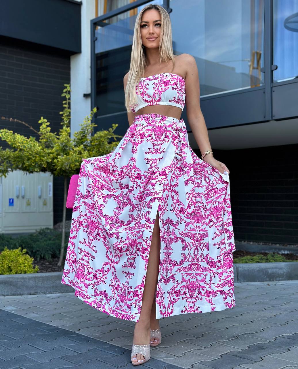 Komplet LORIS składa się z topu z gumką, który dopasowuje się do sylwetki, oraz spódnicy midi z modnym wiązaniem i rozcięciami na nogi. Pasek w talii pozwala na regulację i idealne dopasowanie.