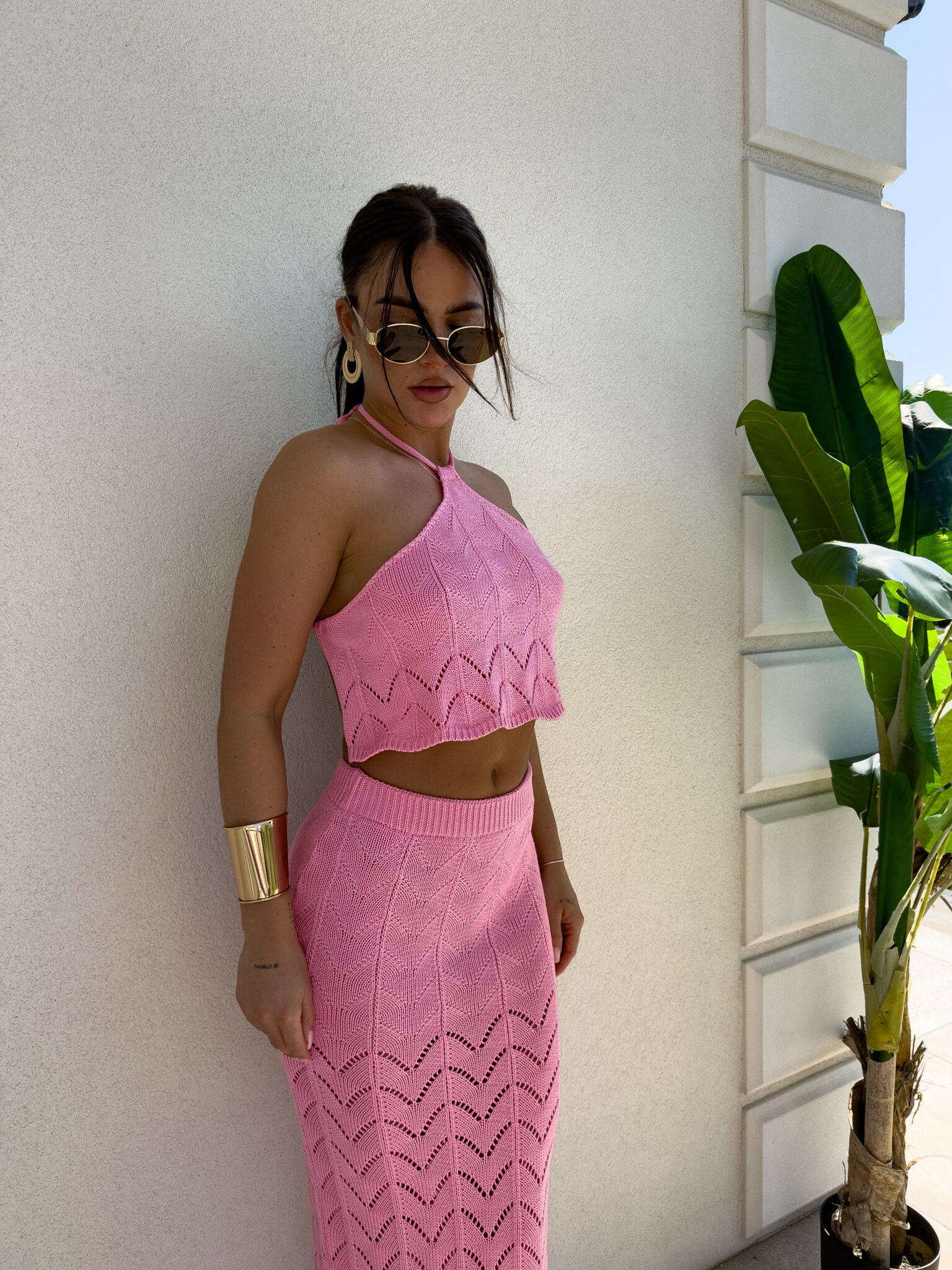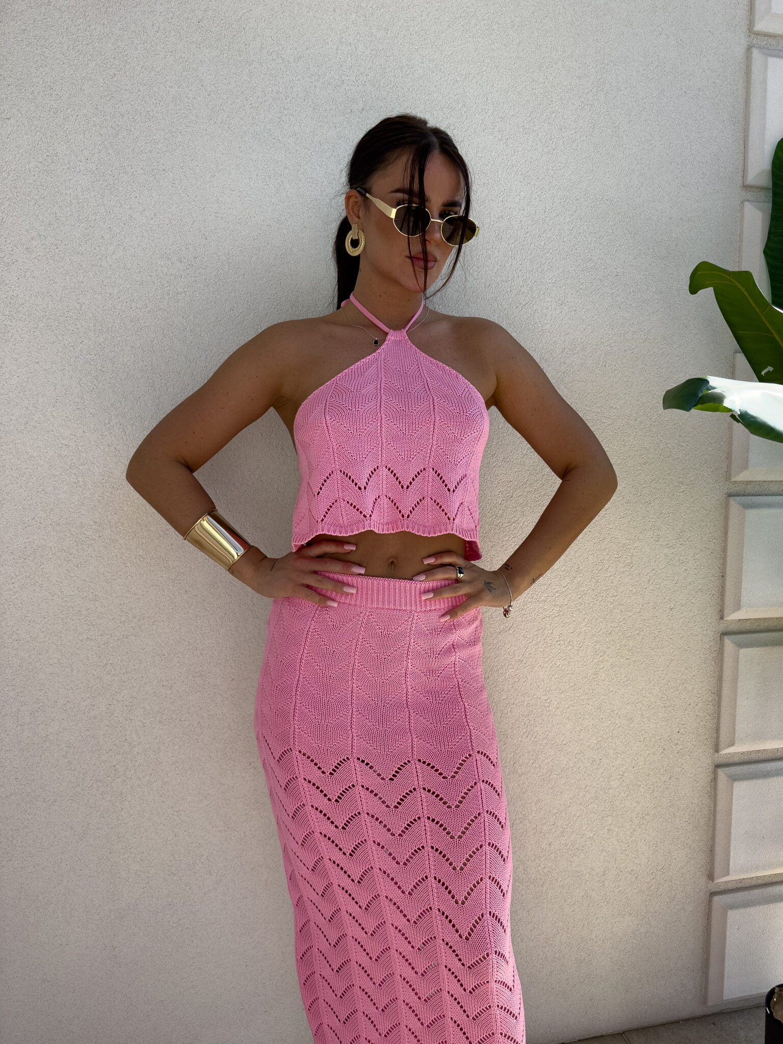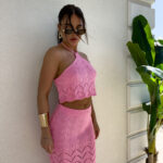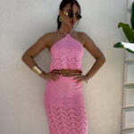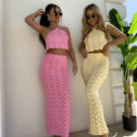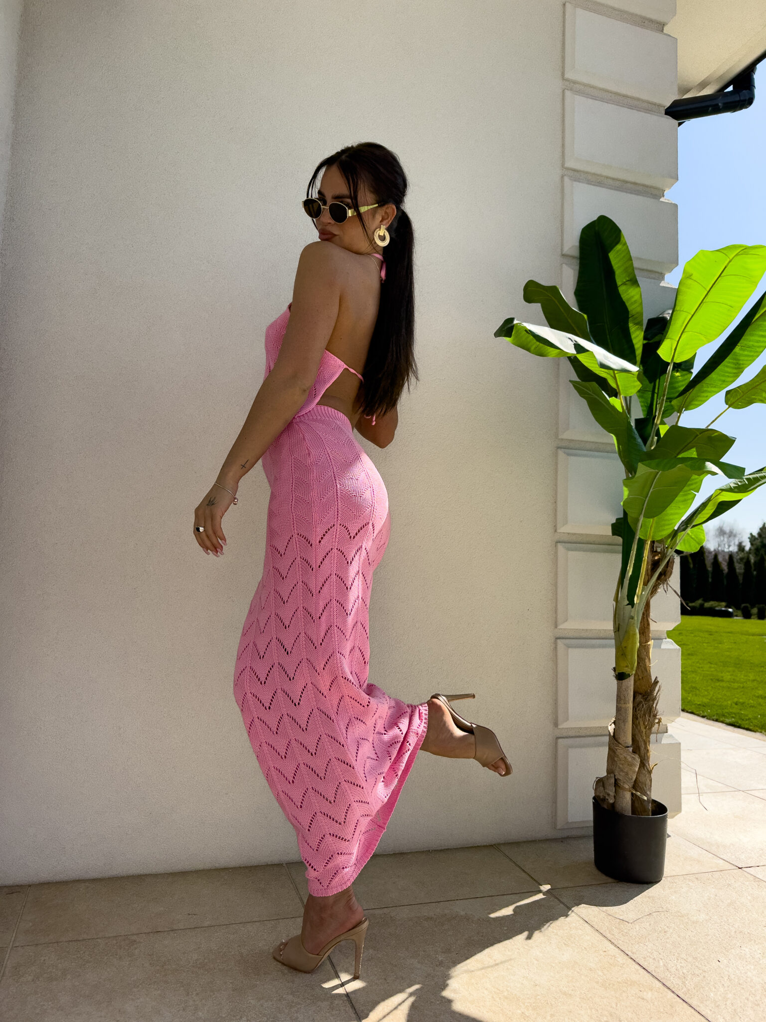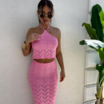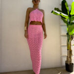 Komplet składający się z topu wiązanego na szyi i plecach oraz spódnicy maxi z gumką w pasie to stylowa i wygodna propozycja na lato. Regulowane wiązania pozwalają idealnie dopasować top do sylwetki. Zwiewna spódnica pięknie układa się na ciele, podkreślając figurę i zapewniając komfort noszenia przez cały dzień.