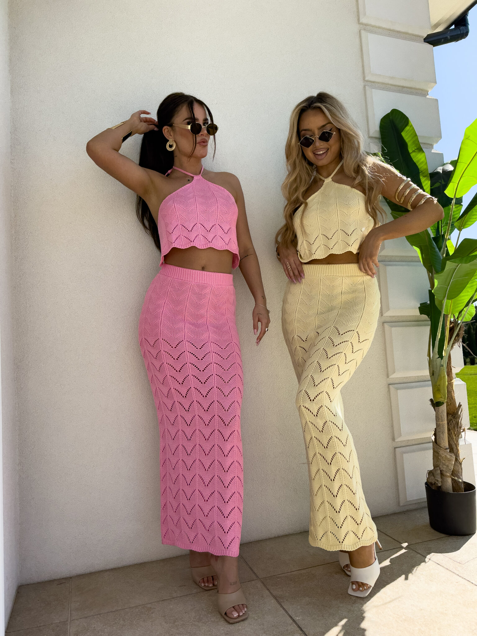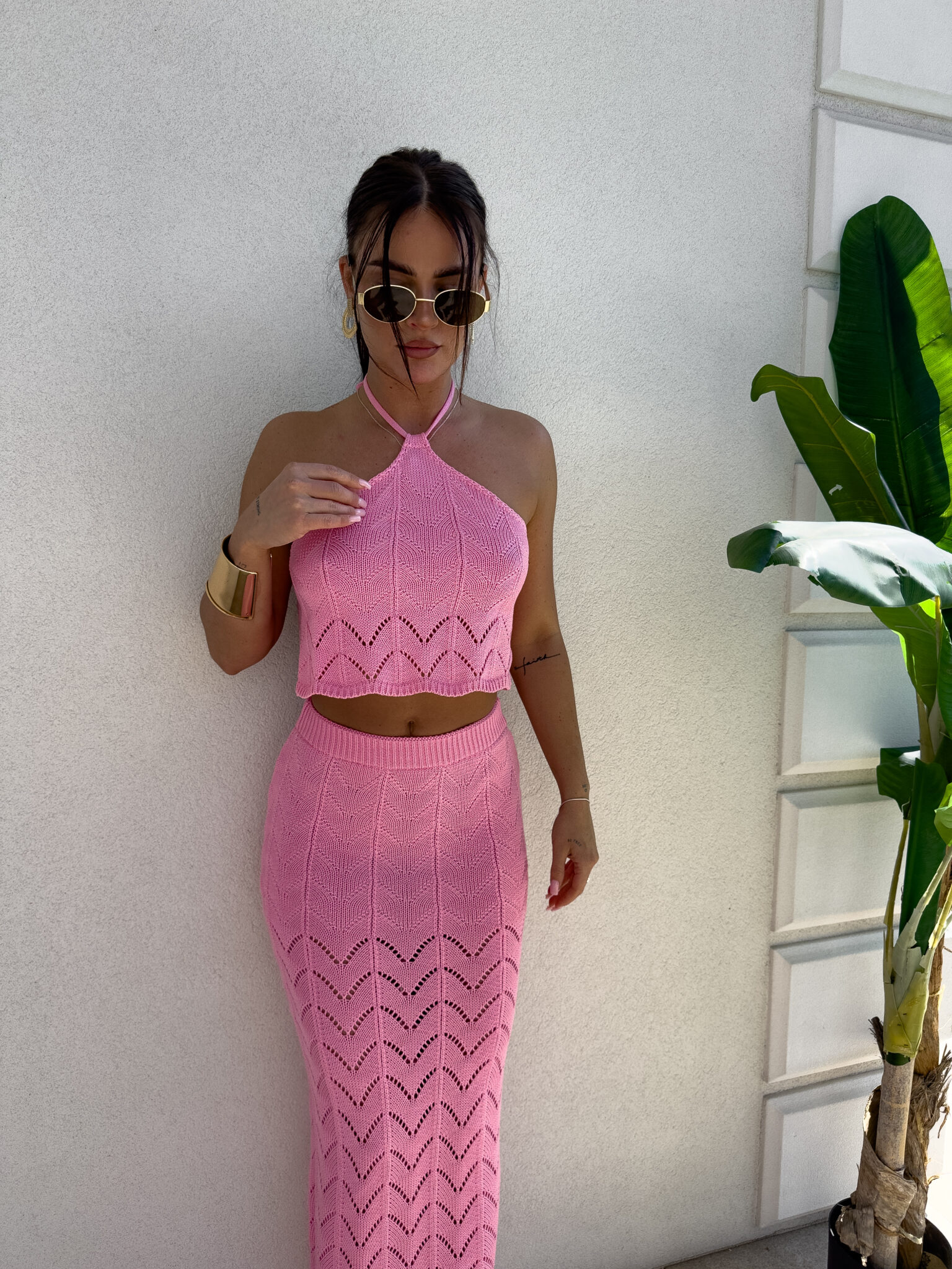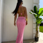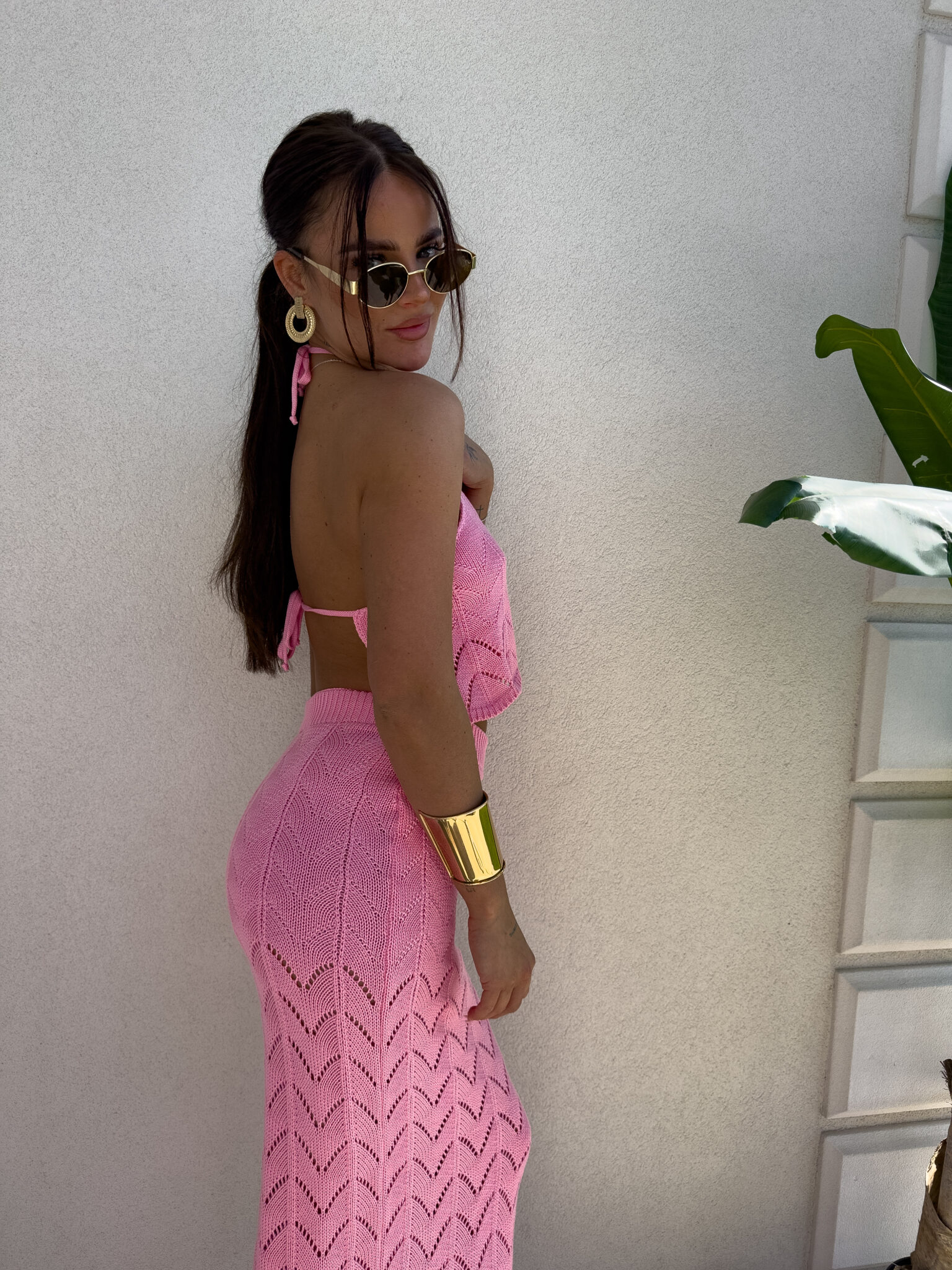 Komplet składający się z topu wiązanego na szyi i plecach oraz spódnicy maxi z gumką w pasie to stylowa i wygodna propozycja na lato. Regulowane wiązania pozwalają idealnie dopasować top do sylwetki. Zwiewna spódnica pięknie układa się na ciele, podkreślając figurę i zapewniając komfort noszenia przez cały dzień.