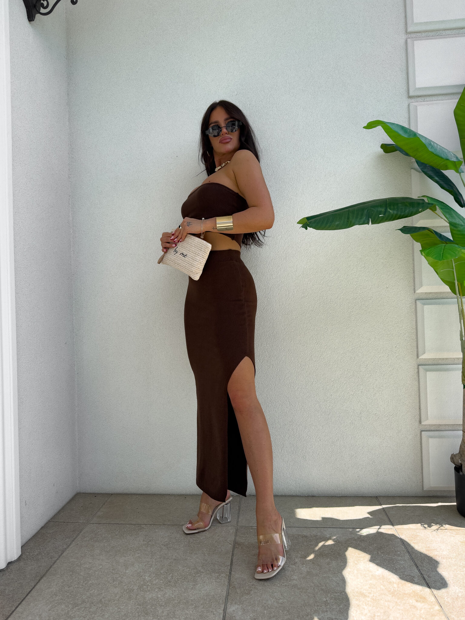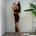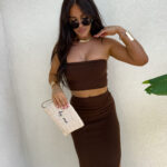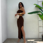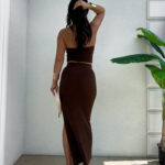 Komplet z elastycznego materiału z dodatkiem kaszmiru składa się z dopasowanego topu typu opaska i długiej spódnicy maxi z efektownym rozcięciem z boku.
