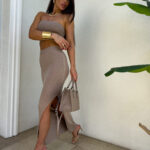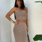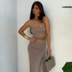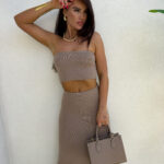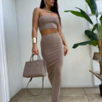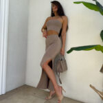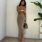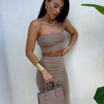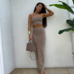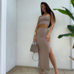 Komplet z elastycznego materiału z dodatkiem kaszmiru składa się z dopasowanego topu typu opaska i długiej spódnicy maxi z efektownym rozcięciem z boku.