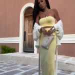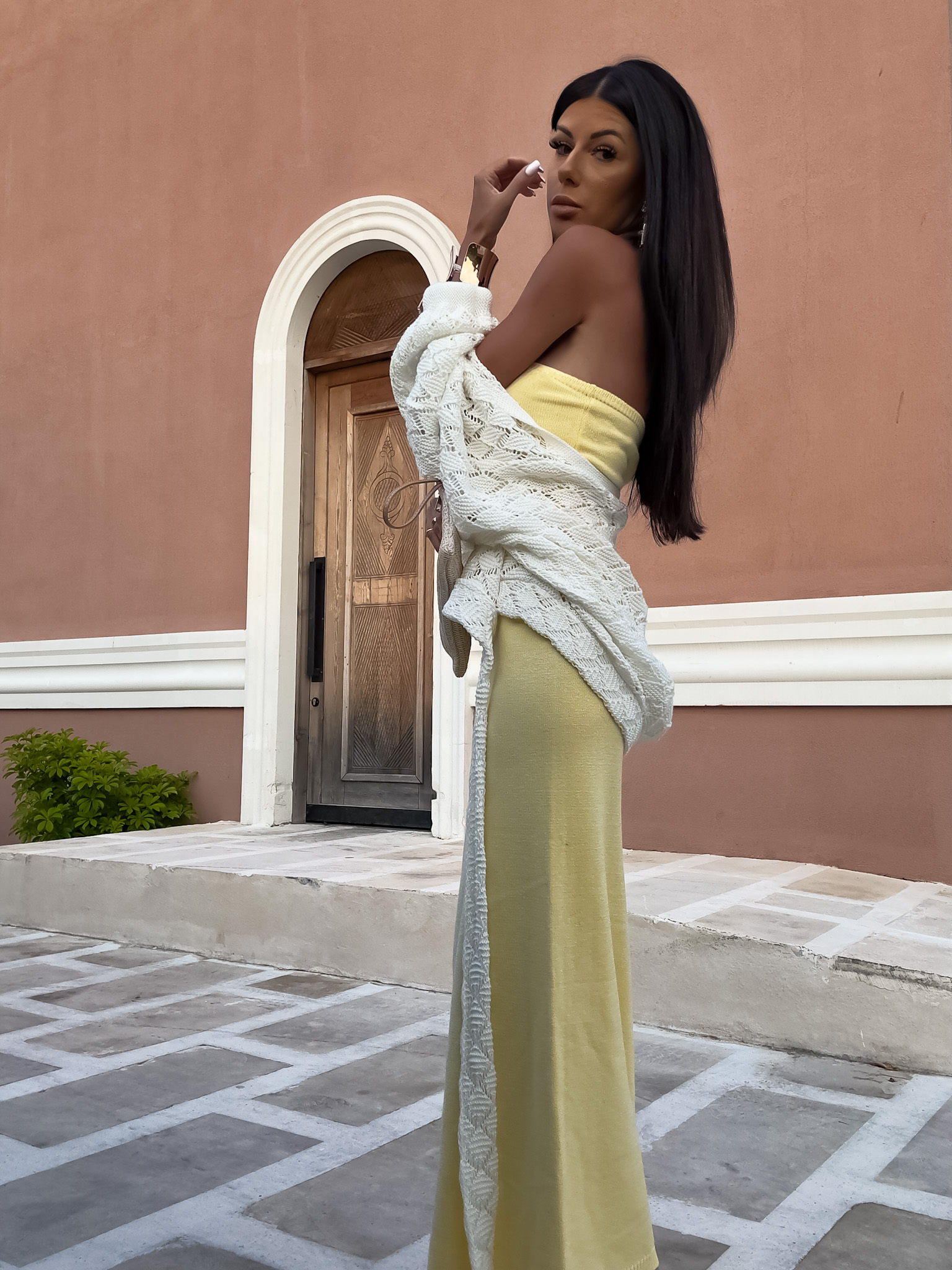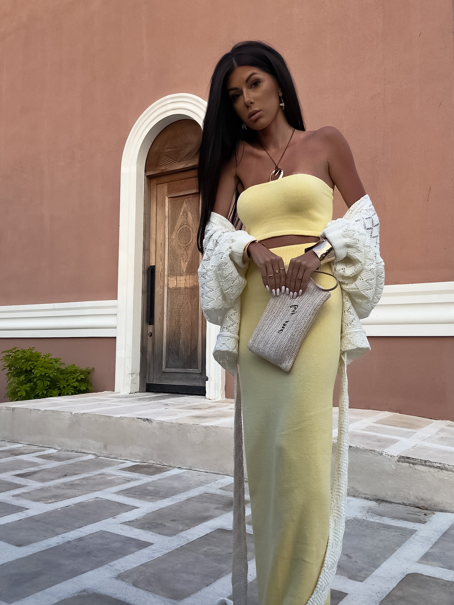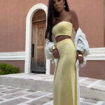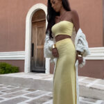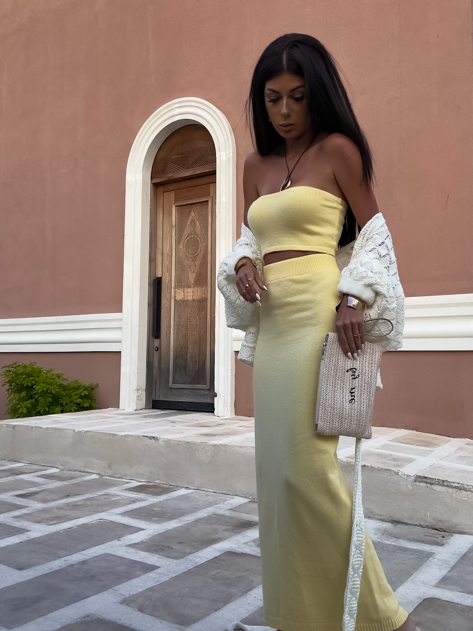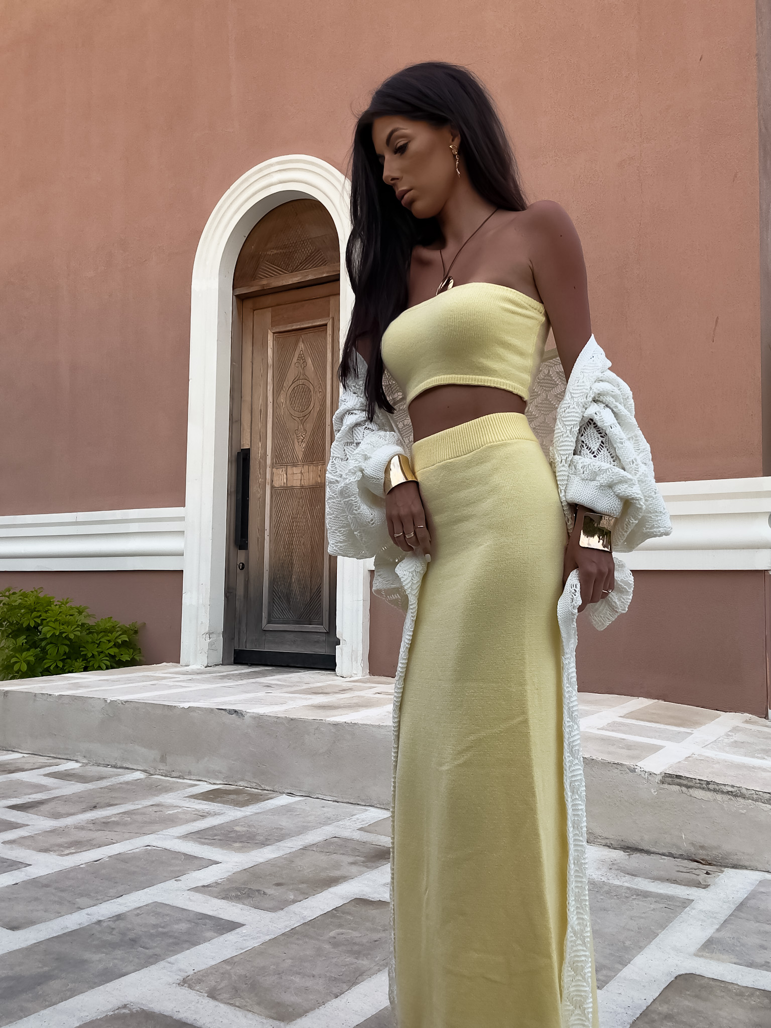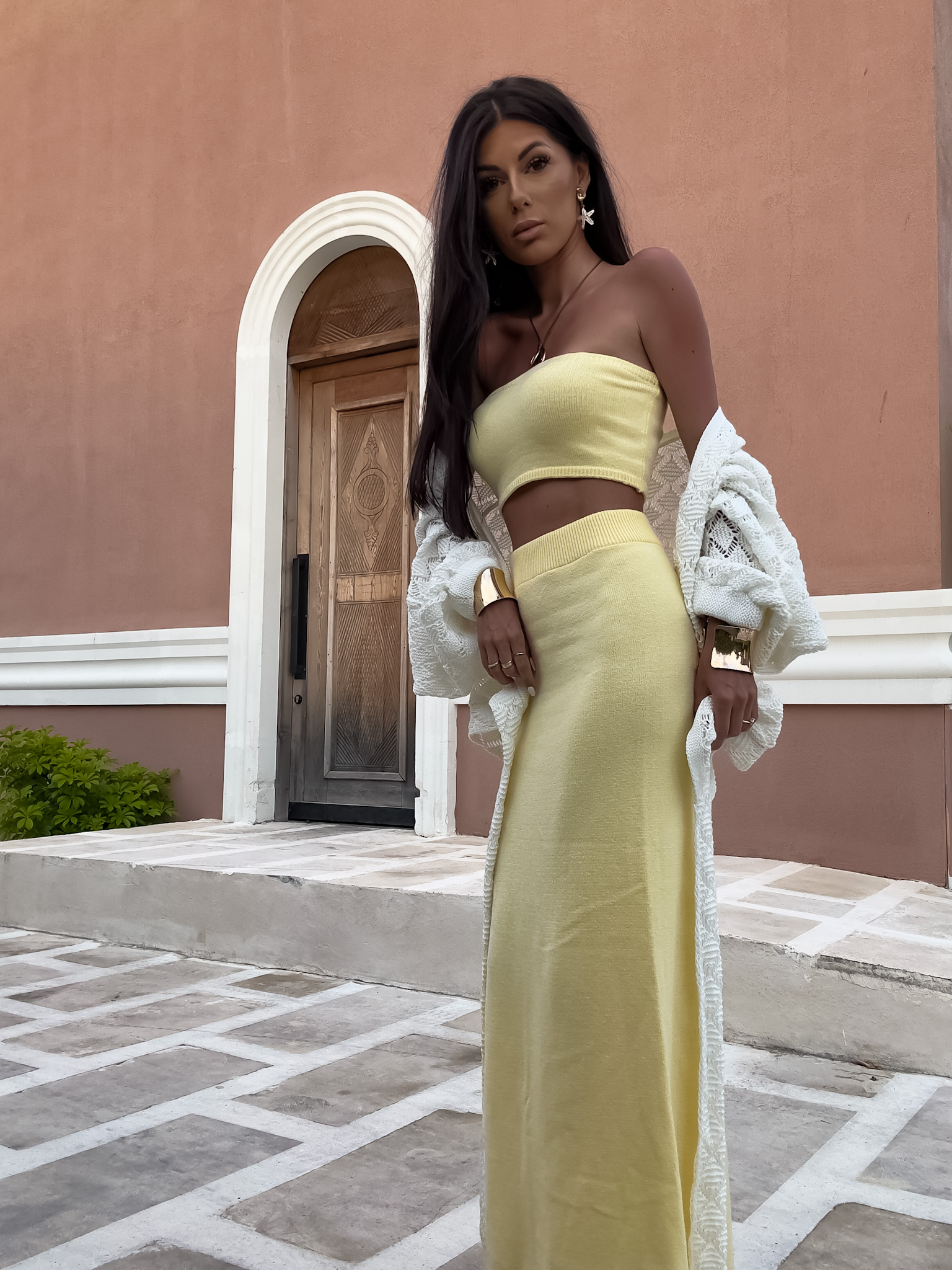 Komplet z elastycznego materiału z dodatkiem kaszmiru składa się z dopasowanego topu typu opaska i długiej spódnicy maxi z efektownym rozcięciem z boku.
