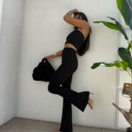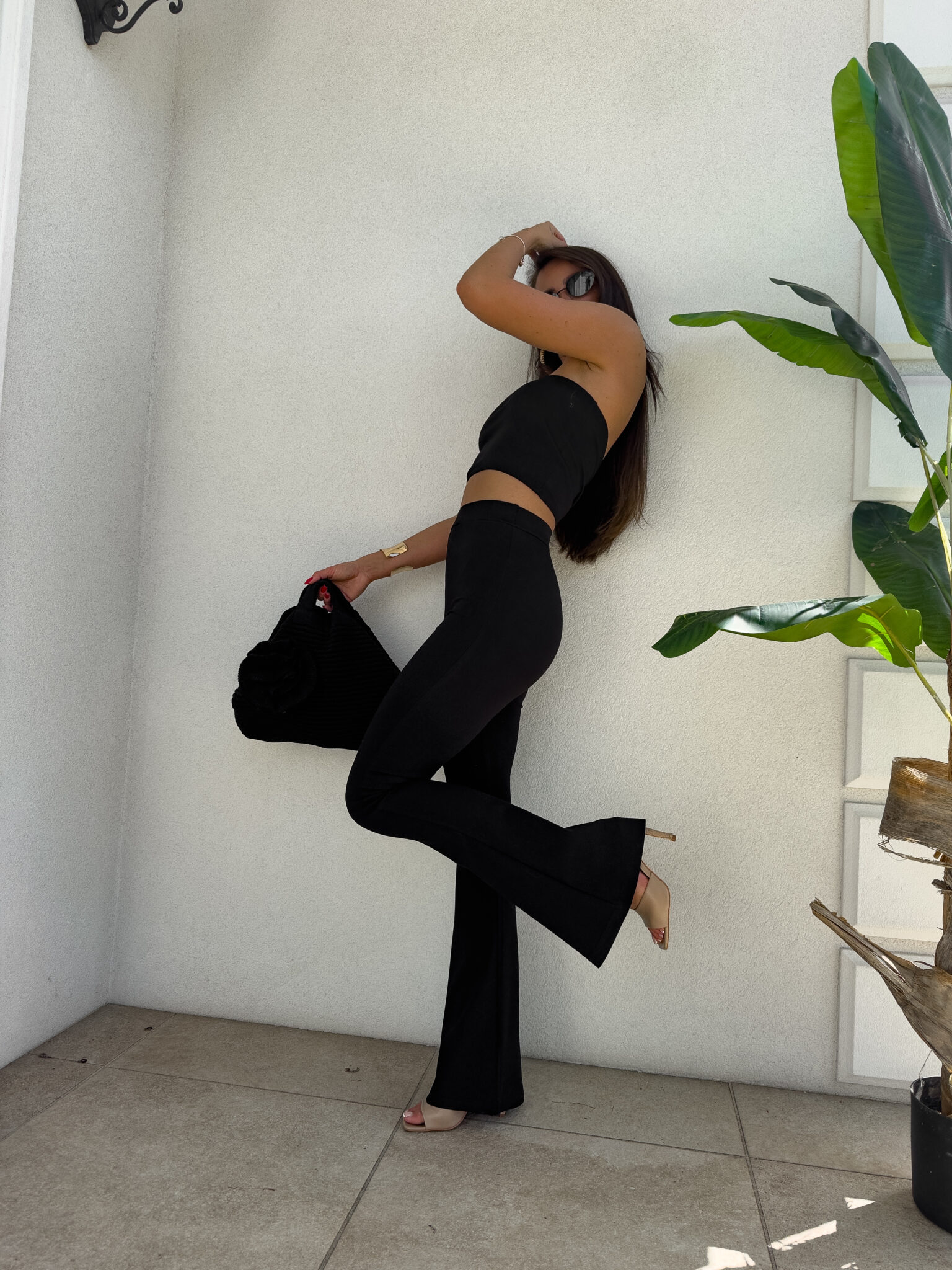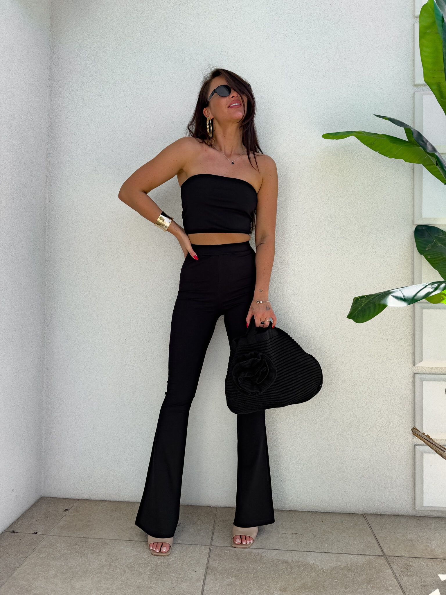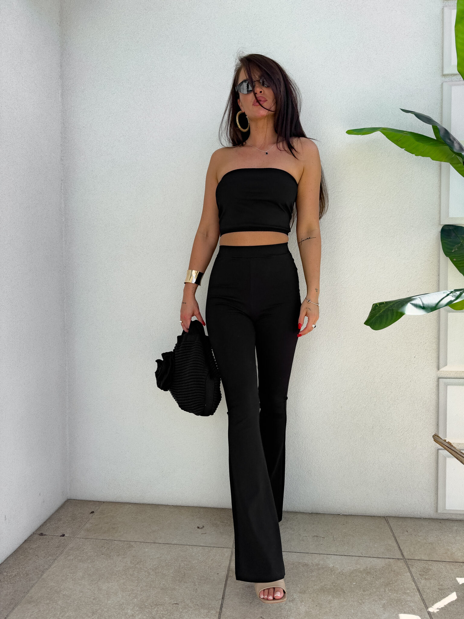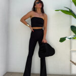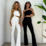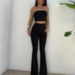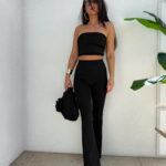 Stylowy komplet składa się z topu bez ramiączek w formie opaski oraz spodni z wysokim stanem. Top wykonany jest z elastycznego materiału, który idealnie dopasowuje się do ciała. Spodnie posiadają gumkę w pasie, zapewniając wygodę i świetne dopasowanie.