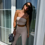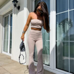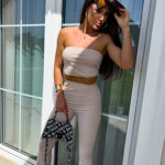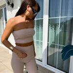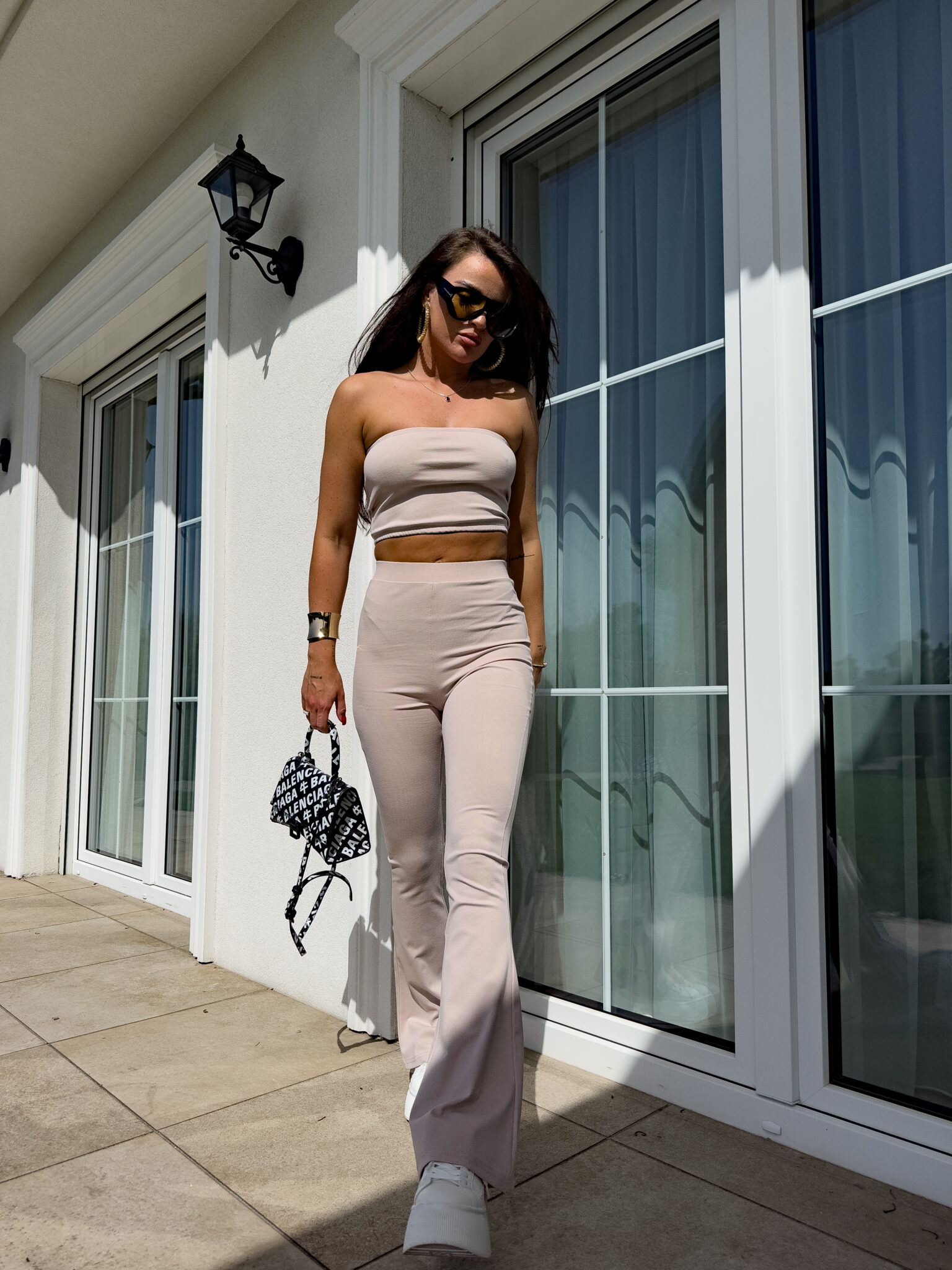 Stylowy komplet składa się z topu bez ramiączek w formie opaski oraz spodni z wysokim stanem. Top wykonany jest z elastycznego materiału, który idealnie dopasowuje się do ciała. Spodnie posiadają gumkę w pasie, zapewniając wygodę i świetne dopasowanie.