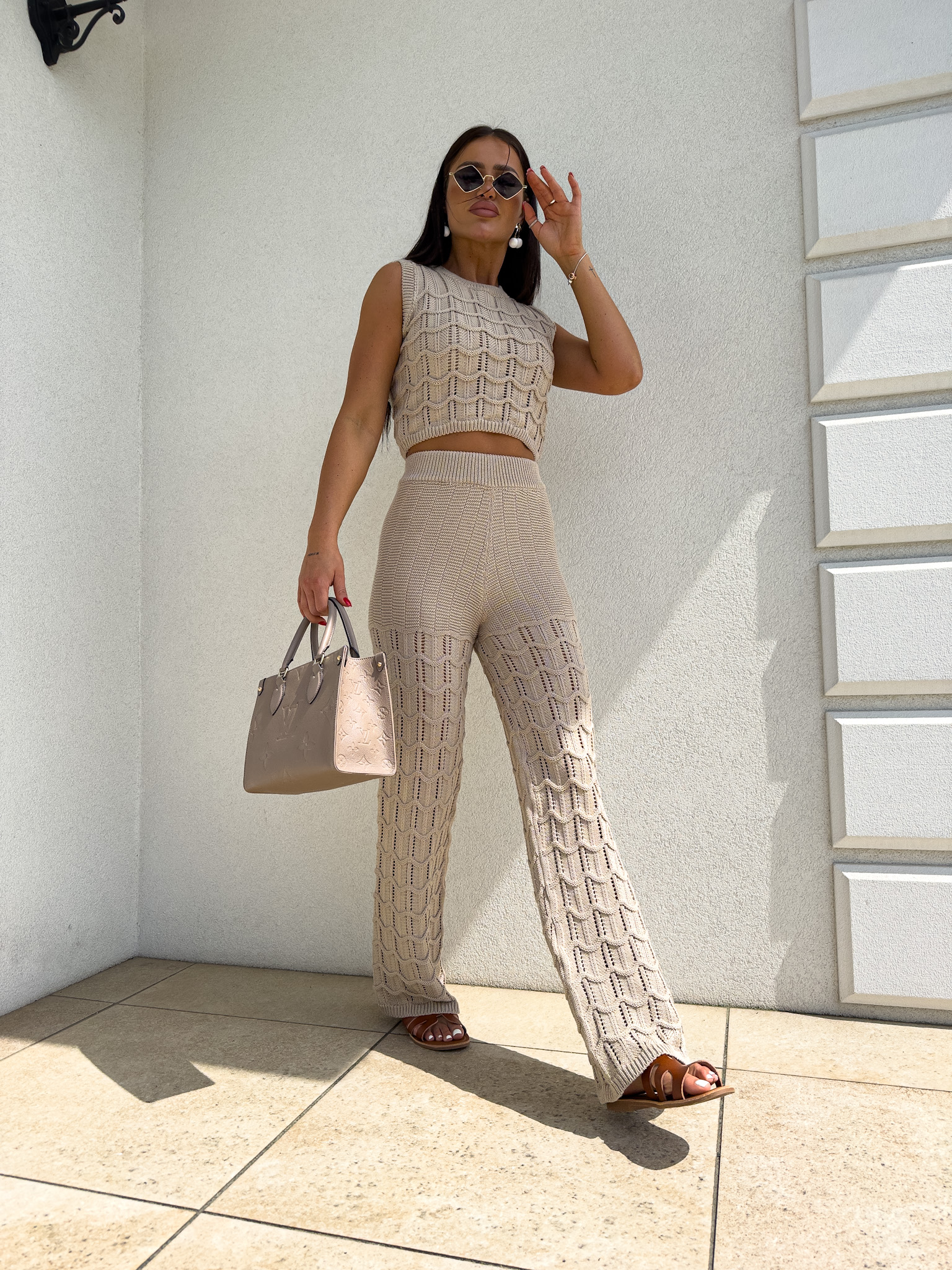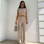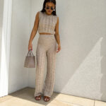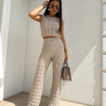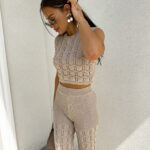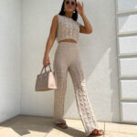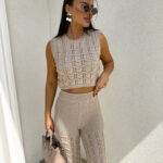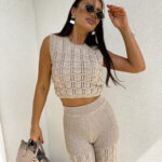 Komplet ażurowy z topem i spodniami z gumką w pasie to świetna propozycja na ciepłe dni. Delikatny wzór topu dodaje lekkości i subtelności, a miękki materiał zapewnia komfort i przewiewność. Spodnie z elastyczną gumką idealnie dopasowują się do sylwetki, gwarantując wygodę noszenia.