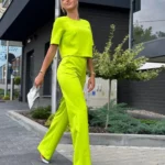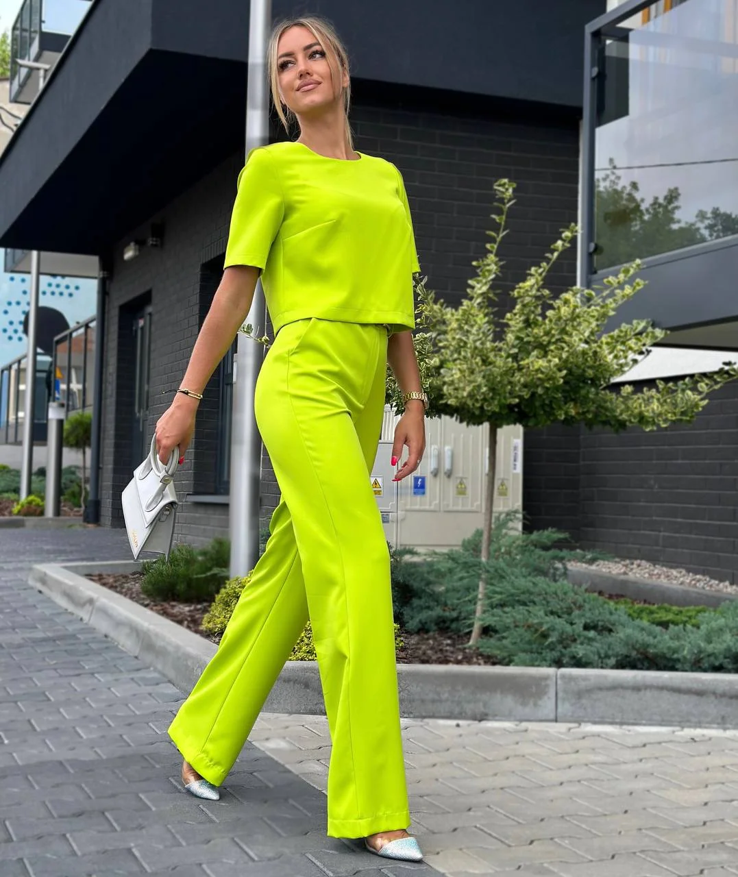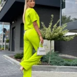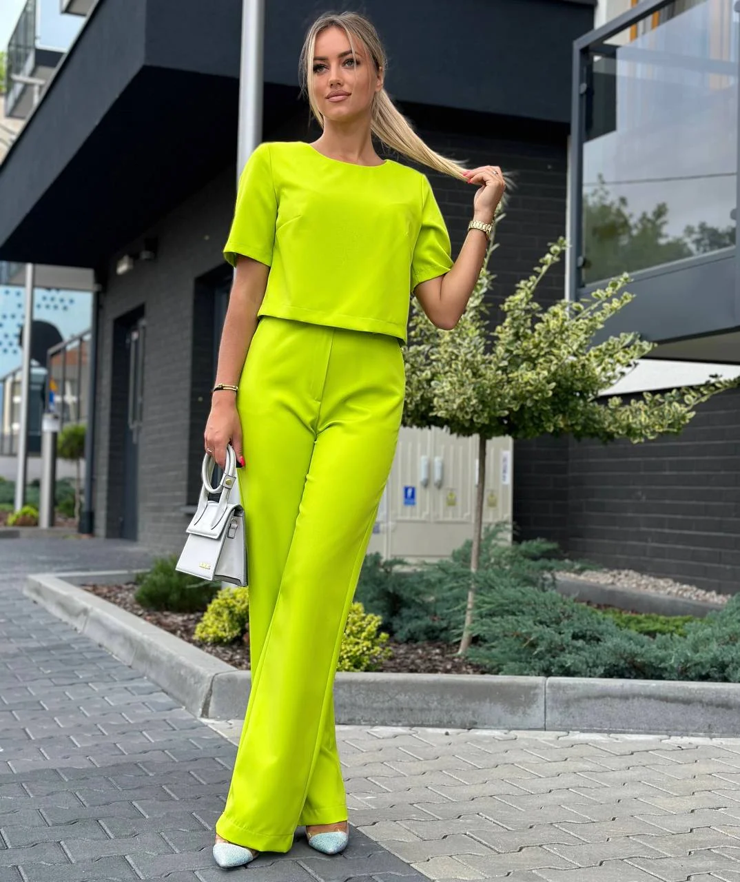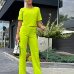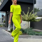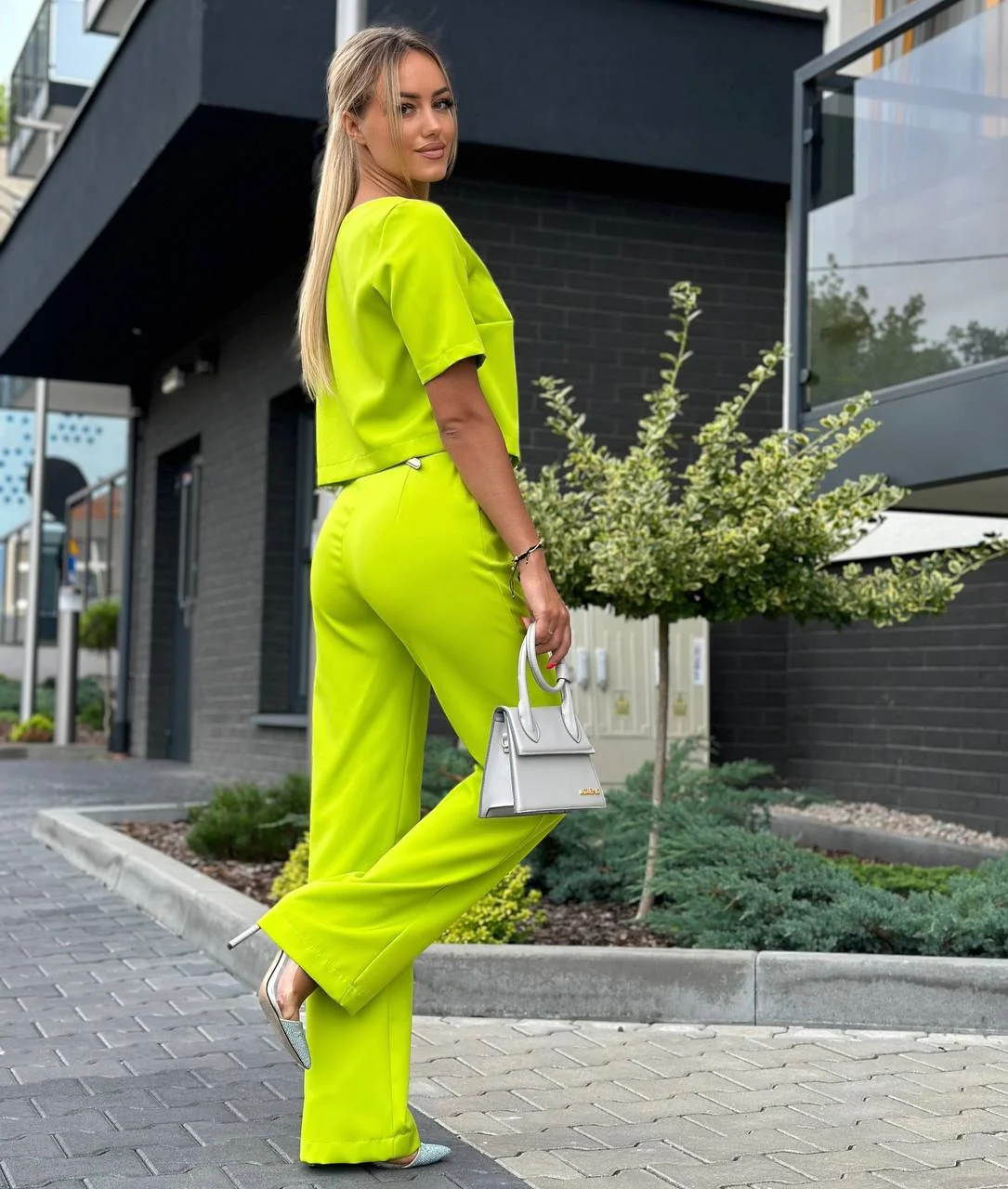 Komplet składa się z krótkiej, oversize’owej bluzki oraz spodni z wysokim stanem. Spodnie zapinane są na zamek i guzik, posiadają boczne kieszenie i rozszerzane nogawki.